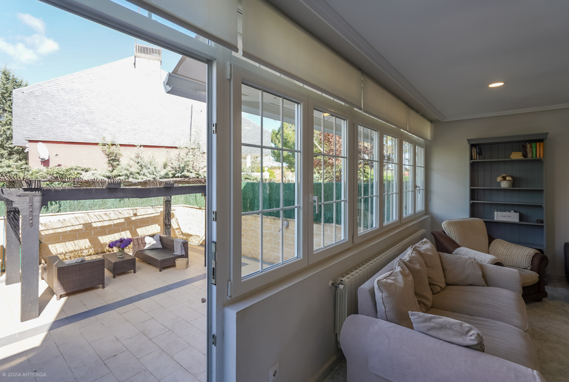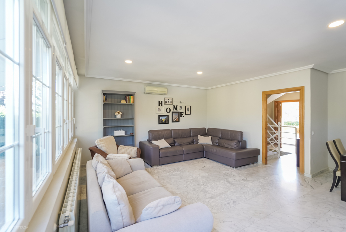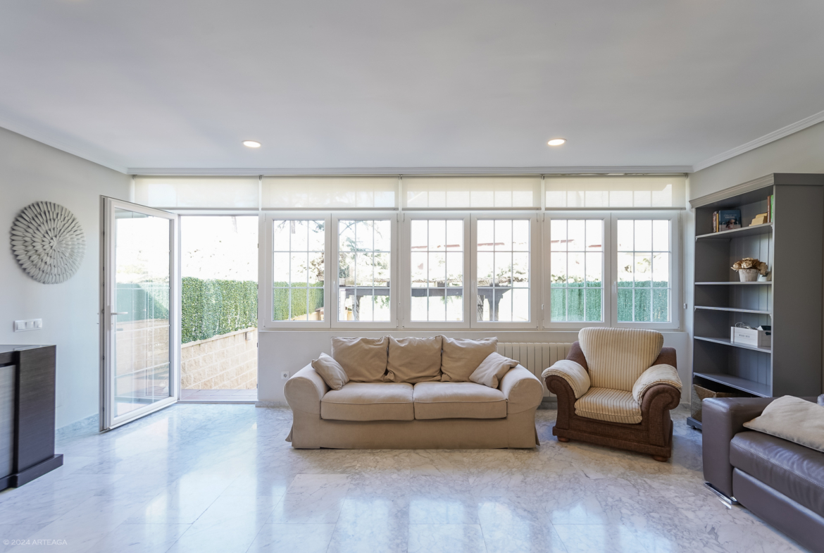 Planta Sótano: Garaje con espacio para dos coches y acceso directo a la vivienda. En esta planta encontramos además una sala de 25 m2 con chimenea y luz natural a la que puede darse distintos usos (segundo salón, sala de juegos, despacho, habitación, gimnasio?.). En esta planta disponemos además de otro aseo.