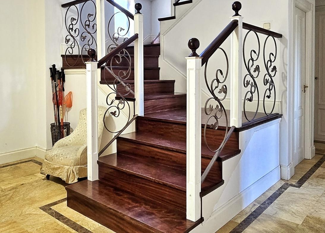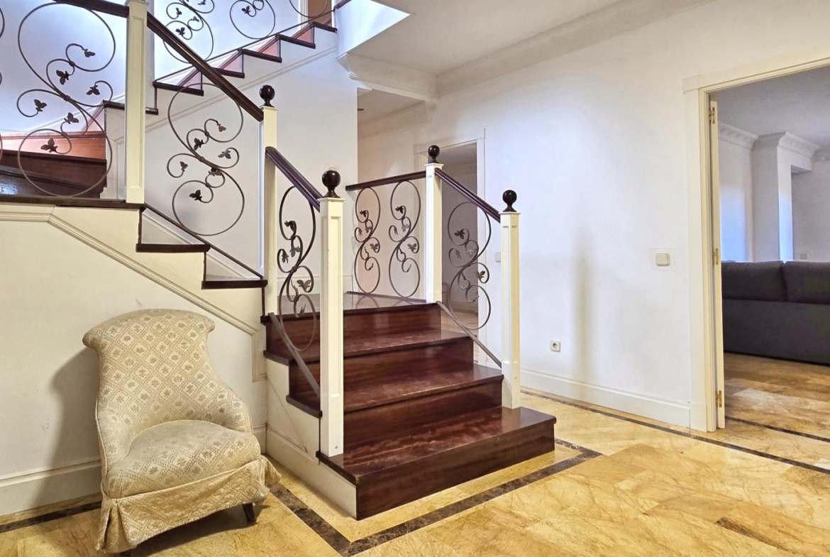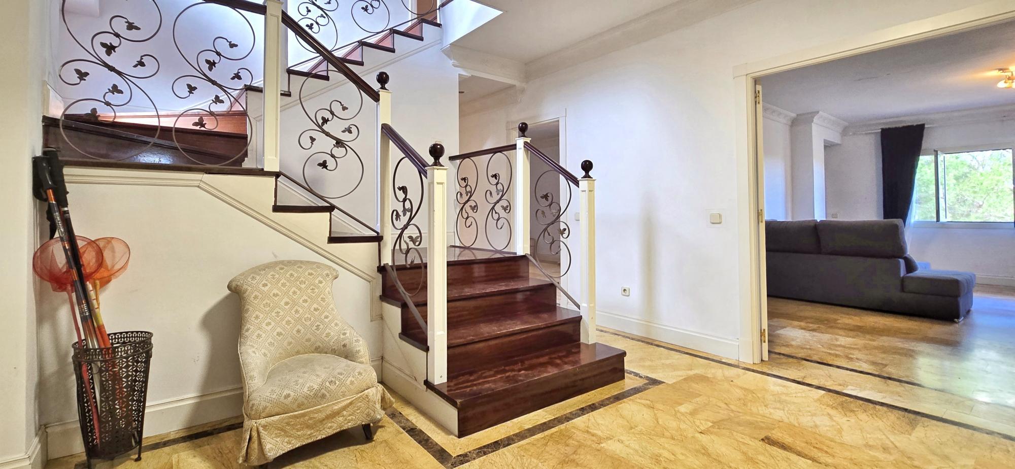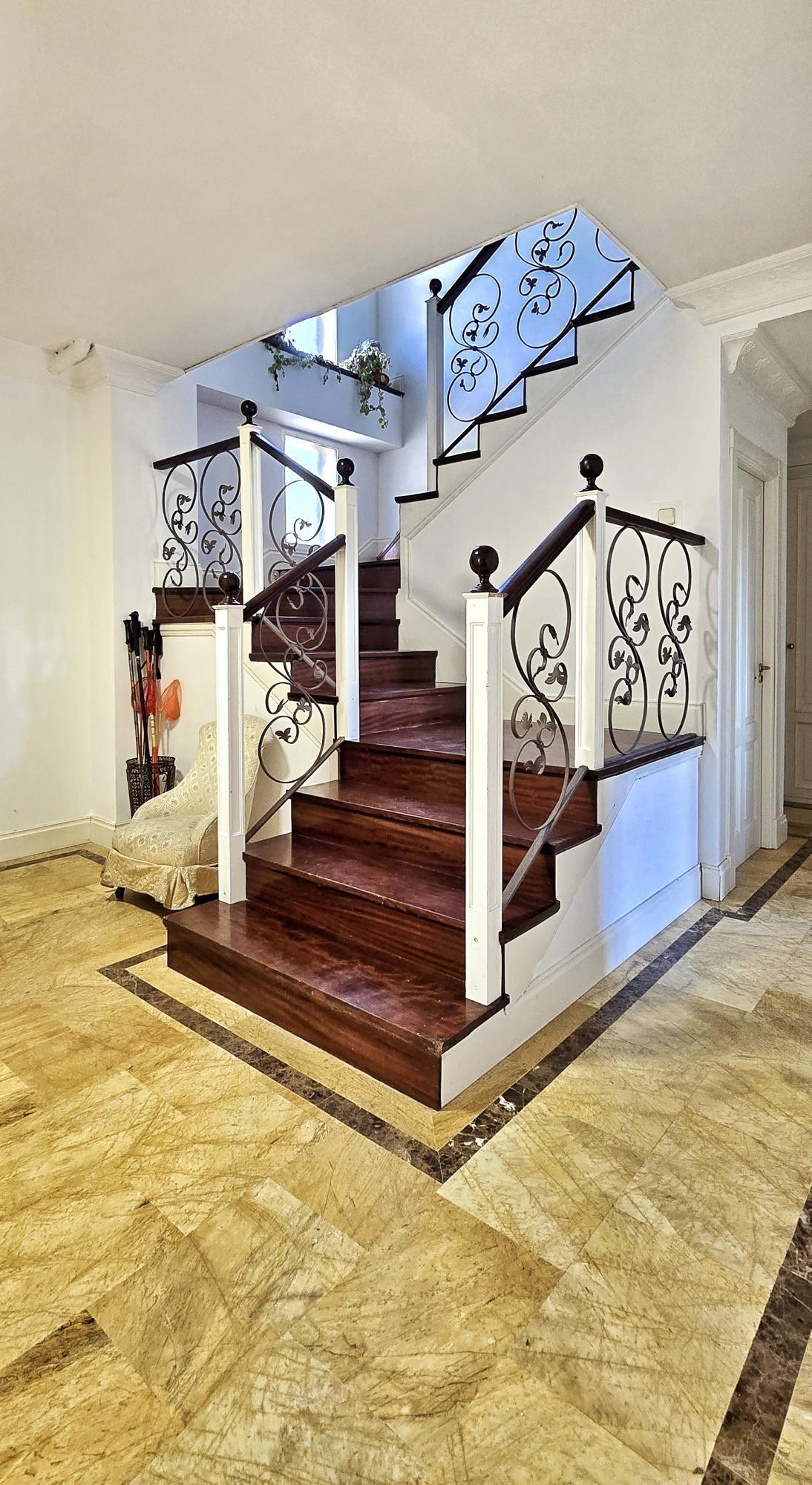 – Amplio vestíbulo en el que destaca una escalera con barandilla de madera y forja. Tres salones en línea? (total 61 m2) , todos con salida a la gran Terraza (con vistas despejadas y unas dimensiones aproximadas de 64m2) y uno de ellos con chimenea. El salón que hace las veces de comedor tiene comunicación directa con la gran cocina (21 m2) que, a su vez, tiene zona de office de diario. Un aseo de cortesía.