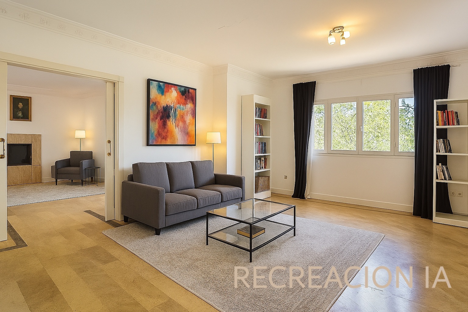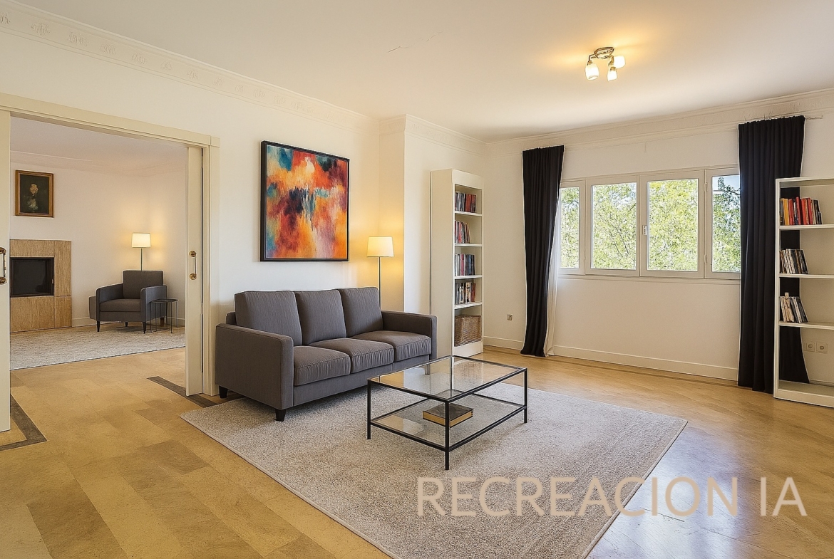 – Sala a modo de distribuidor (16m2) con uso actual como despacho. Cuatro Dormitorios con armarios empotrados, dos de ellos con Baño en Suite (destaca por sus dimensiones y ventanal con vistas el dormitorio principal, de unos 28m2). Se complementa con otro baño que da servicio a los 2 dormitorios sin baño en Suite.