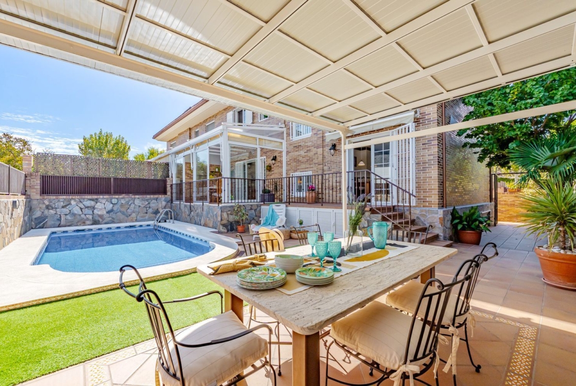 El JARDÍN de 100 m² que rodea la casa cuenta con PISCINA salina de 23 m², zona de almacenaje bajo la terraza y pérgola exterior con tejado sándwich y aislamiento térmico, perfecta para cenas al aire libre.