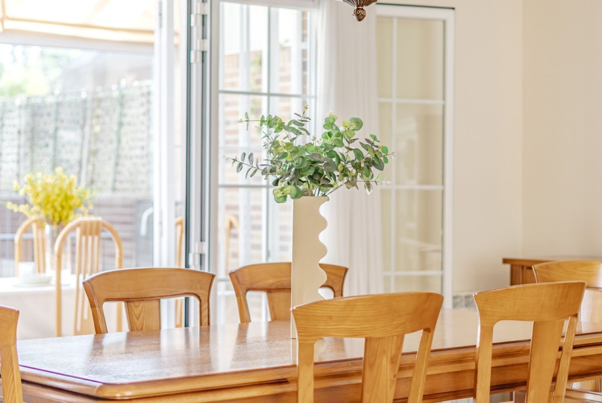 Desde el SALÓN se accede a un PORCHE ACRISTALADO de 15 m², también accesible desde la TERRAZA de 6 m² junto a la cocina. Totalmente cerrado y abatible, con puertas correderas y toldo eléctrico.