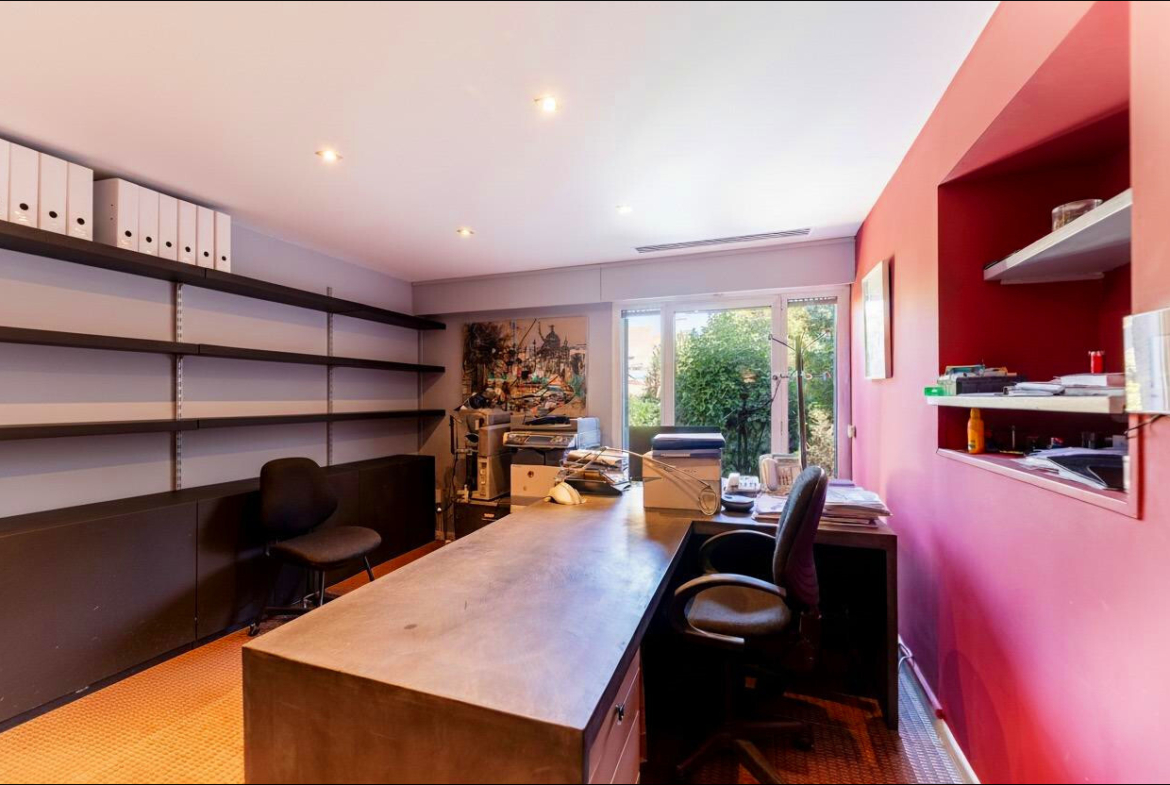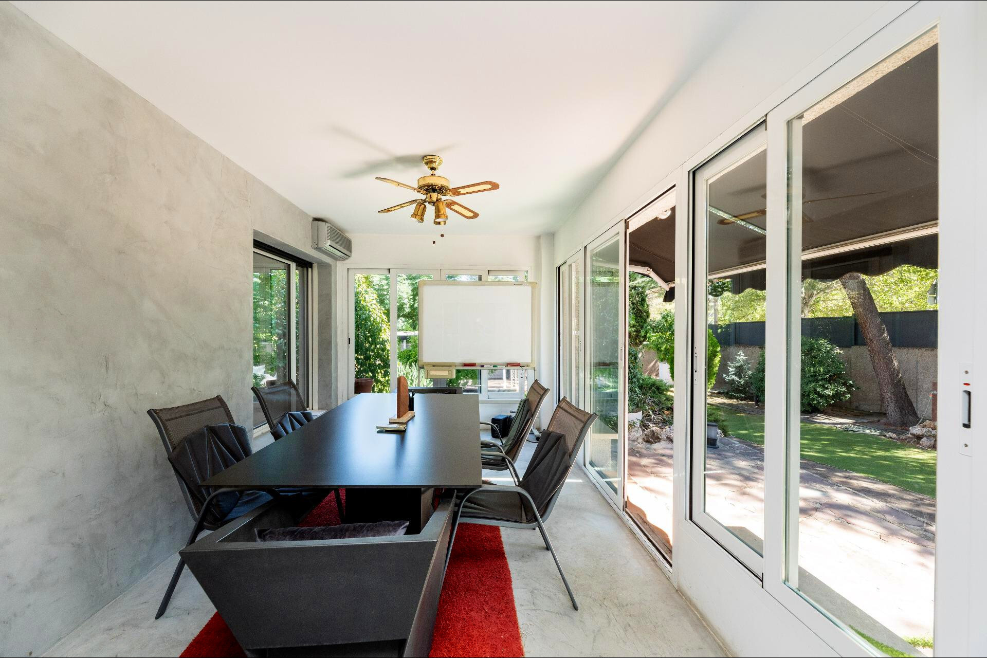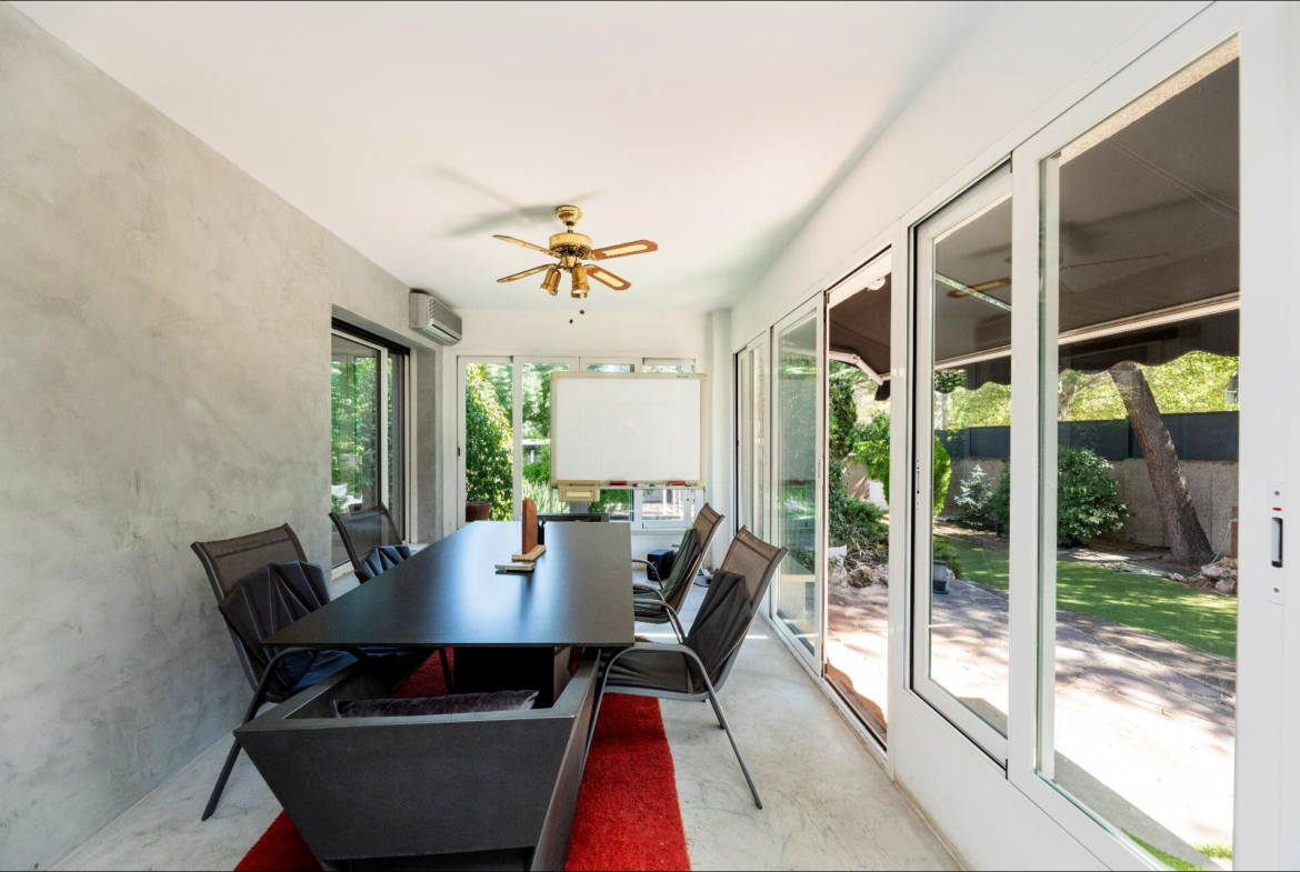 La entrada principal conduce a un hall que da paso a un salón acristalado orientado al sureste, muy luminoso, y a un despacho de buen tamaño con vistas a la piscina. La cocina, pensada para el día a día, se divide en tres ambientes: zona de cocinado, comedor y amplia despensa con sala de plancha.