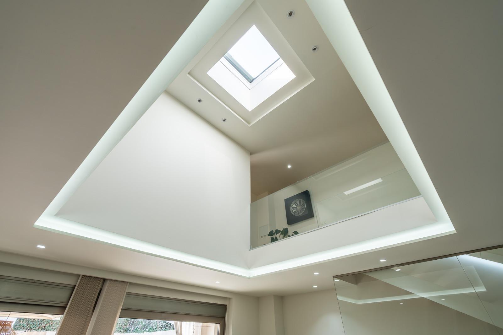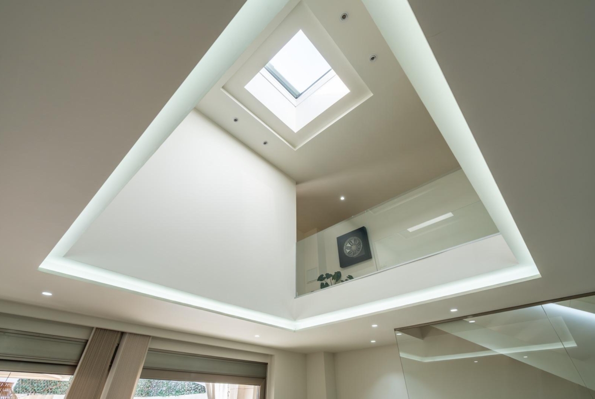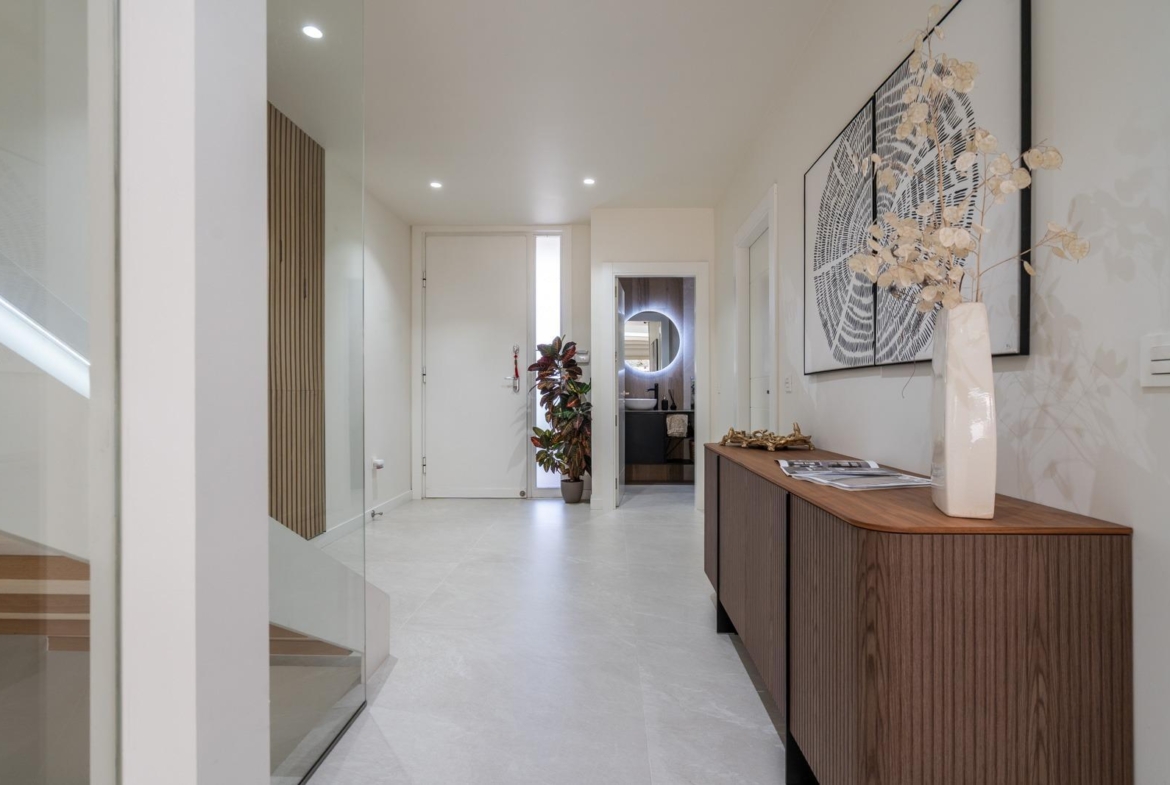 En cuanto a eficiencia energética, esta vivienda ofrece una instalación de placas solares en cubierta con 5 kW de potencia, así como un sistema de aerotermia Daikin Altherma 3 que alimenta el suelo radiante y refrescante en todas las estancias. El suelo porcelánico de gran formato marca Inalco refuerza la sensación de modernidad y elegancia, presente en toda la casa, y las paredes y techos están acabados con pintura mate lavable de máxima calidad Valentine Valon Clean.