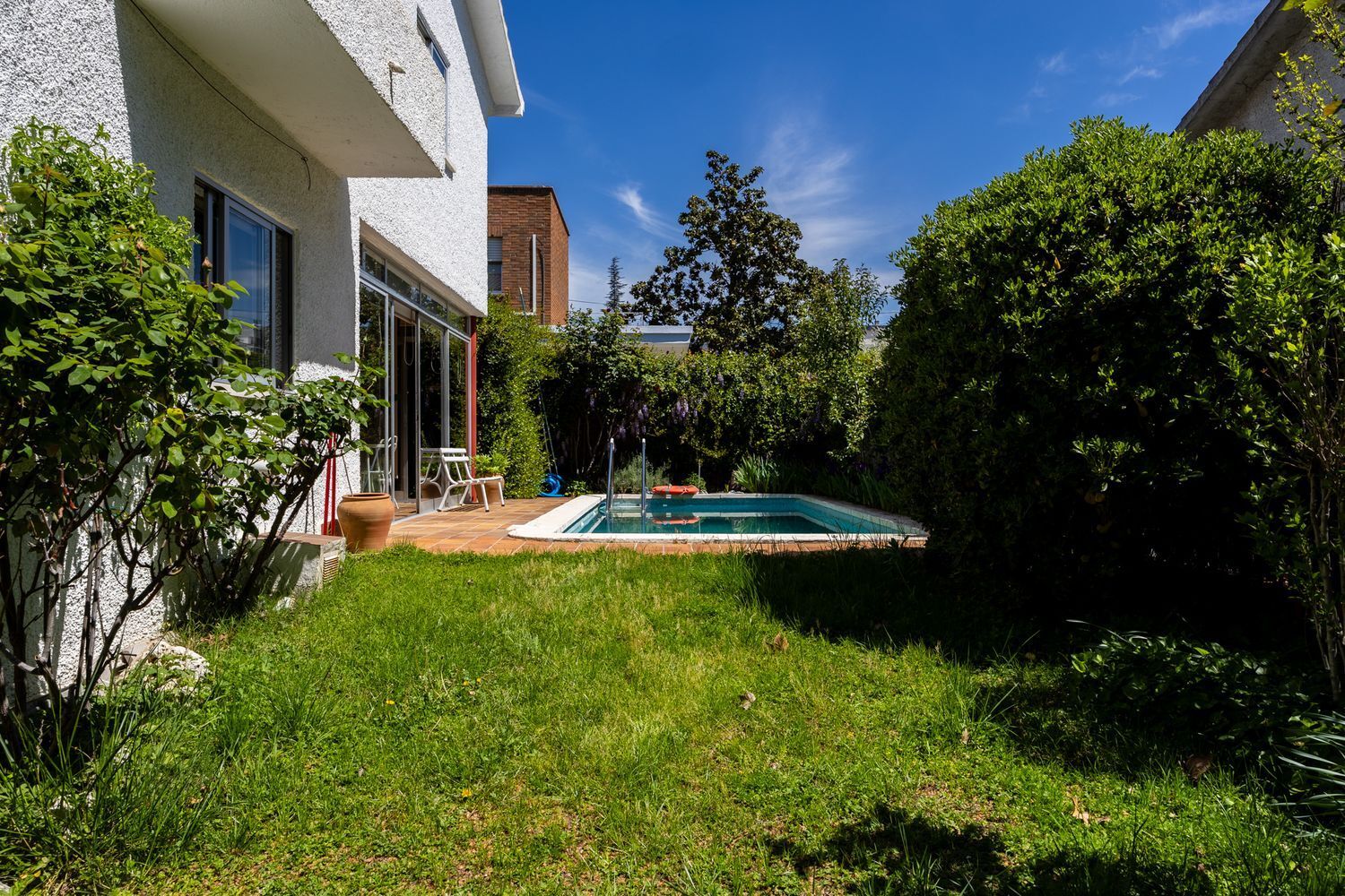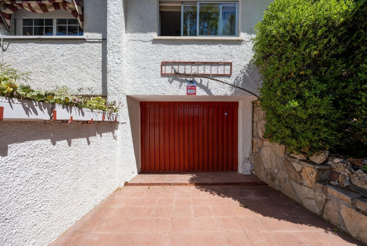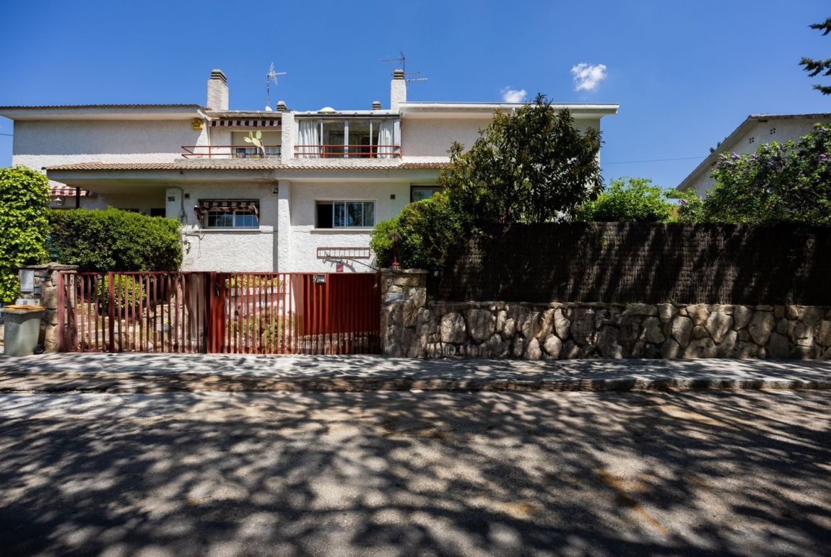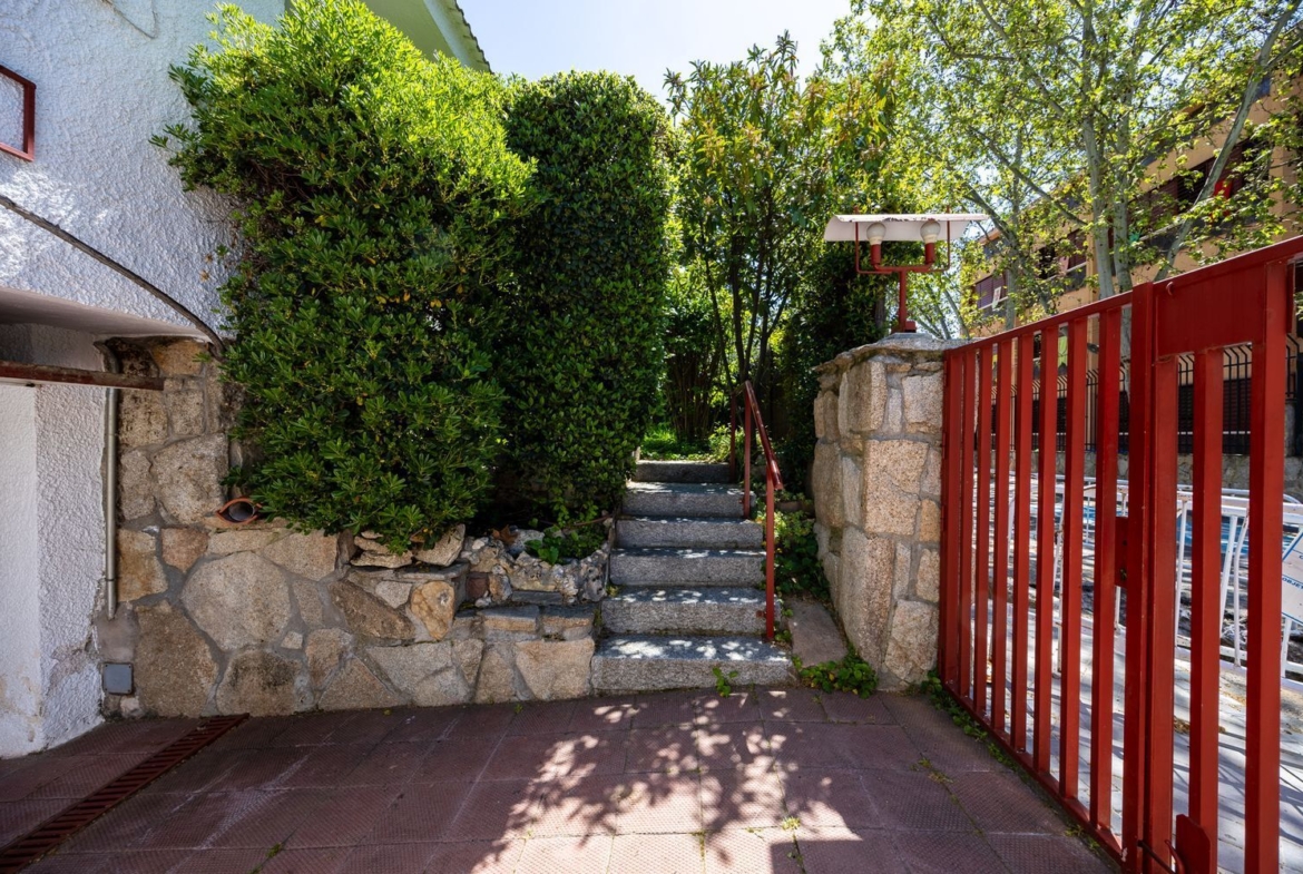 Esta vivienda se encuentra adosada al lado izquierdo de la parcela según se mira desde la calle de su entrada. En el lado derecho están los accesos a la casa y una zona ajardinada con césped y algunos árboles y arbustos que desembocan en la zona más soleada del jardín, donde se encuentra la piscina, dando al este y con salida directa desde un porche que da al corazón del hogar; el salón. En la parte de atrás, dando al norte, nos encontramos con un patio solado ideal para tender o guardar macetas.