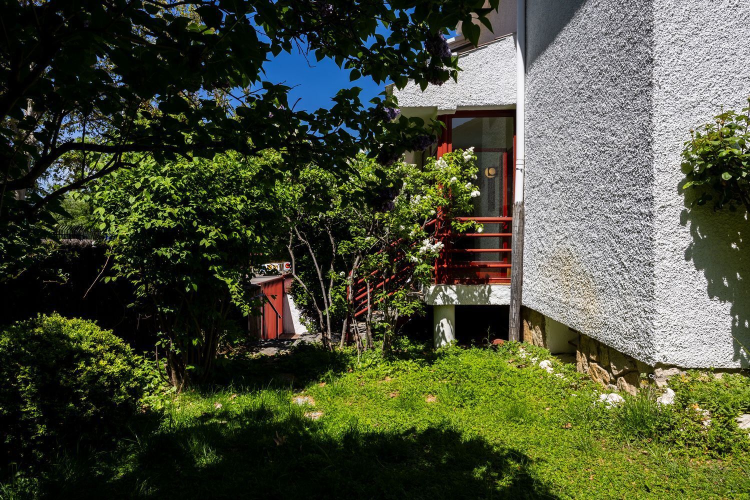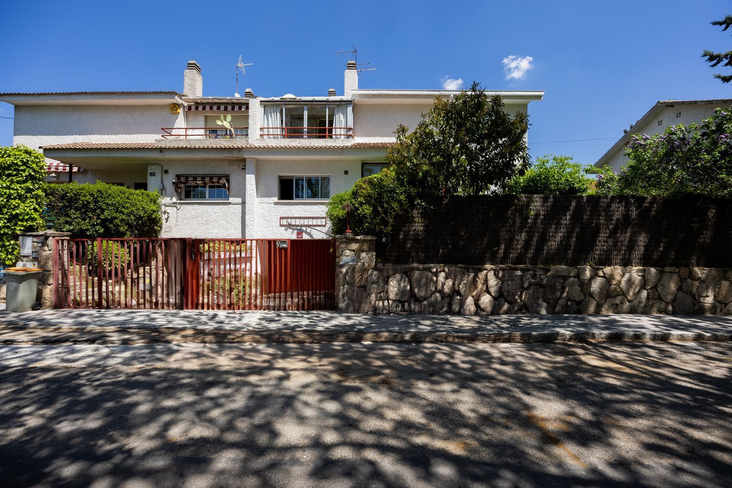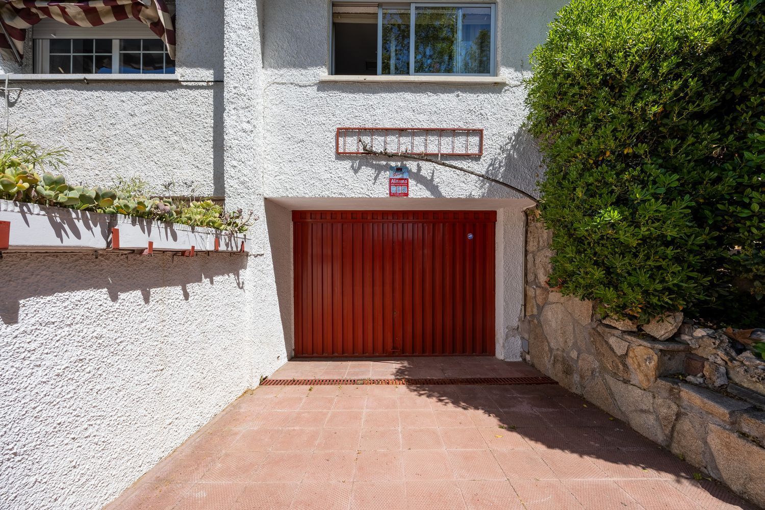Esta vivienda se encuentra adosada al lado izquierdo de la parcela según se mira desde la calle de su entrada. En el lado derecho están los accesos a la casa y una zona ajardinada con césped y algunos árboles y arbustos que desembocan en la zona más soleada del jardín, donde se encuentra la piscina, dando al este y con salida directa desde un porche que da al corazón del hogar; el salón. En la parte de atrás, dando al norte, nos encontramos con un patio solado ideal para tender o guardar macetas.