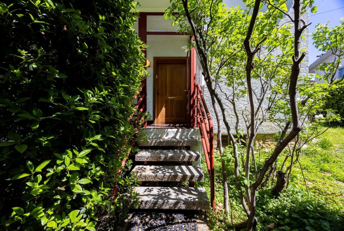 A la planta baja de la vivienda se llega desde la calle utilizando una escalera con nueve escalones que terminan en un pequeño porche acristalado con dos entradas; principal y de servicio. En esta planta se sitúan el hall, con la escalera para ascender a la planta alta, el estudio, un espléndido salón-comedor con chimenea, la cocina grande y con office y un aseo.
