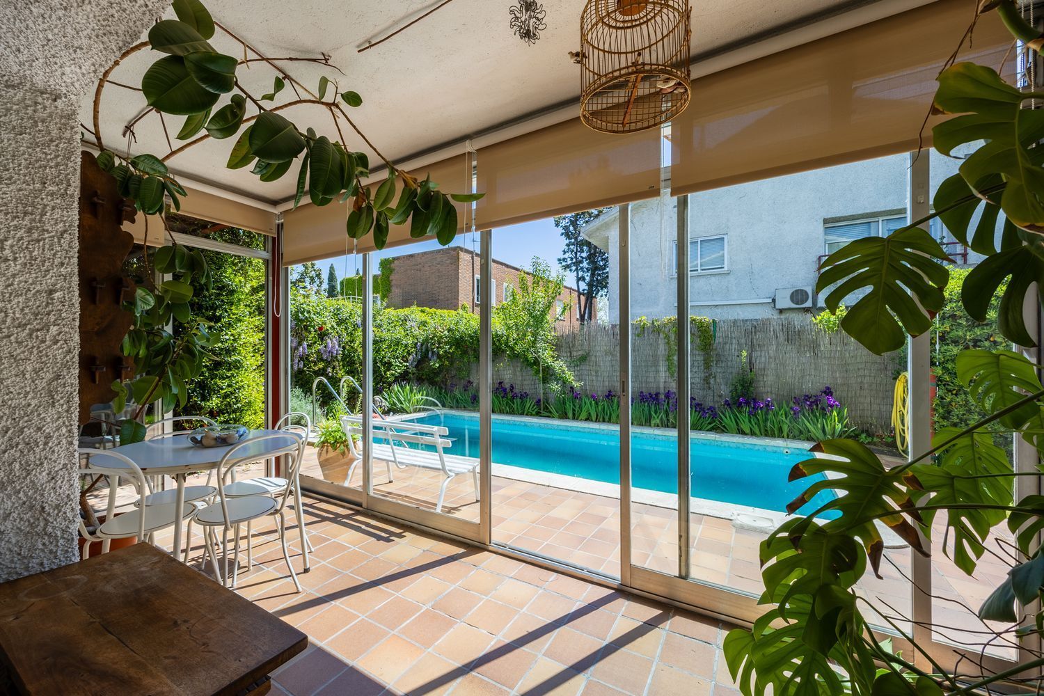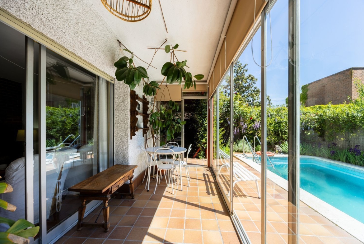 Dispone de una terraza acristalada que mira a la fachada principal, con orientación sur, a la que se llega a través de uno de los dormitorios. Hay otra terracita más estrecha, con vistas a la piscina, a la que se accede desde otros dos dormitorios.