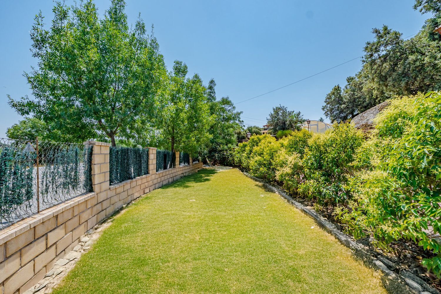 Accediendo desde la puerta peatonal de la parcela, a la derecha disponemos de zona de jardín enorme, a la izquierda subida a la zona de piscina y rocas simulando la montaña, y al fondo, pasada la vivienda, caseta de jardín y zona de barbacoa de grandes dimensiones.