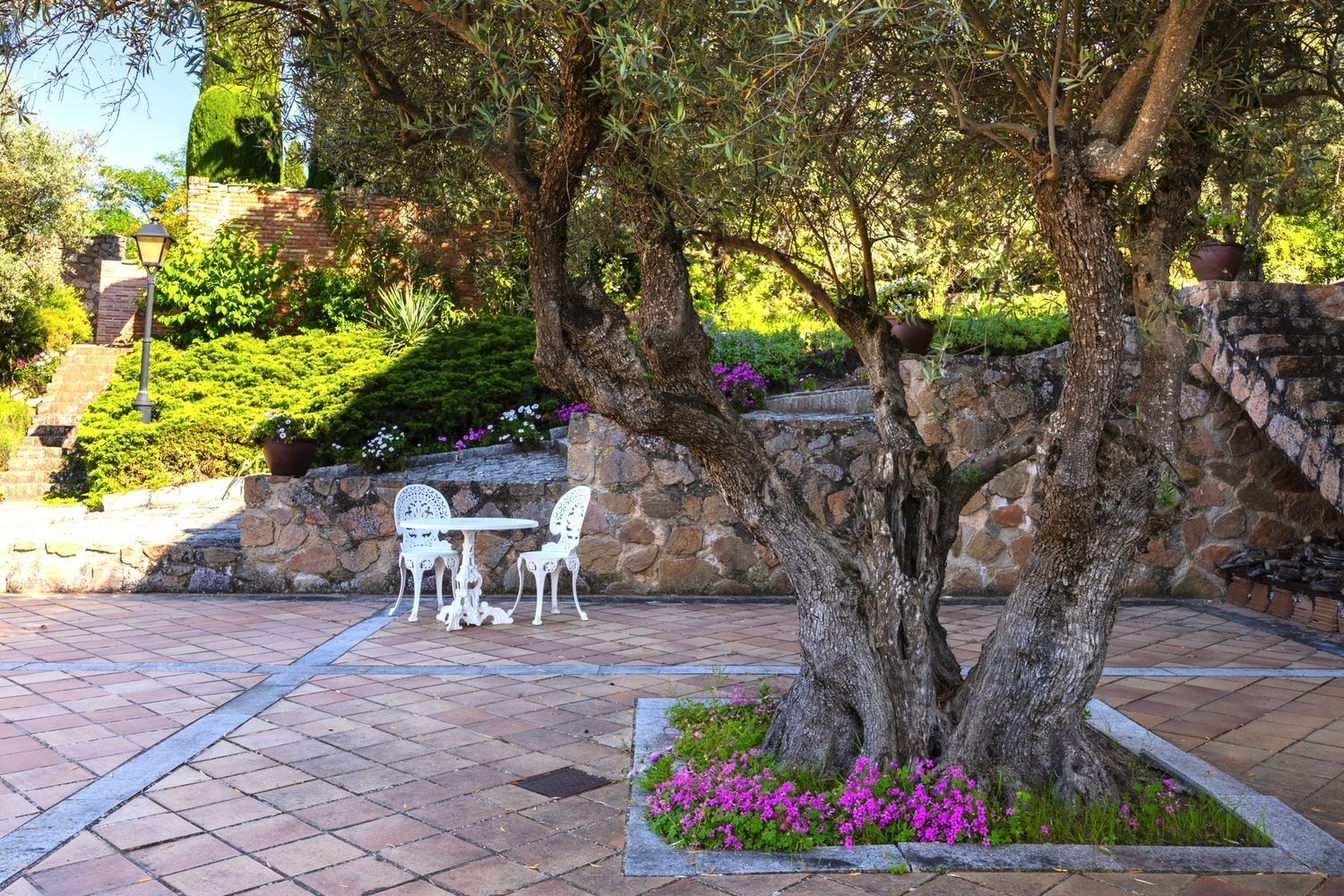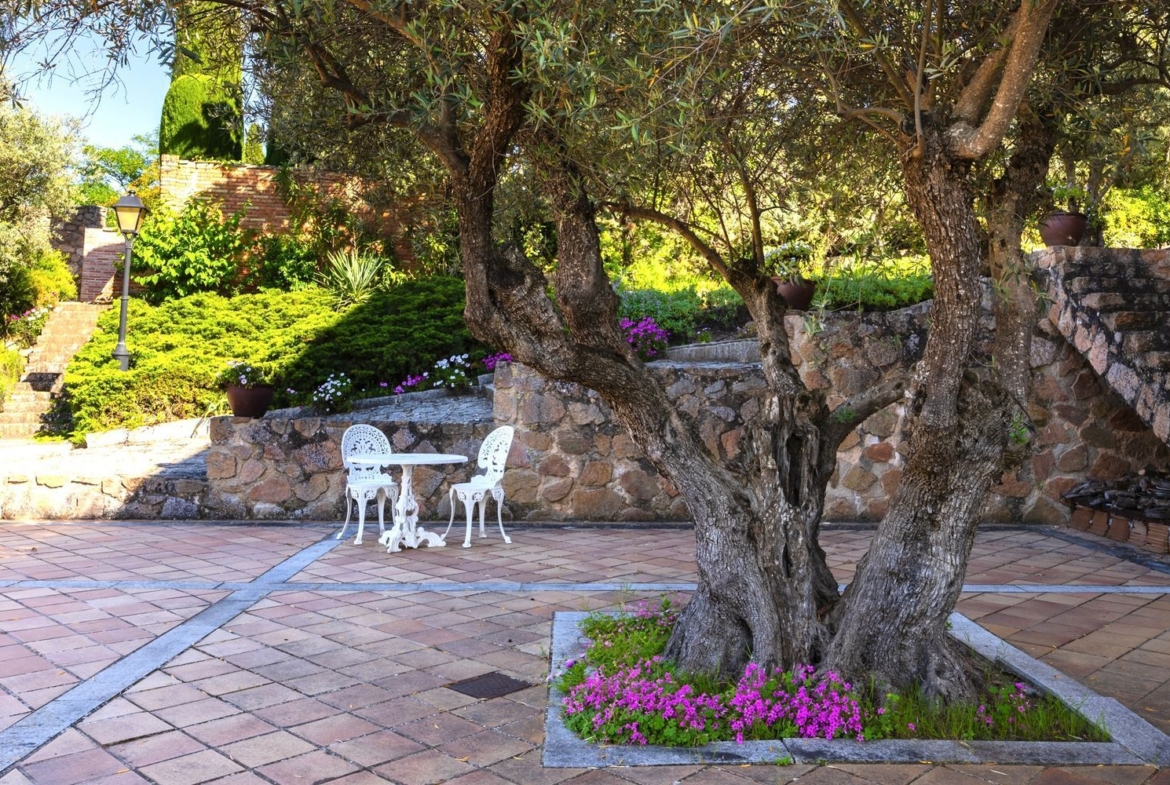 El jardín es un verdadero paseo sensorial: setos cuidados, rincones floridos, caminos entre árboles y un aire que huele a tomillo, romero y a tiempo detenido. Un entorno natural cuidado y lleno de encanto que cuenta con diferentes zonas de estar, rincones sombreados, vegetación mediterránea y una piscina rodeada de naturaleza, perfecta para disfrutar en los meses de verano.