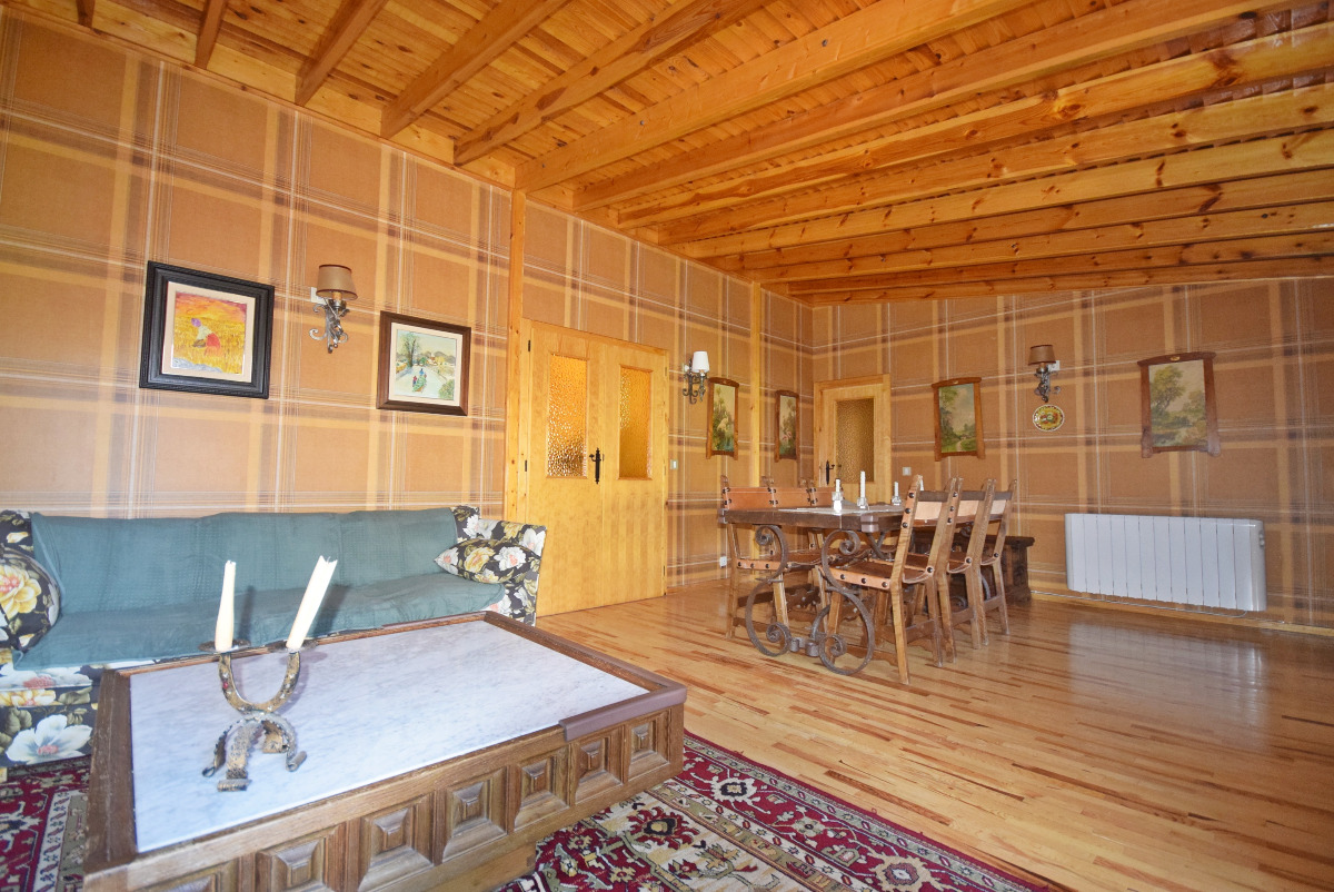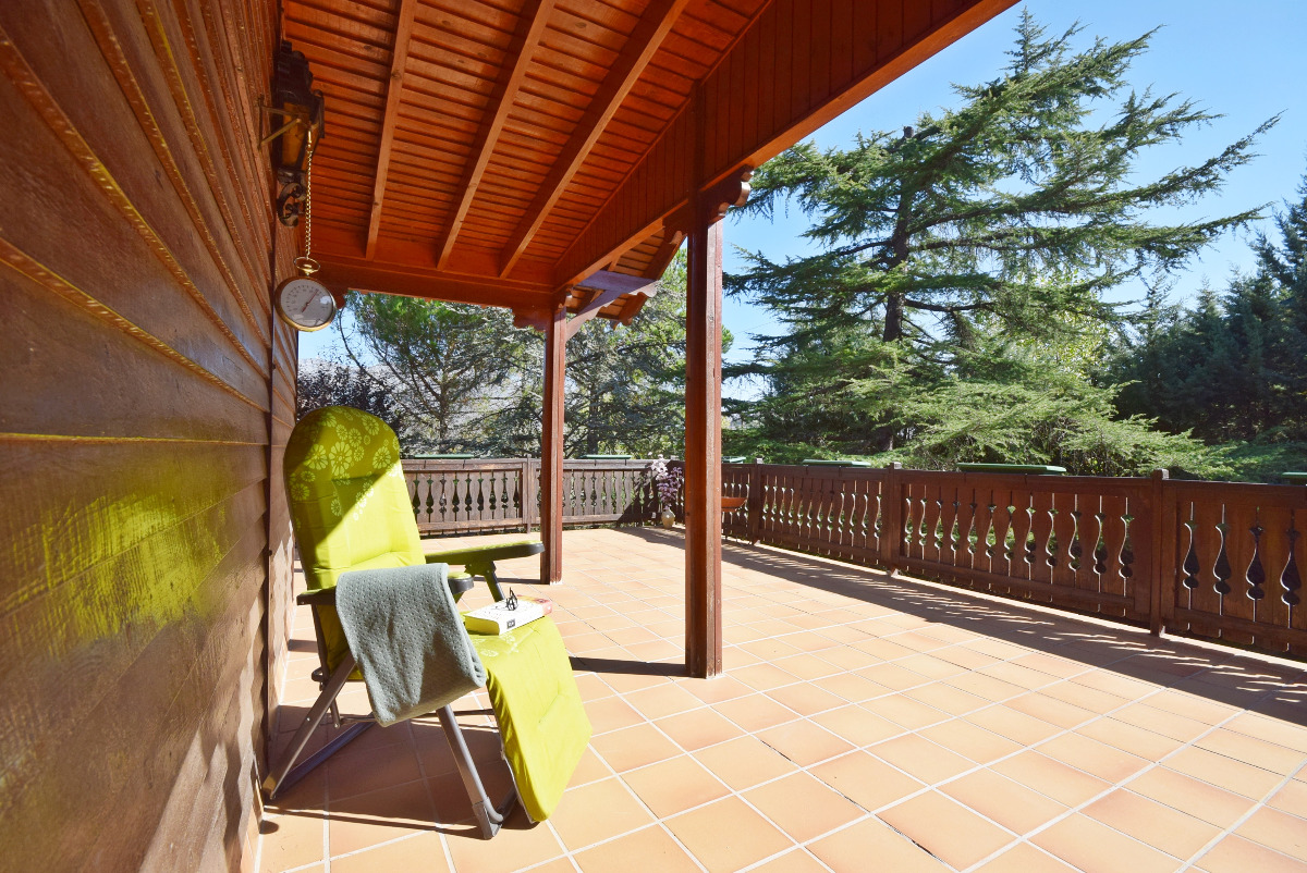 Magnífico chalet individual de pino báltico al estilo de las casas de los Alpes. Situado en Collado Mediano, lindando con Navacerrada, en una urbanización privada, con vigilancia las 24 horas. Consta de unos 427 m2 construidos (aprox.) distribuidos en 2 plantas. En la planta alta podemos encontrar 6 de los 9 dormitorios, todos amplios y con unas preciosas vistas a las montañas; 3 de los 5 cuartos de baño, todos ellos completos; una amplísima cocina y un espectacular salón con una fantástica chimenea y salida a una gran terraza cubierta de unos 31 m2 (aprox.) desde donde se puede acceder directamente al jardín. En la planta baja se encuentran los otros 3 dormitorios, 2 cuartos de baño y un salón de reuniones muy espacioso con una barra de servicio y un horno, que no sólo sirve para asar grandes comidas sino que además calienta como una chimenea. Desde dicho salón se puede salir a un porche muy agradable, a través del cual accedemos a la zona deportiva de la finca. A través de esta planta baja también se accede al garaje, de unos 60 m2 (aprox.) con mucho sitio de almacenaje y donde entran hasta 3 coches. La vivienda está situada en una parcela de unos 2500 m2 (aprox.), con un espectacular jardín en el que destacan sus pinos de más de 20 años y su privacidad gracias a un perímetro de altas Arizónicas. Además cuenta con una pista de tenis y una piscina climatizada de forma arriñonada, con sistema de iluminación combinado con refrigeración de la vivienda en verano. Sin duda lo que más destaca es el mimo y cuidado con el que se ha construido esta vivienda, sus extraordinarias calidades, como la madera de pino báltico, caracterizada por su capacidad de aislamiento, su encantadora estética, el magnífico estado de conservación y sus espectaculares vistas totalmente despejadas a la Sierra Norte de Madrid y a los Siete Picos.