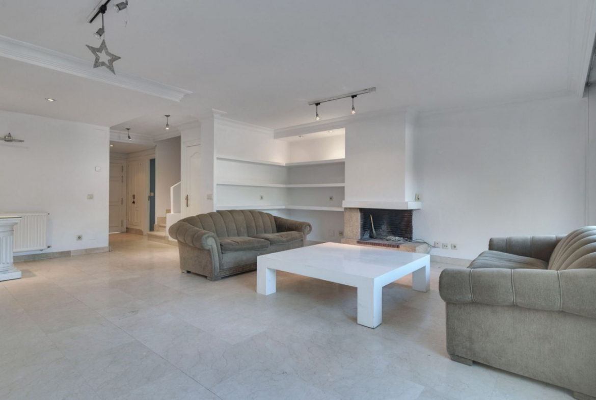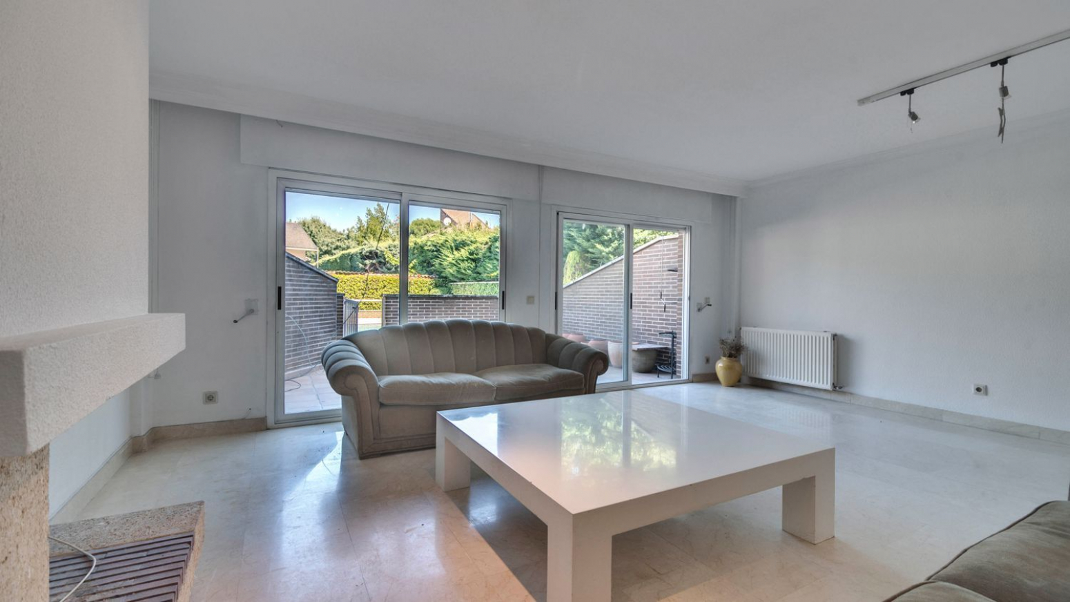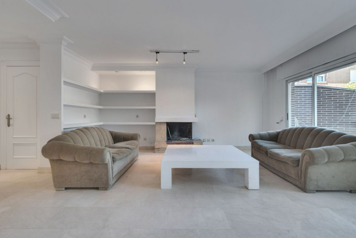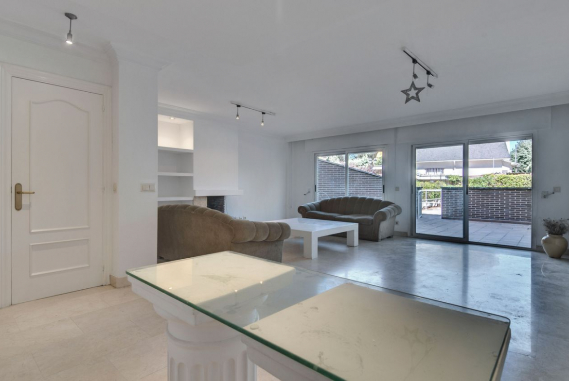 CHALET ADOSADO EN PLENO CENTRO DE TORRELODONES POR 545.000?. La vivienda pertenece a una pequeña urbanización de ocho chalets y consta de cuatro plantas. La baja y principal tiene según entramos al hall de entrada la cocina a mano derecha, un aseo de cortesía a la izquierda y un gran salón en el frente dotado de chimenea francesa. Desde dicho salón salimos a la parte posterior de la vivienda con una gran terraza solada desde la que se accede directamente a la piscina común. En la planta primera está el dormitorio principal que en su día eran dos habitaciones por lo que ocupa toda la fachada de la casa y tiene dos grandes armarios estilo vestidor y un cuarto de baño todo de mármol. además hay otras dos habitaciones dobles con otro de baño completo también de mármol. La buhardilla es diáfana. por último la planta semisótano, tiene una habitación multiusos con un cuarto de baño completo y un garaje con capacidad para dos coches en paralelo lo que permite entrar y salir con independencia del otro coche además de zona de trastero. La vivienda consta de muy buenas calidades con mármol en baños y suelos y parquet de madera natural (recién barnizado) en zona de dormitorios. Todo esto se complementa con la excelente ubicación de la vivienda ya que está en el centro del municipio a un paso de todos los servicios.