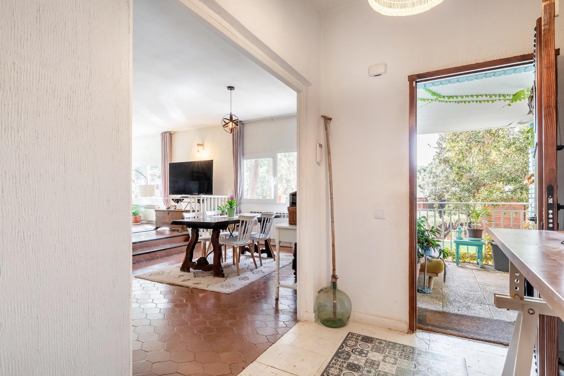 A la vivienda principal que se distribuye en una planta se accede desde un porche de entrada que a su vez da paso a un hall desde el que por la derecha pasamos a un amplio salón comedor y a una cocina totalmente equipada con salida a su cuidado jardín. Nuevamente desde el hall de entrada encontramos de frente discurriendo de forma perpendicular a la vivienda un pasillo que nos conduce a cuatro habitaciones de buen tamaño y dos baños completos, todas las estancias cuentan con gran luminosidad gracias a la construcción de la casa en una planta y a sus ventanas recorriendo todo el perímetro exterior de la vivienda.
