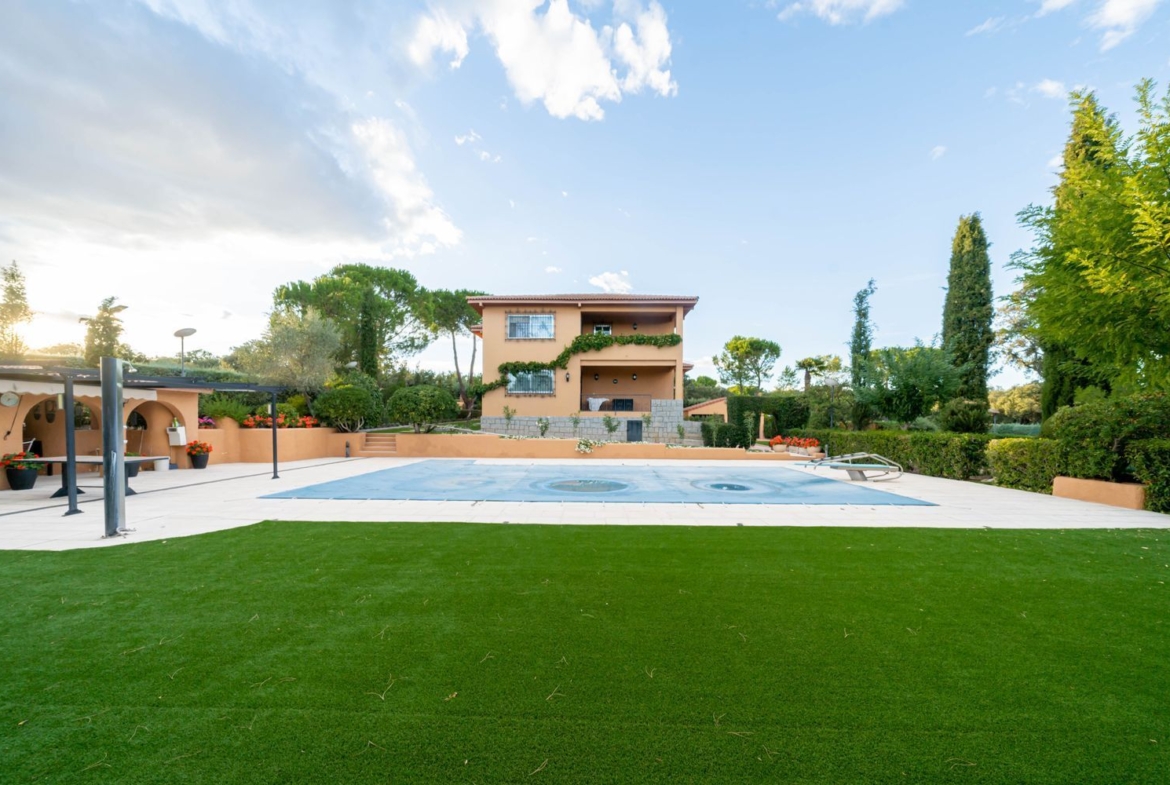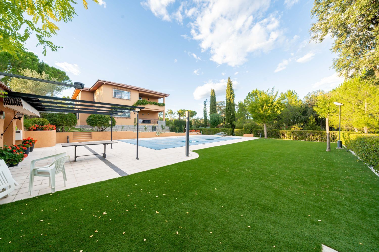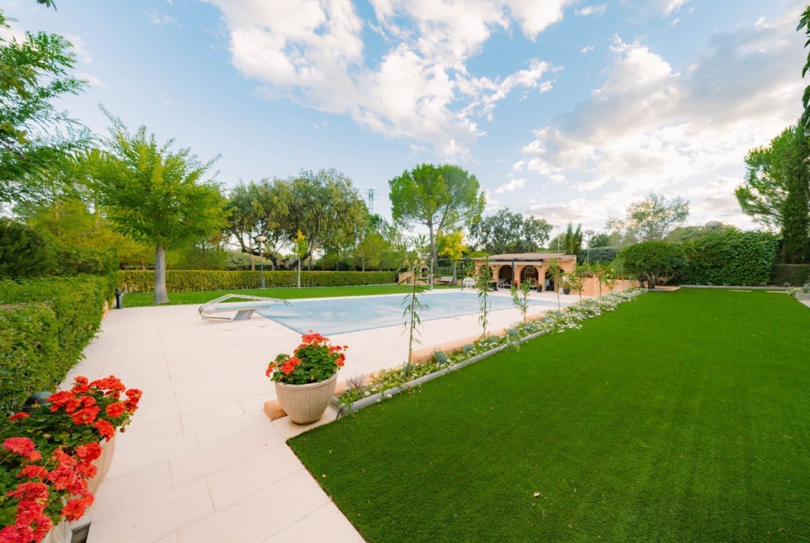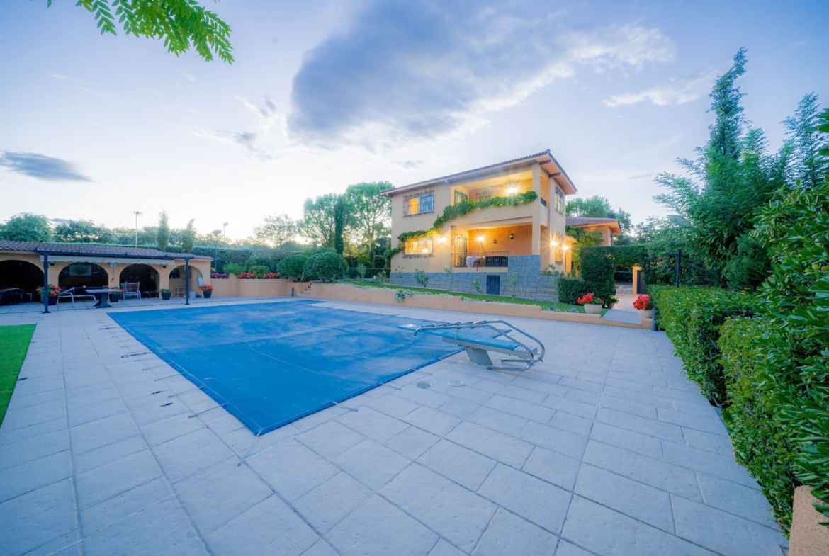 **Exteriores:** La parcela es un verdadero paraíso, con zona de piscina equipada con trampolín, solarium, porche, pérgola con toldo, zona de barbacoa, extensos jardines, un huerto y árboles centenarios.