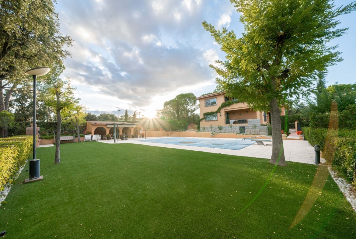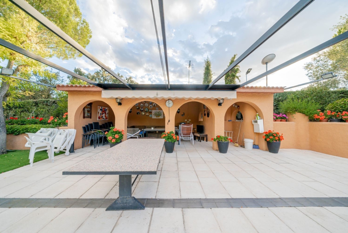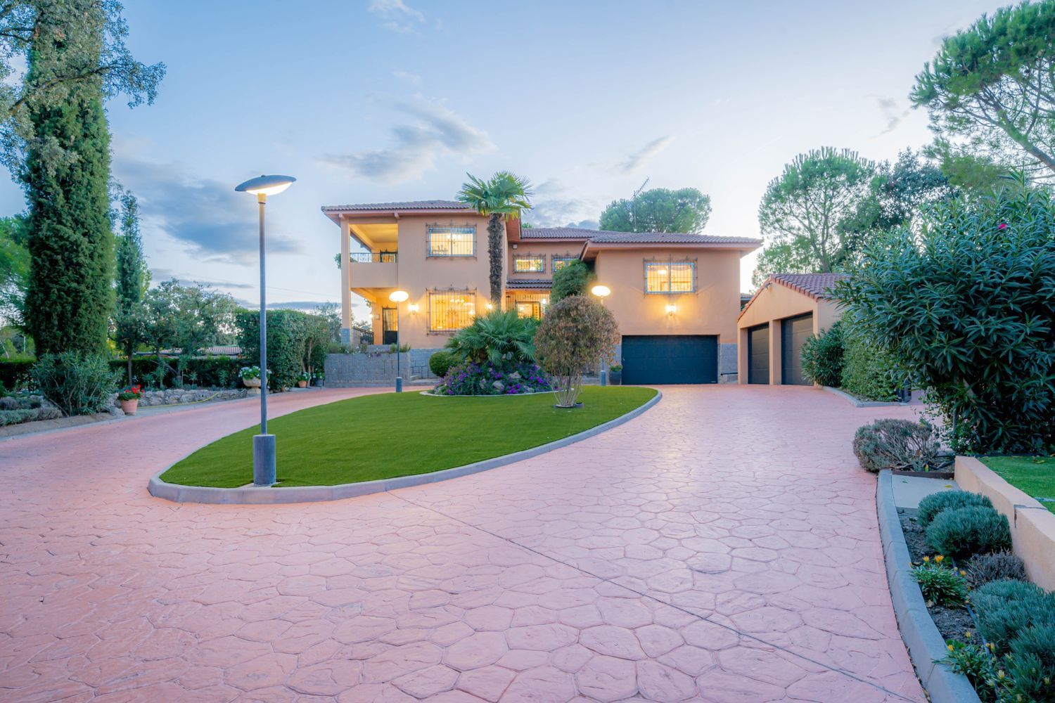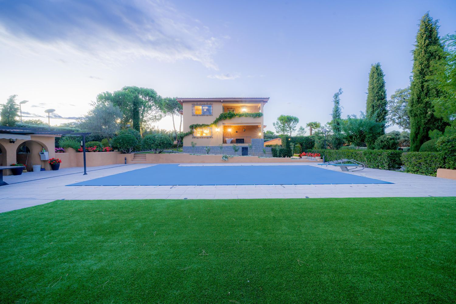 **Exteriores:** La parcela es un verdadero paraíso, con zona de piscina equipada con trampolín, solarium, porche, pérgola con toldo, zona de barbacoa, extensos jardines, un huerto y árboles centenarios.