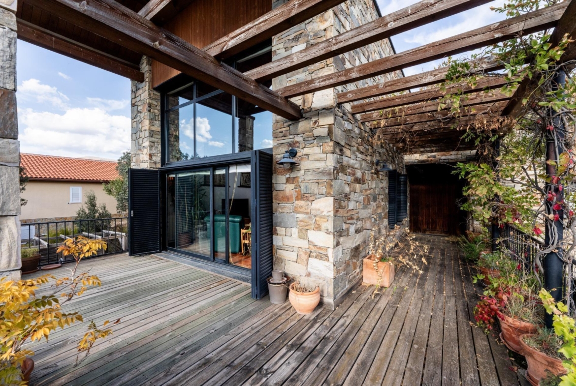 El primer encuentro con la villa revela su carácter único. La fachada, construida con piedra natural maragata ?a hueso?, es una obra de artesanía que evoca la solidez de las construcciones atemporales. No es una simple elección estética, sino una manifestación de calidad y durabilidad que dialoga a la perfección con el bosque de encinas centenarias y las formaciones graníticas que abrazan la parcela de 1650 m².