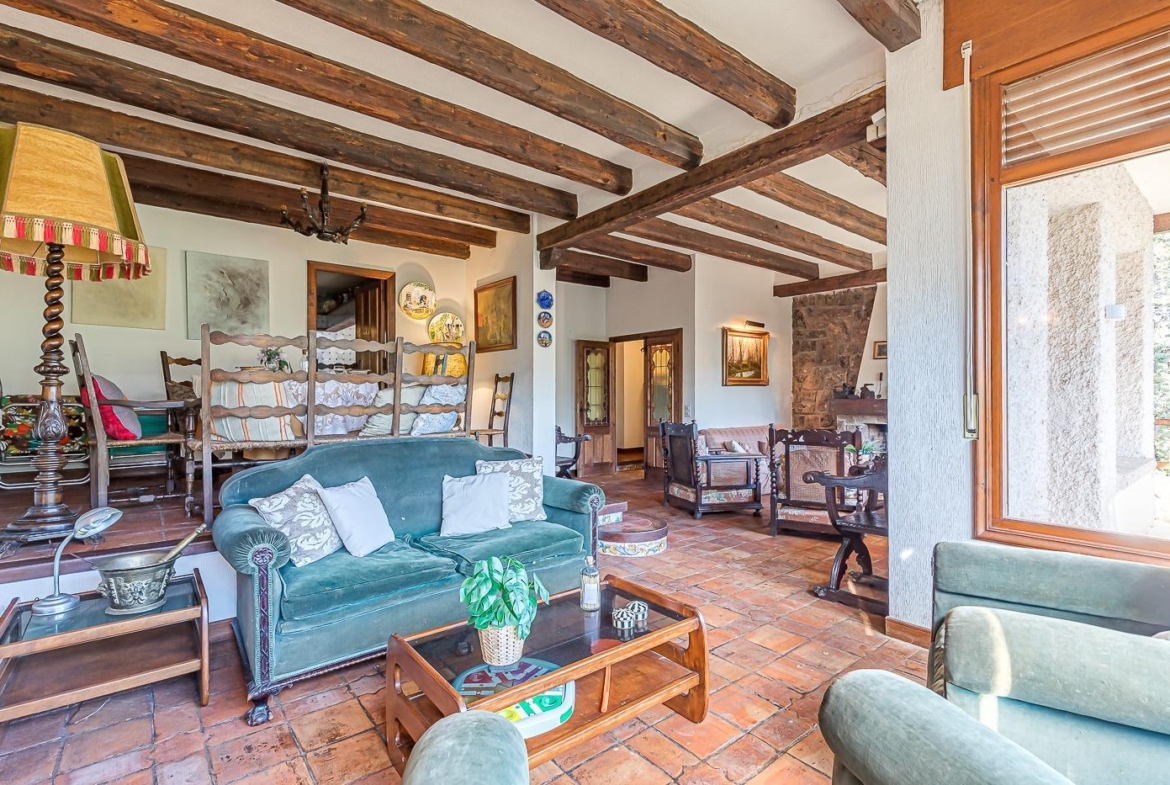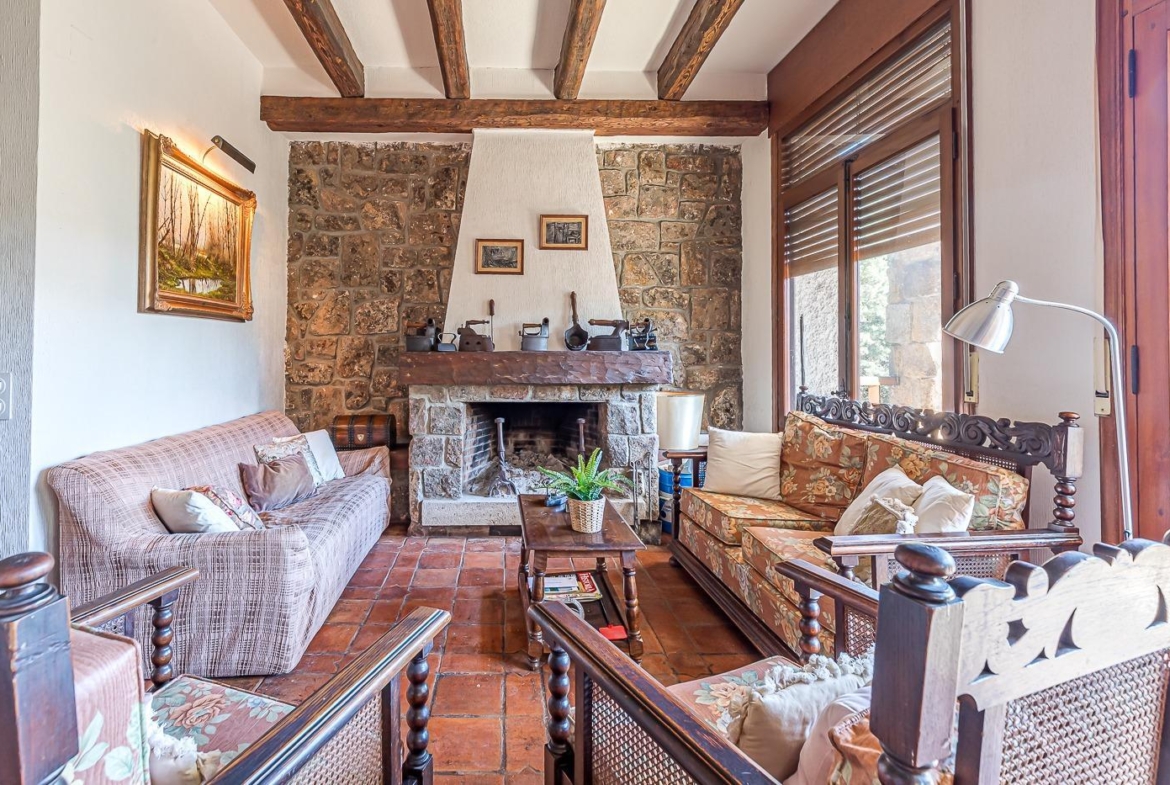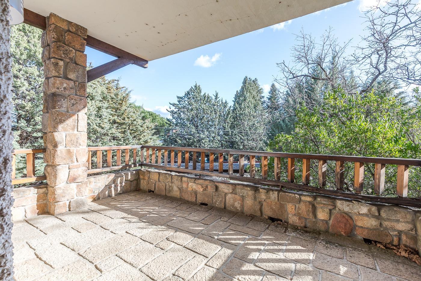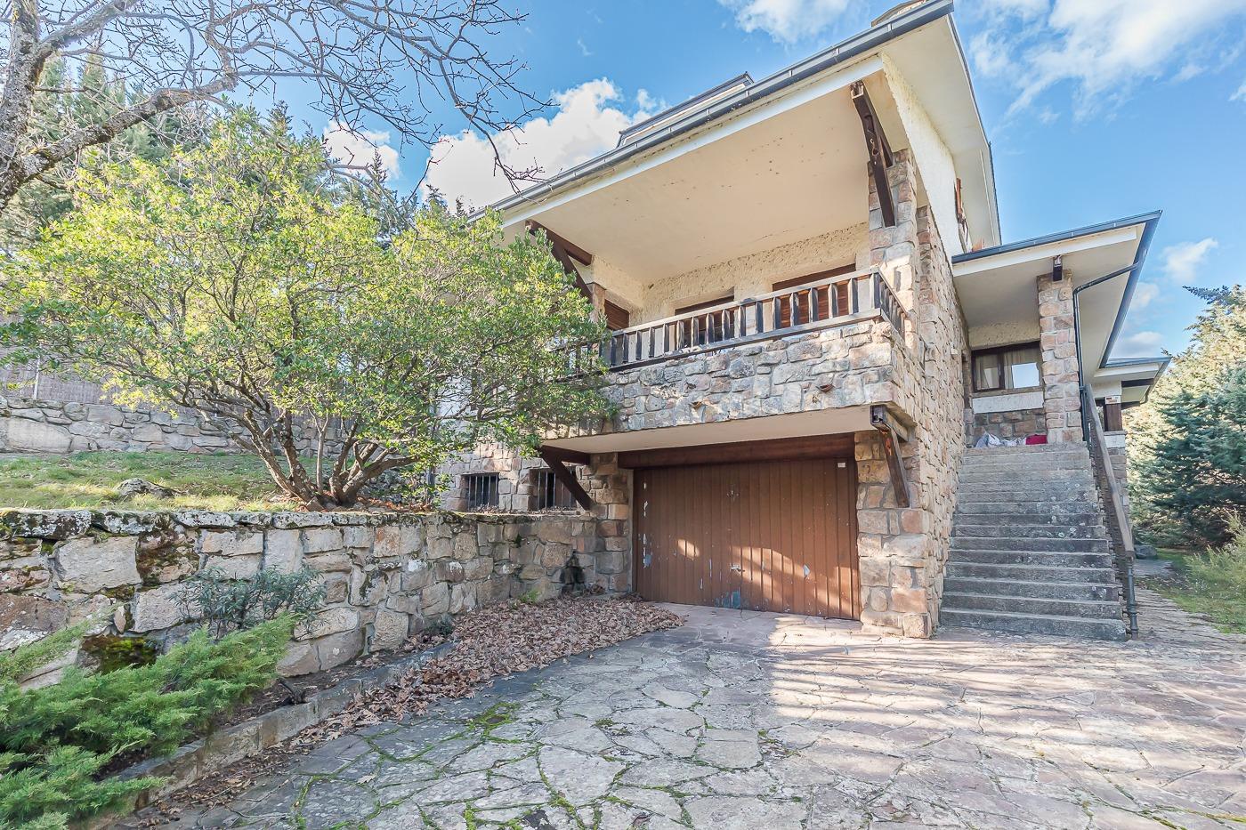 Esta casa unifamiliar se encuentra a la entrada del Pueblo de Navacerra al lado de su embalse en una parcela individual de 1.326 metros, en su fachada esta la entrada al garaje y una terraza, por el lateral suben unas escaleras hacia la entrada principal por la que entramos a un recibidor desde el que de frente accedemos a un salón comedor con chimenea, acceso a la terraza y acceso también a la amplia cocina con despensa y una habitación secundaria con un baño, este a su vez se le puede dar uso de baño de cortesía. Desde el recibidor tenemos de frente a la derecha otra puerta que separa las escaleras que dan acceso a la planta alta y baja en la que encontramos el garaje, la sala de calderas y un par de estancias de gran tamaño para hacer habitaciones, una bodega, taller, baño, despensa….