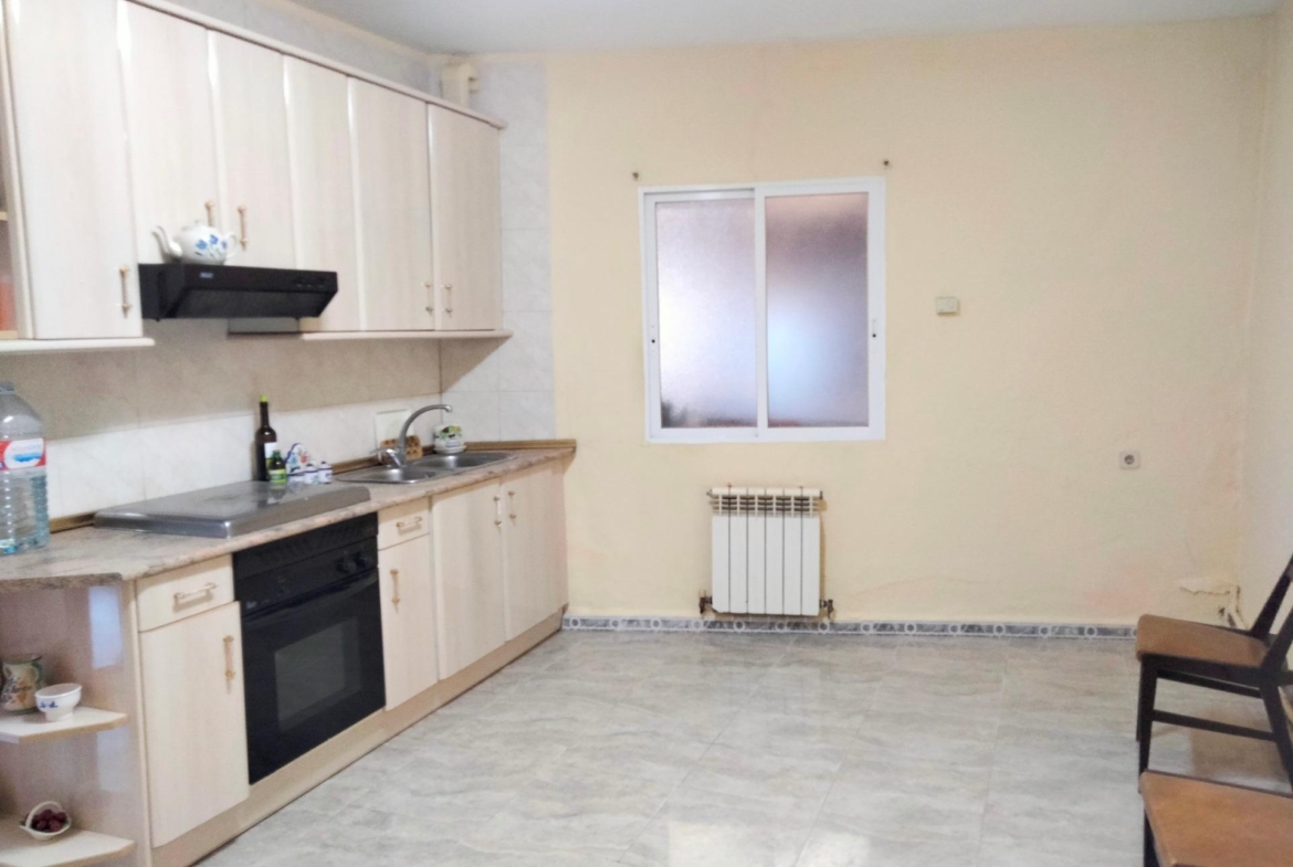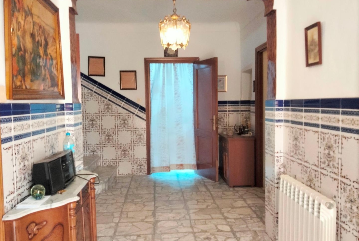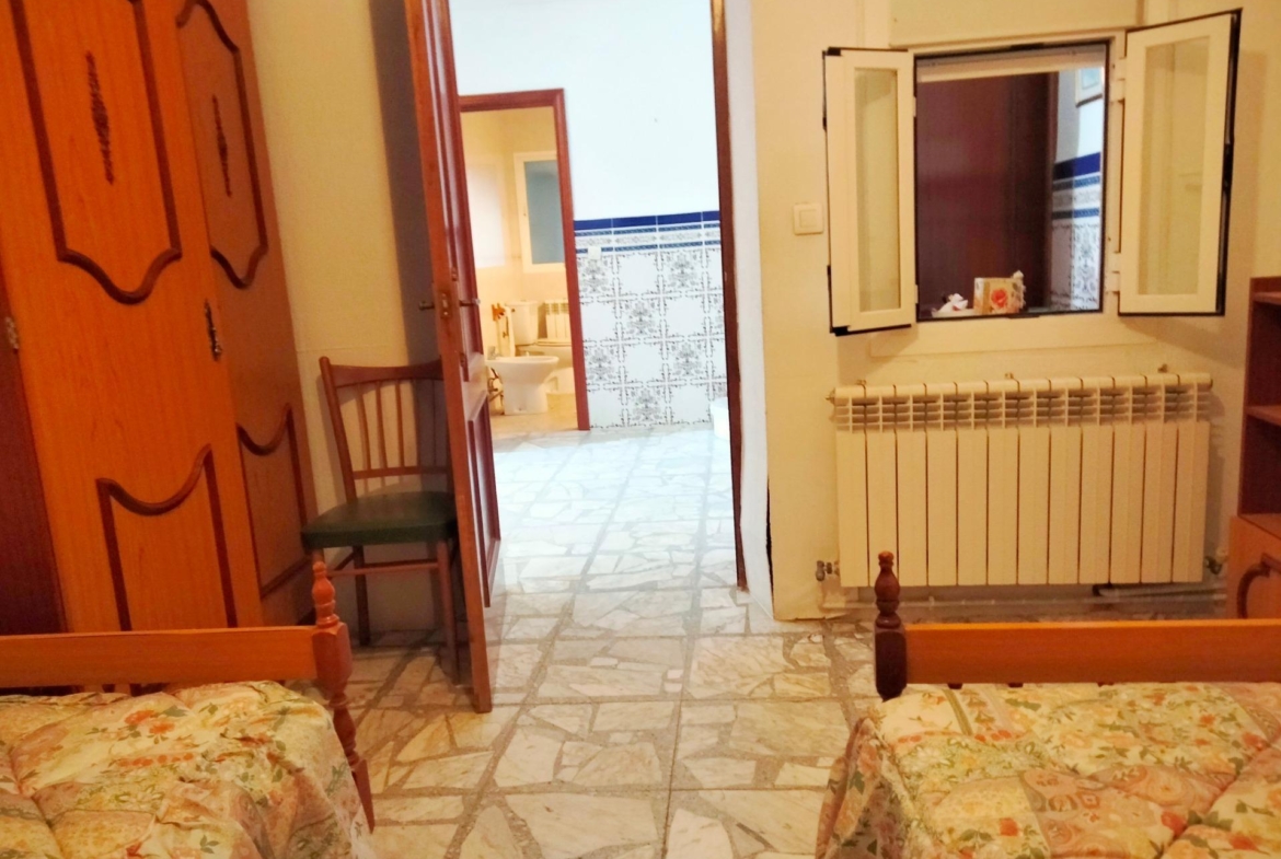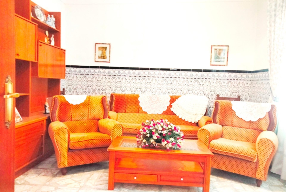 En la planta baja de la vivienda encontradas una amplía entrada y distribuidor, salón, dos dormitorios, baño completo con ducha, una patio cubierto mediante el que se accede a la amplia cocina con suficiente espacio para disponer un comedor en ella y escaleras para acceder al trastero de la planta superior y al patio de la vivienda. Desde este podemos acceder a la calle y, como ya hemos comentado, también podemos acceder directamente al solar anexo que cuenta con salida independiente a la calle. Este solar tiene unas edificaciones usadas como almacenes aunque la mayoría de la superficie está natural.