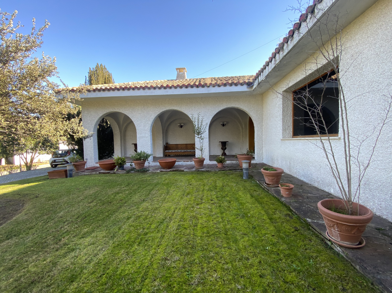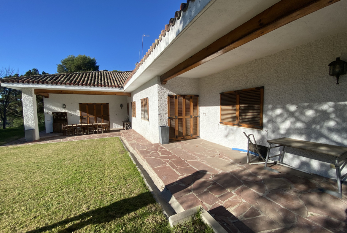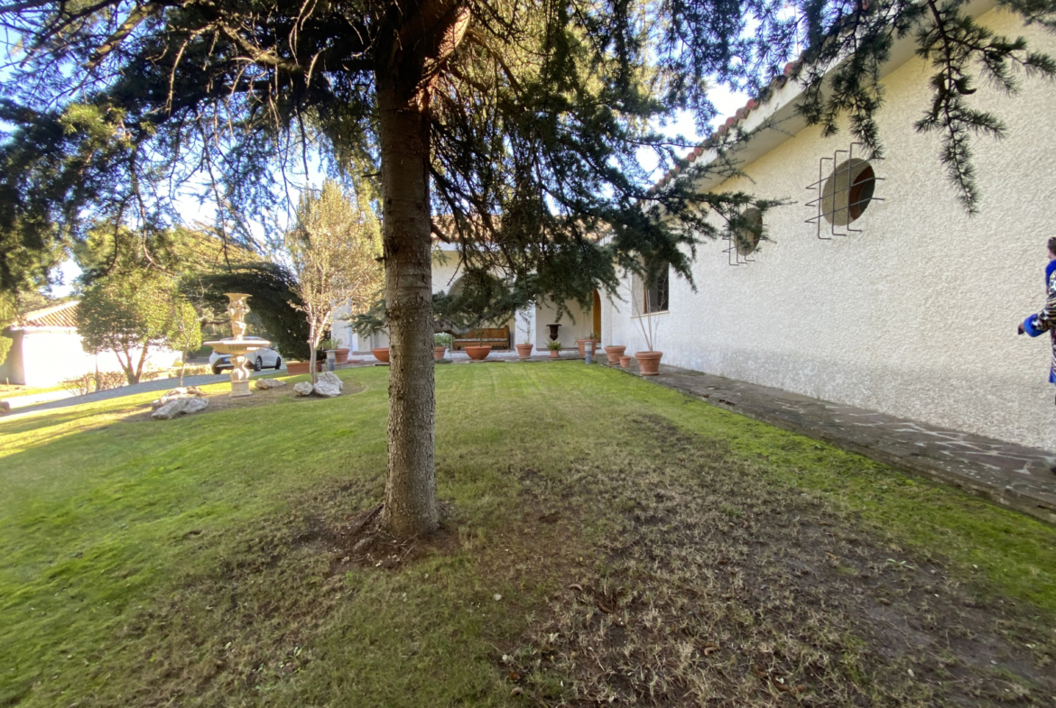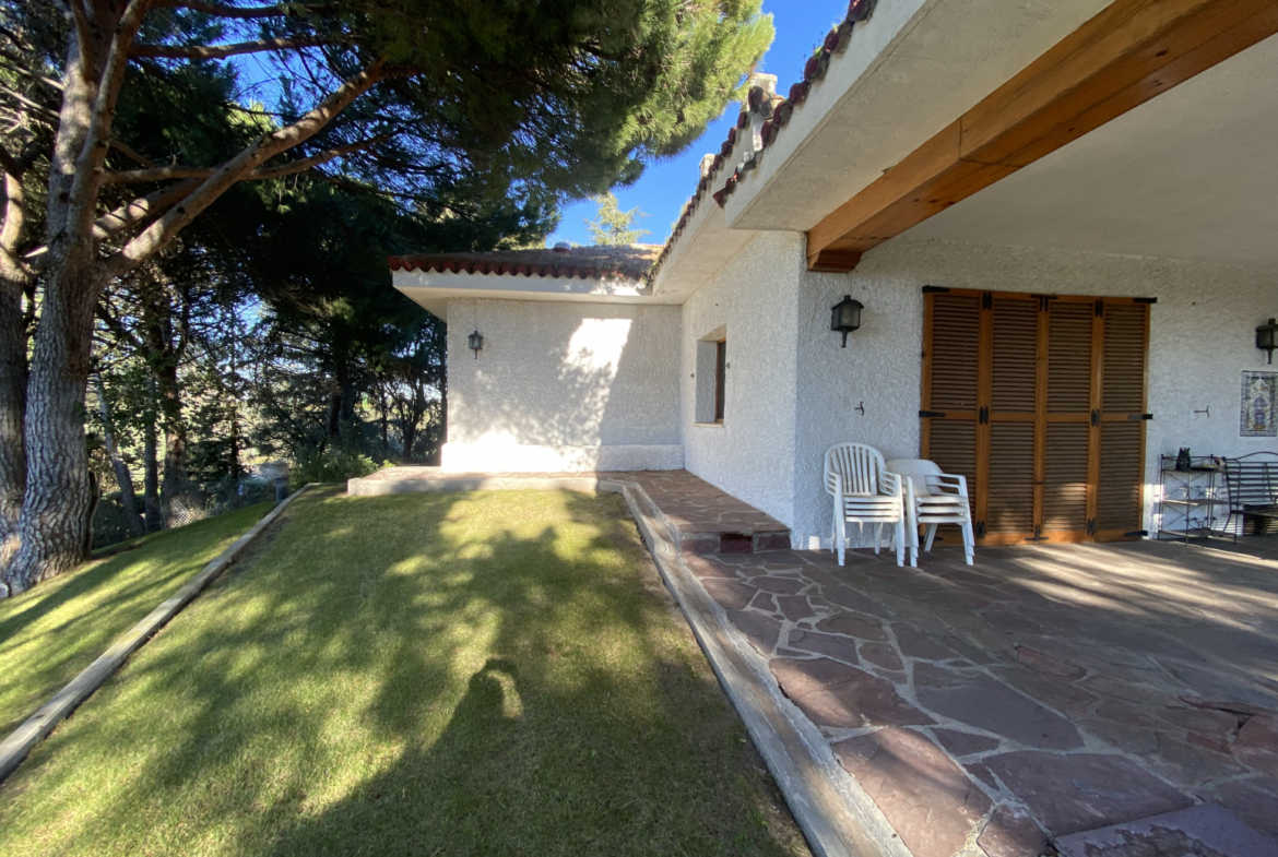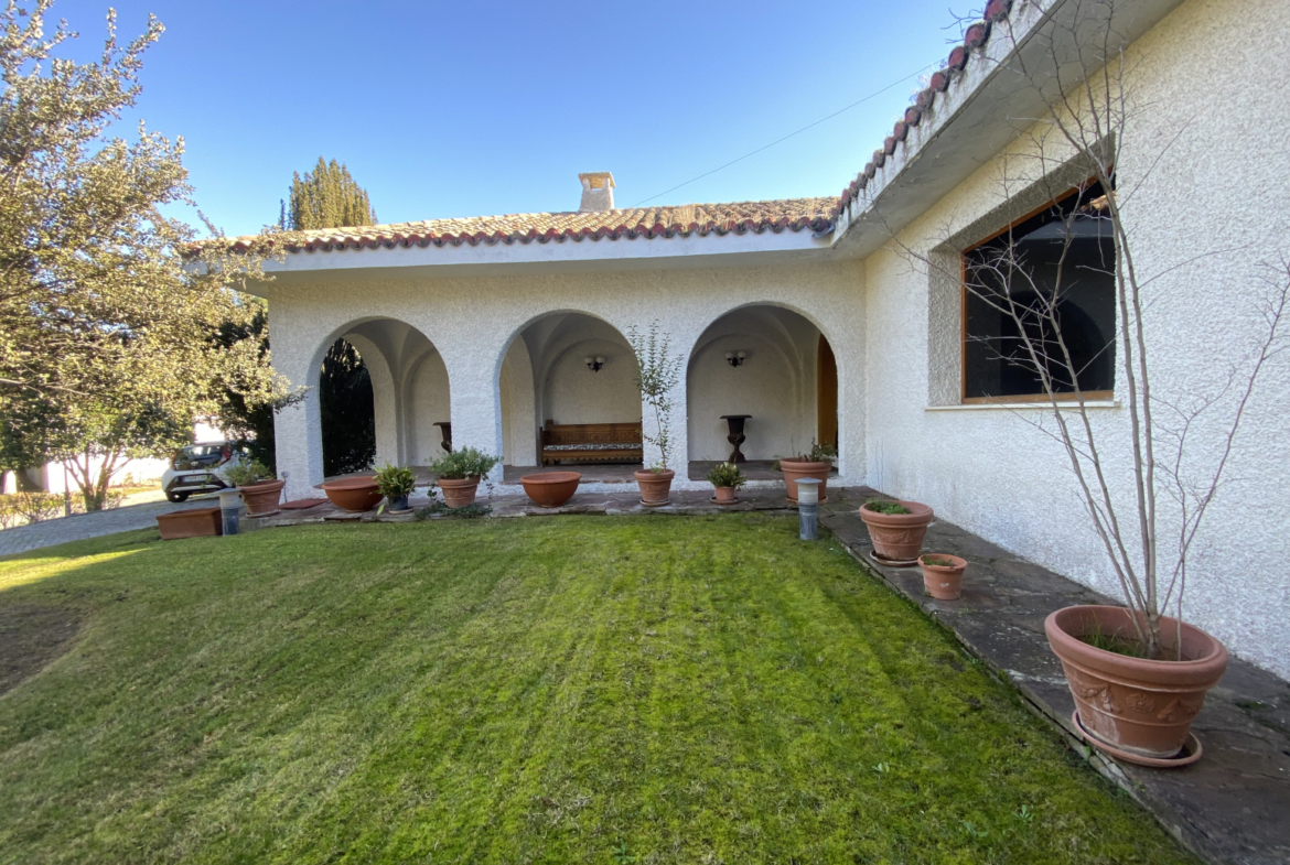 En el jardín, cerca de la entrada a la casa, hay dos cocheras para 6 vehículos. Una piscina grande al aire libre con baños, vestidor y cenador con barbacoa y un cenador.