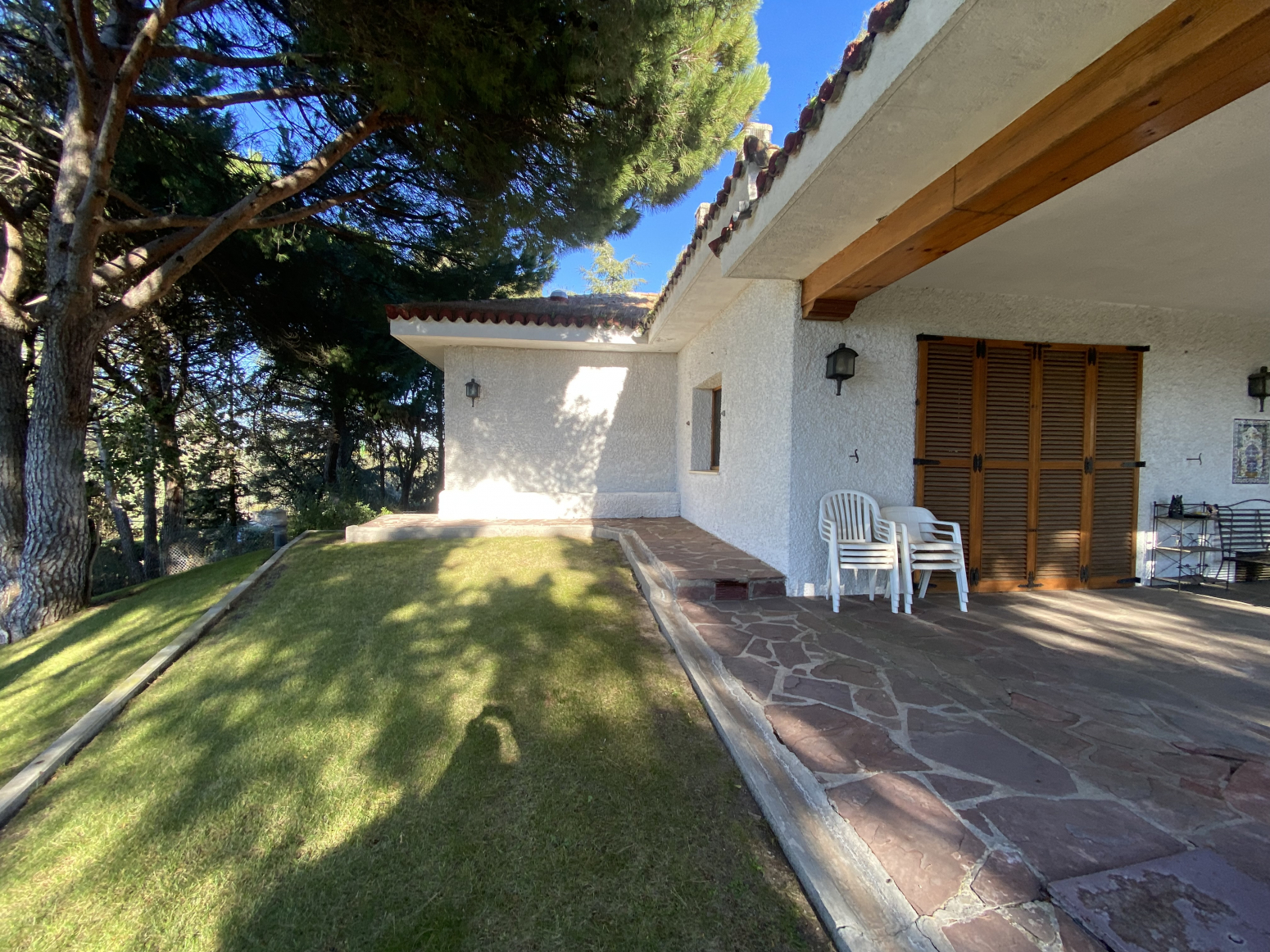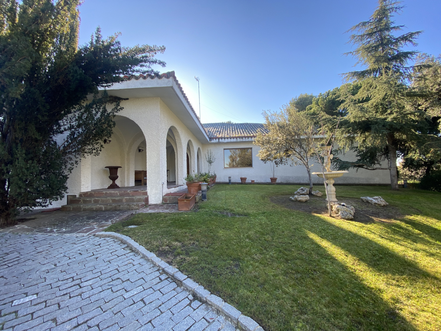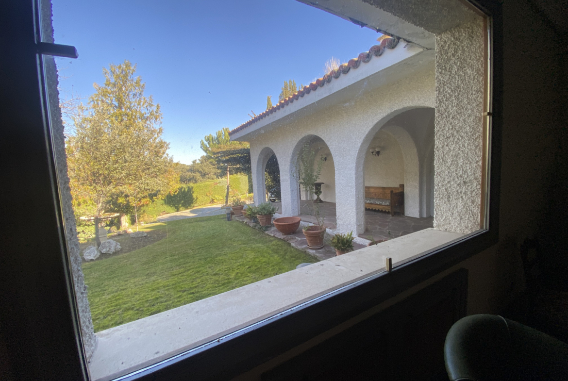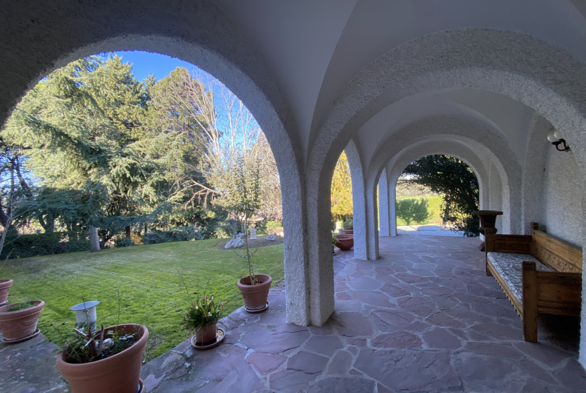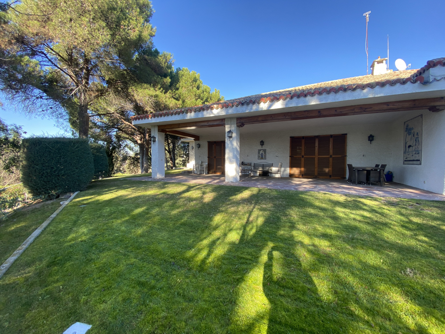 En el jardín, cerca de la entrada a la casa, hay dos cocheras para 6 vehículos. Una piscina grande al aire libre con baños, vestidor y cenador con barbacoa y un cenador.
