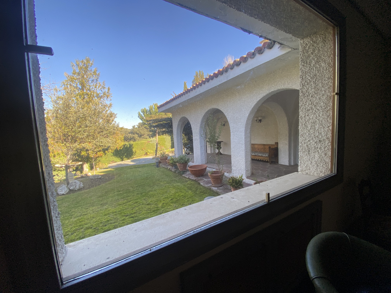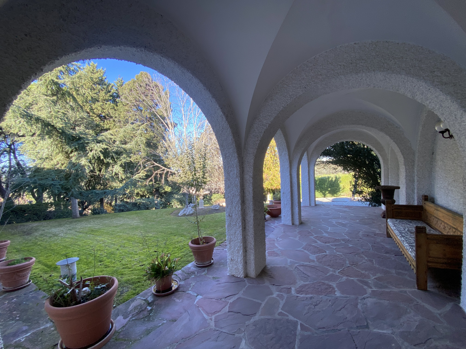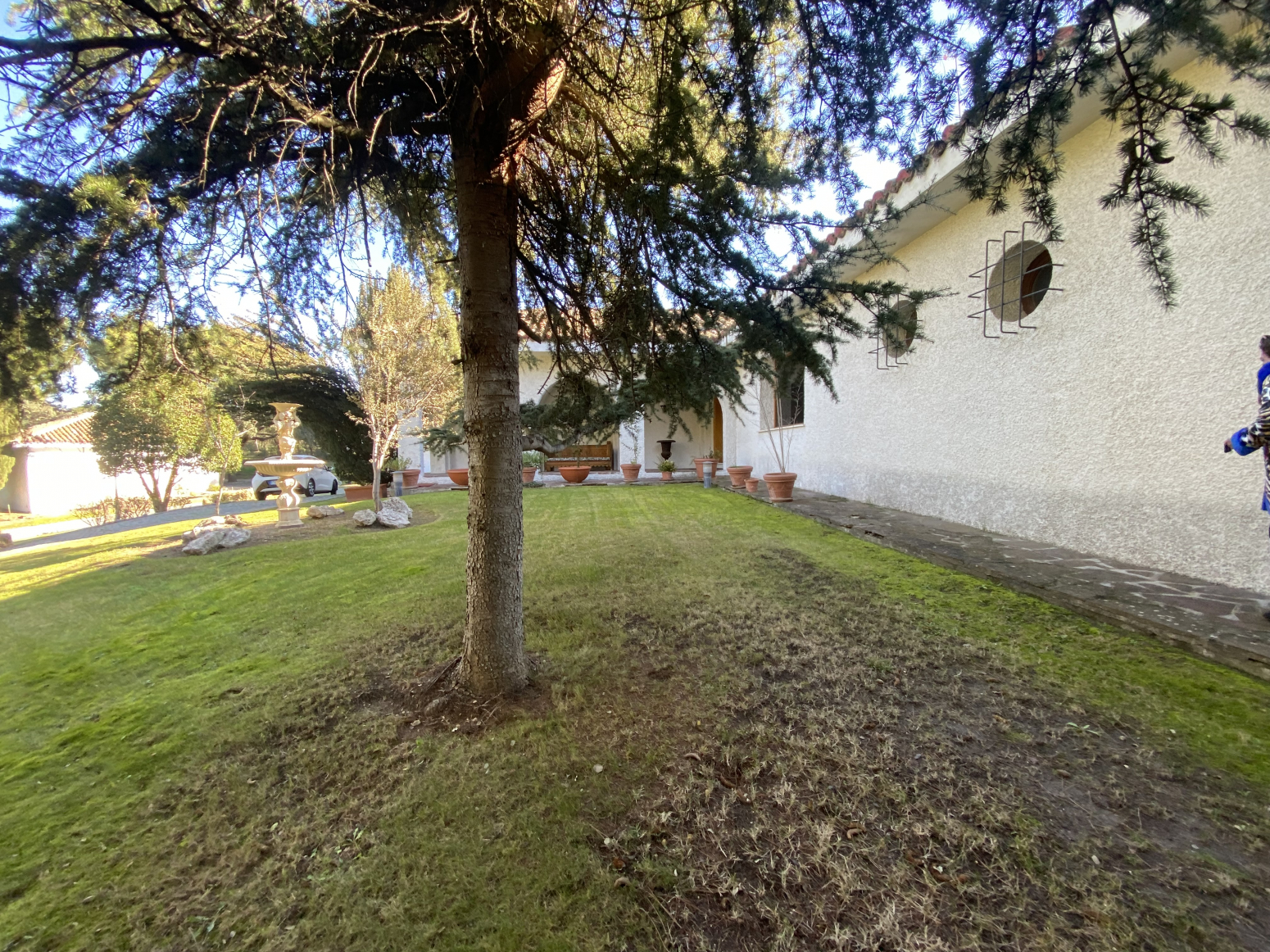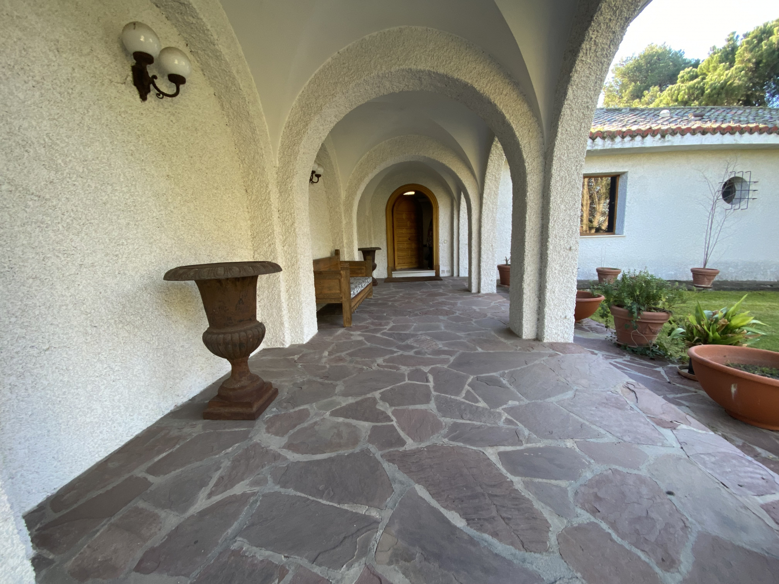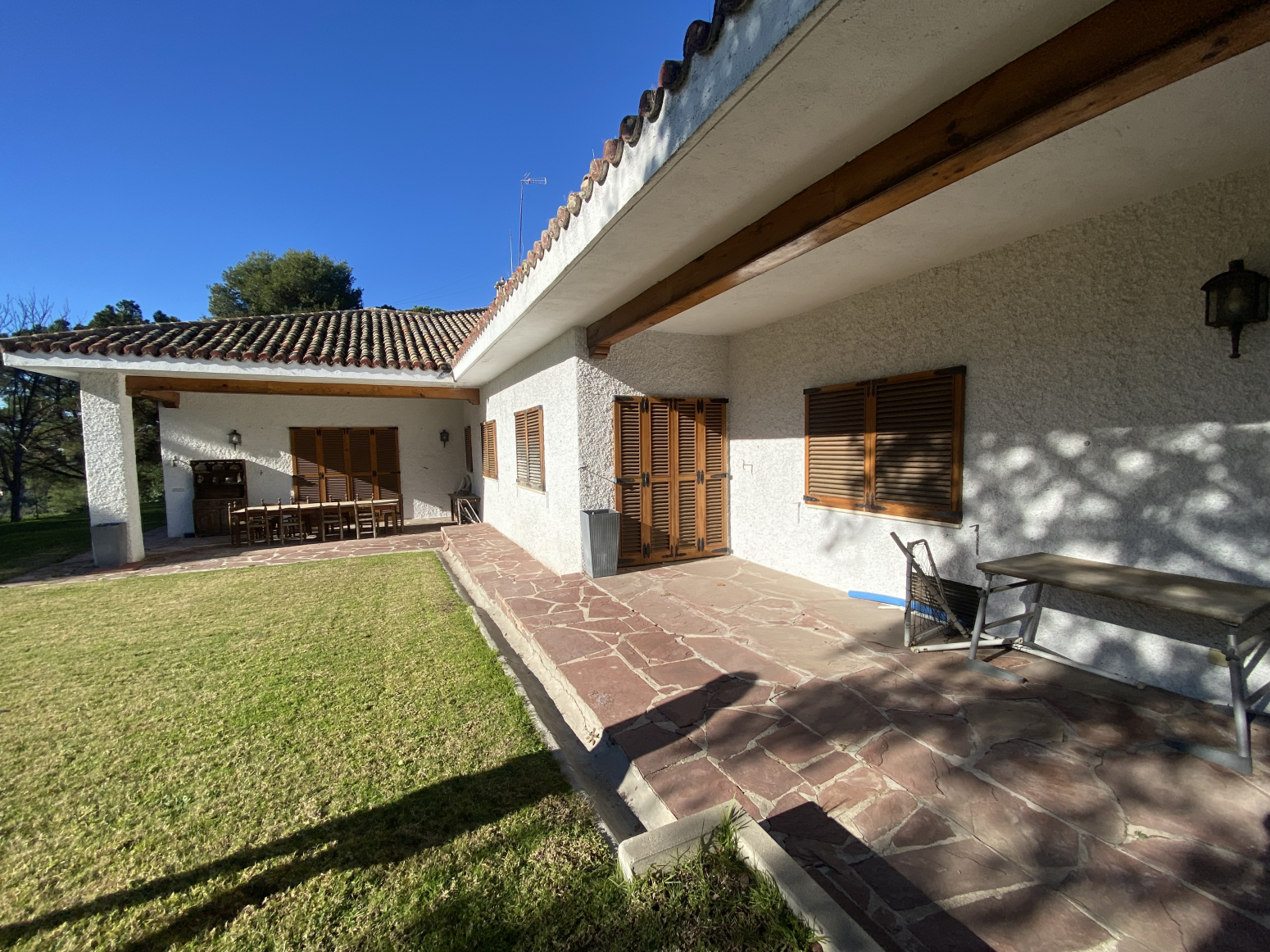 En el jardín, cerca de la entrada a la casa, hay dos cocheras para 6 vehículos. Una piscina grande al aire libre con baños, vestidor y cenador con barbacoa y un cenador.