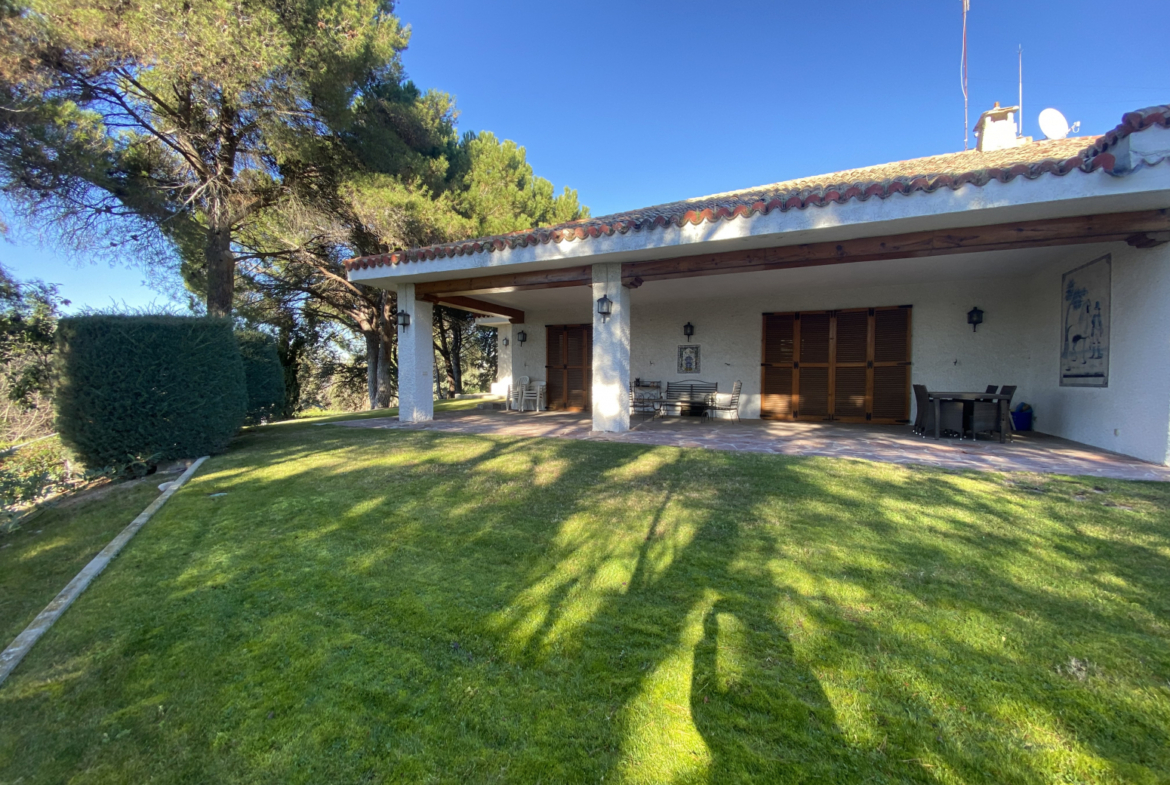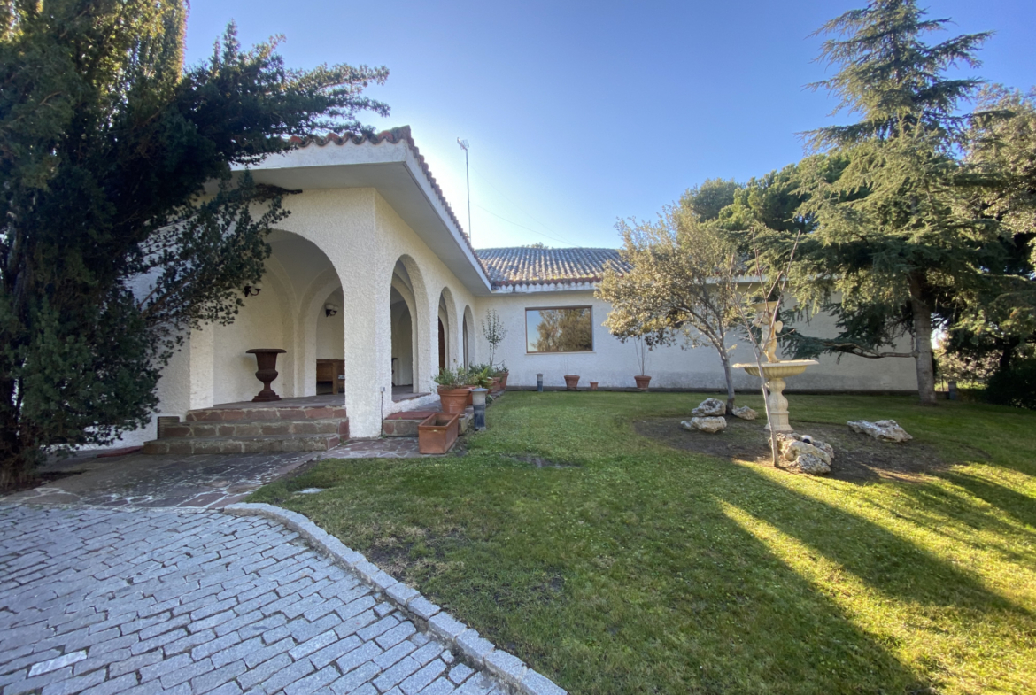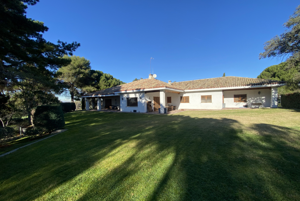 CAREYES. en Urbanización Montepríncipe. Chalet de 1.050m2 con jardín de 5.858m2, casi toda la superficie se reparte en la planta baja. Precioso porche de entrada con grandes arcos, da paso al vestíbulo con suelo de mármol, la casa se divide en zona de día y de noche, con suelos de madera, ventanales con entrada importante de luz natural.
