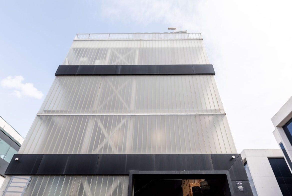 La forma de la construcción es rectangular, cuenta con un acabado distintivo con fachada de U-glass, y tiene una cubierta plana donde se albergan los aparatos de climatización.
