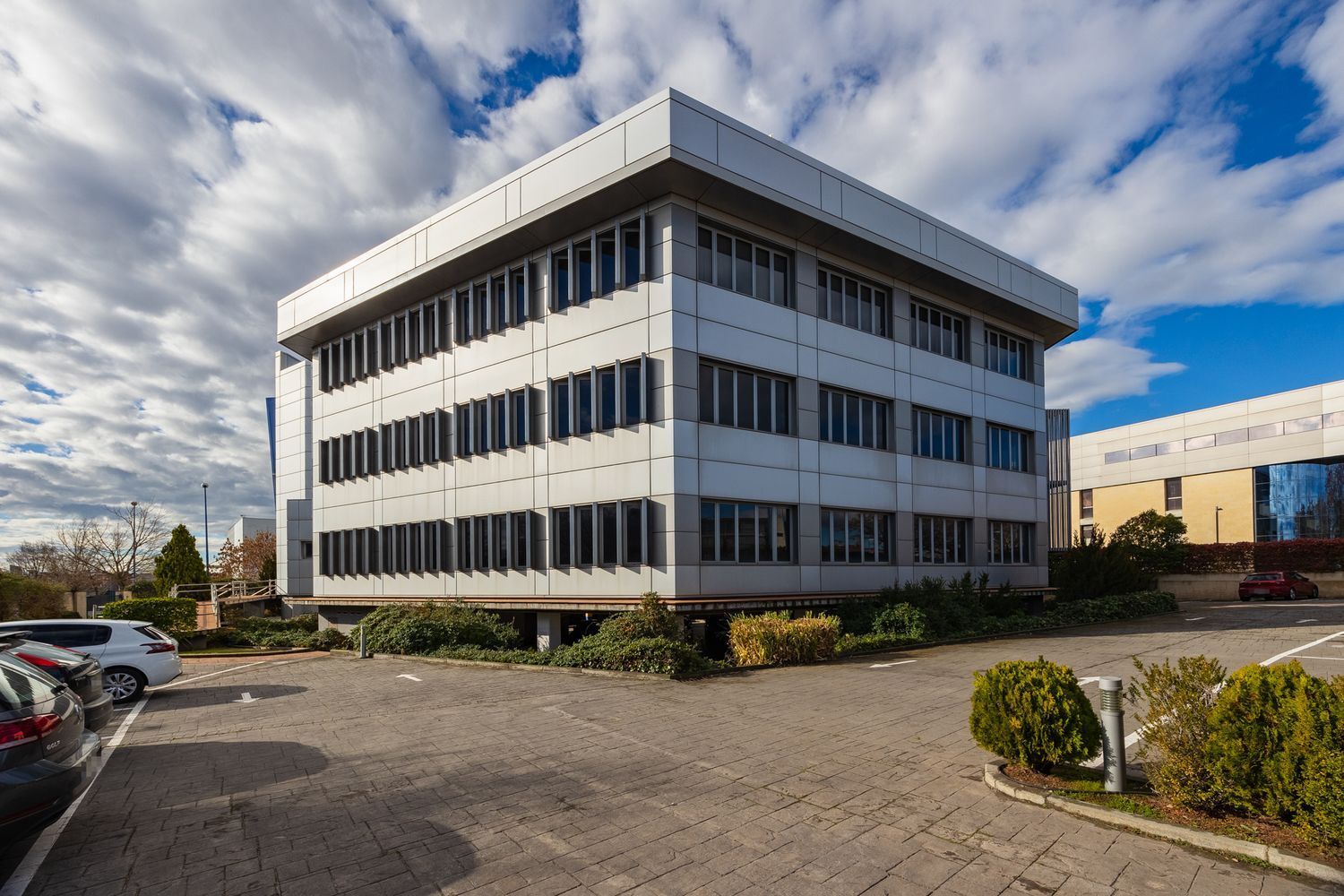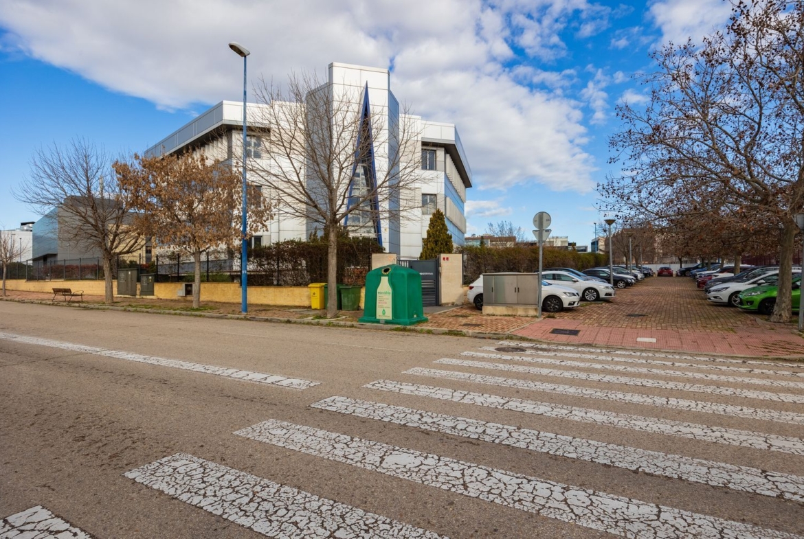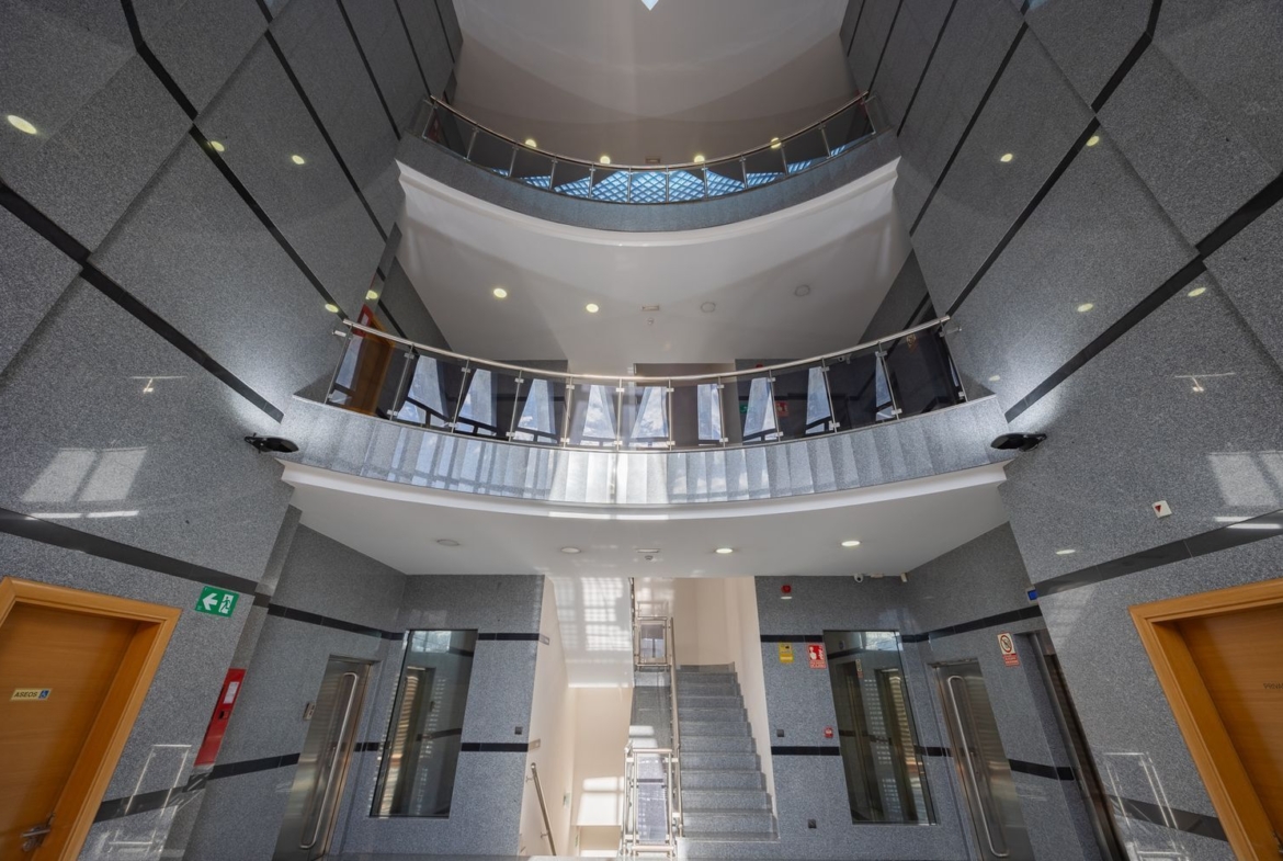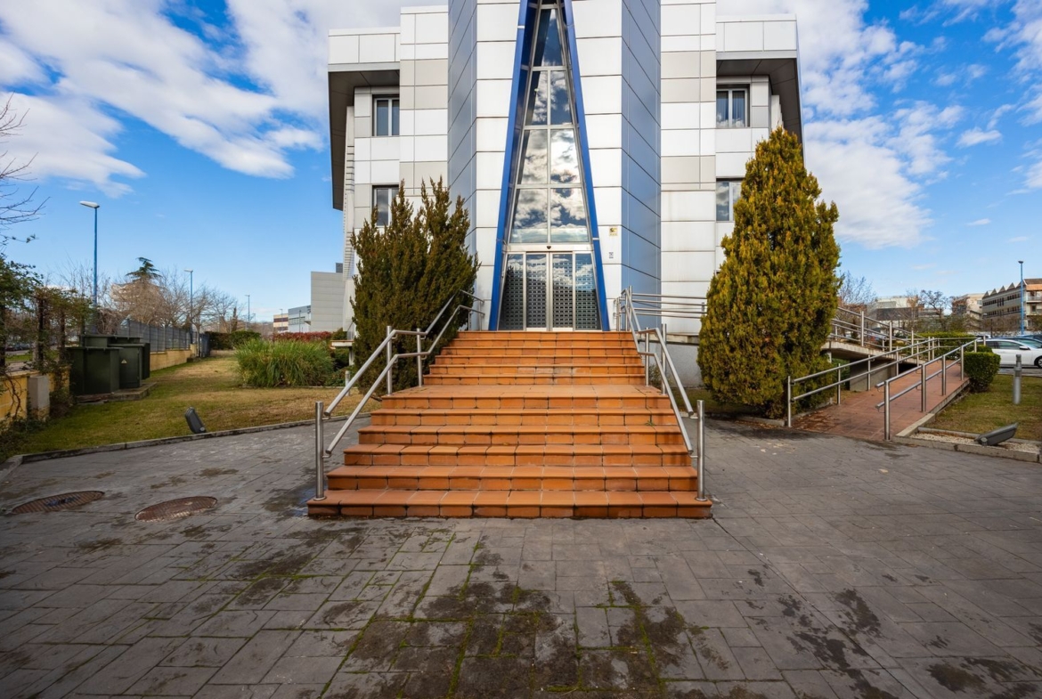 Recinto privado con zonas ajardinadas exteriores dos accesos para personas y vehículos, con rampa para uso de personas con movilidad reducida, ascensor desde el garaje. Tiene forma de hexágono regular y cada una de las tres plantas cuenta con una superficie de 750m2 repartidos en dos alas. Comunicado a través de la M-40 y M-45.