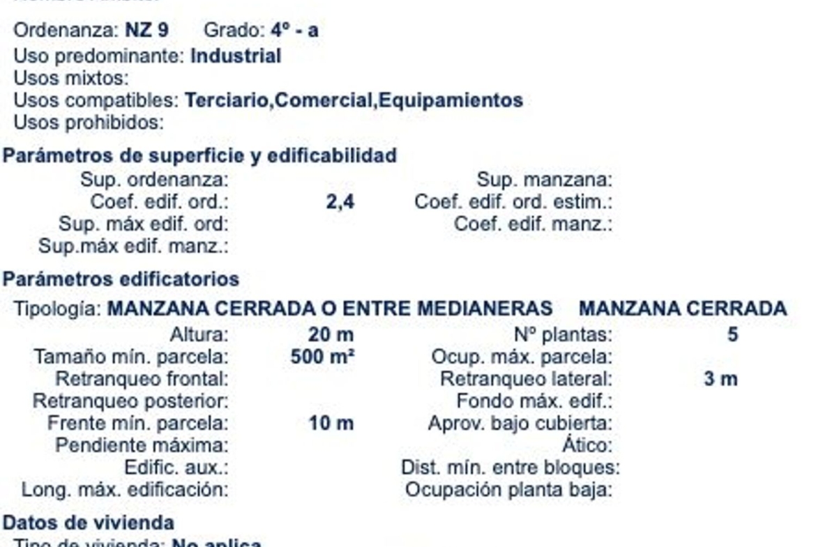 Se trata de una parcela cuyo uso principal es industrial, pero con usos compatibles de terciario, comercial y equipamientos, en base a la ordenanza NZ 9 con grado 4º-A.