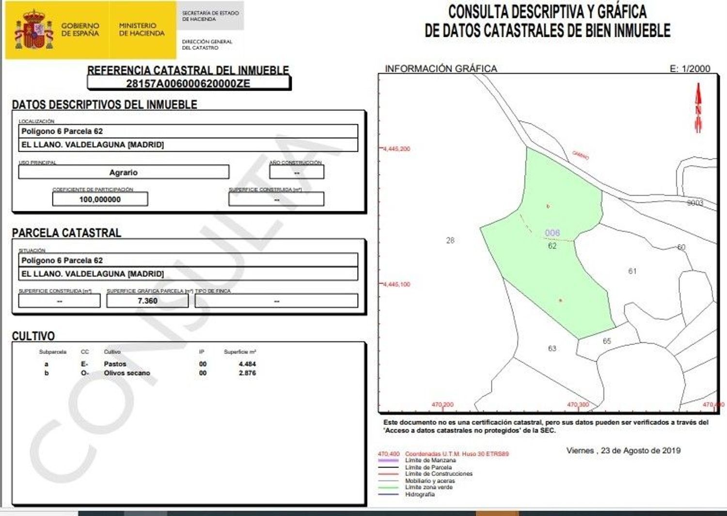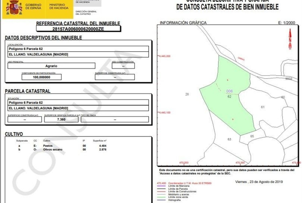 – 1. Se vende el pleno dominio del olivar y tierra de secano, al sitio denominado El Llano, con 7.360 m². Finca registral: 28157A00 0ZE.