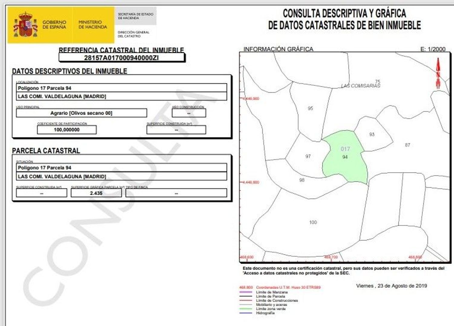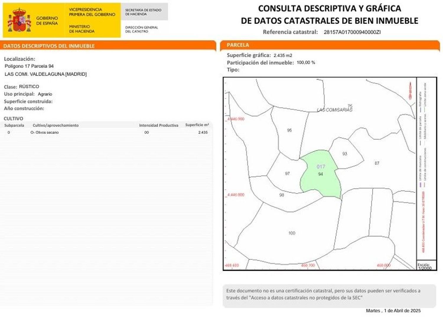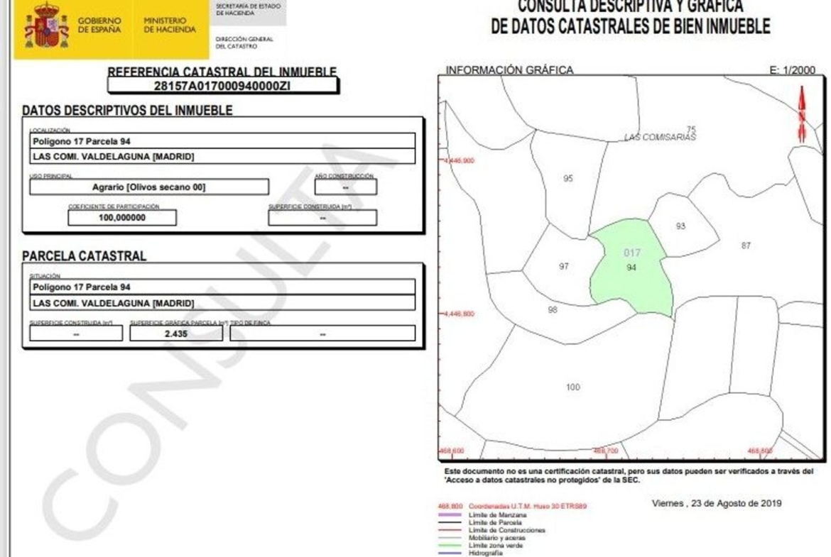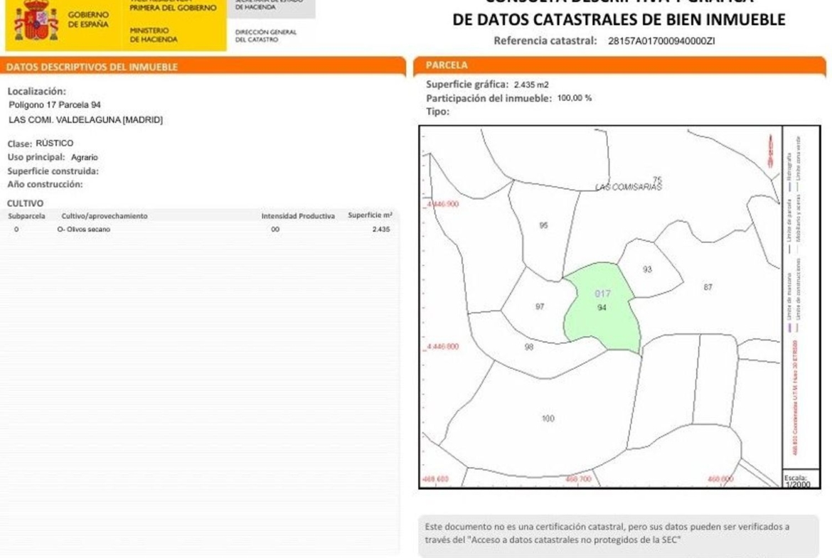 – 2. Se vende el pleno dominio del olivar de secano, al sitio denominado Las Comisarias, con 2.435 m². Finca registral: 28157A01 0ZI.