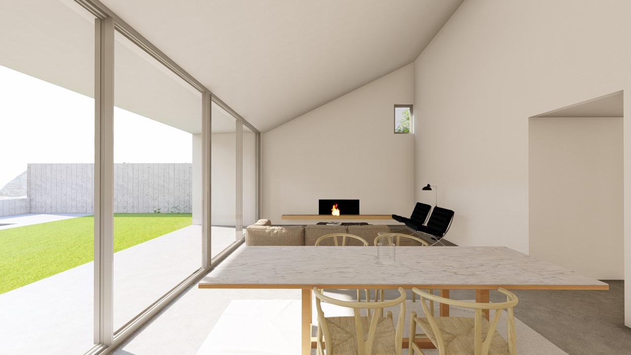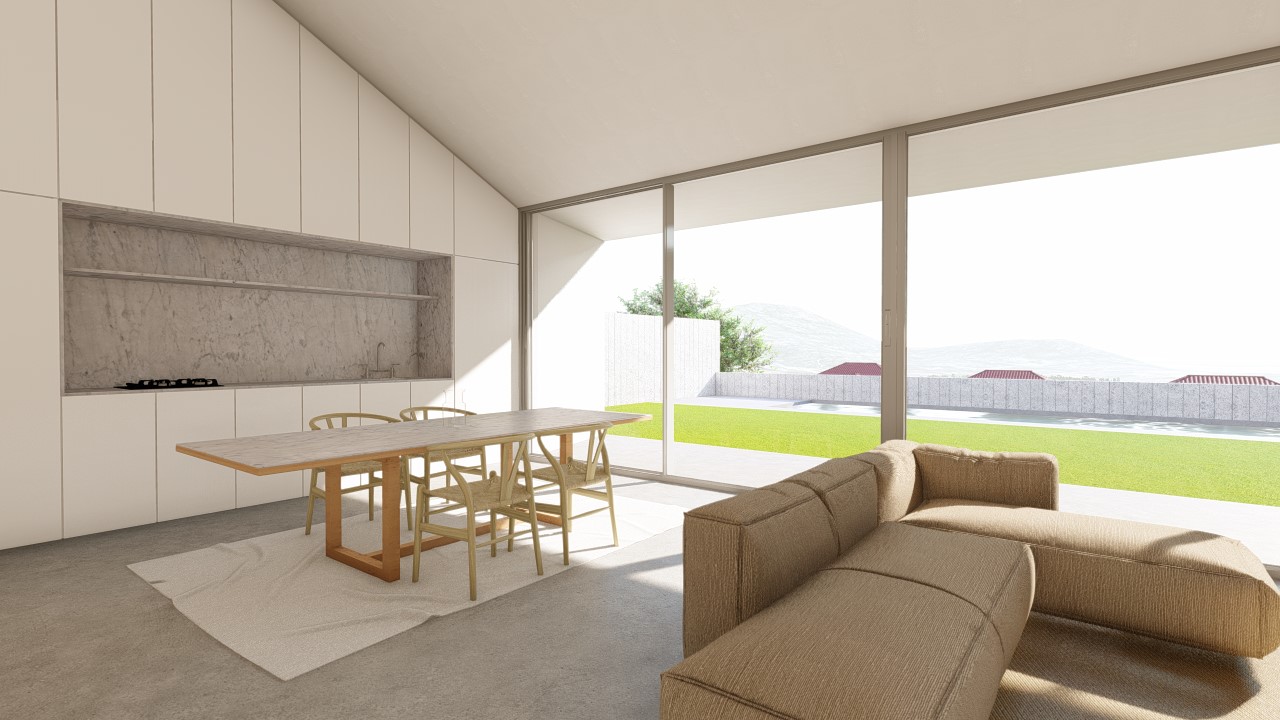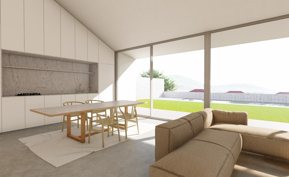 El salón comedor con cocina integrada se abre mediante un muro de cristal al gran porche y al jardín con piscina y nos permite ver las montañas del entorno desde el sofá.