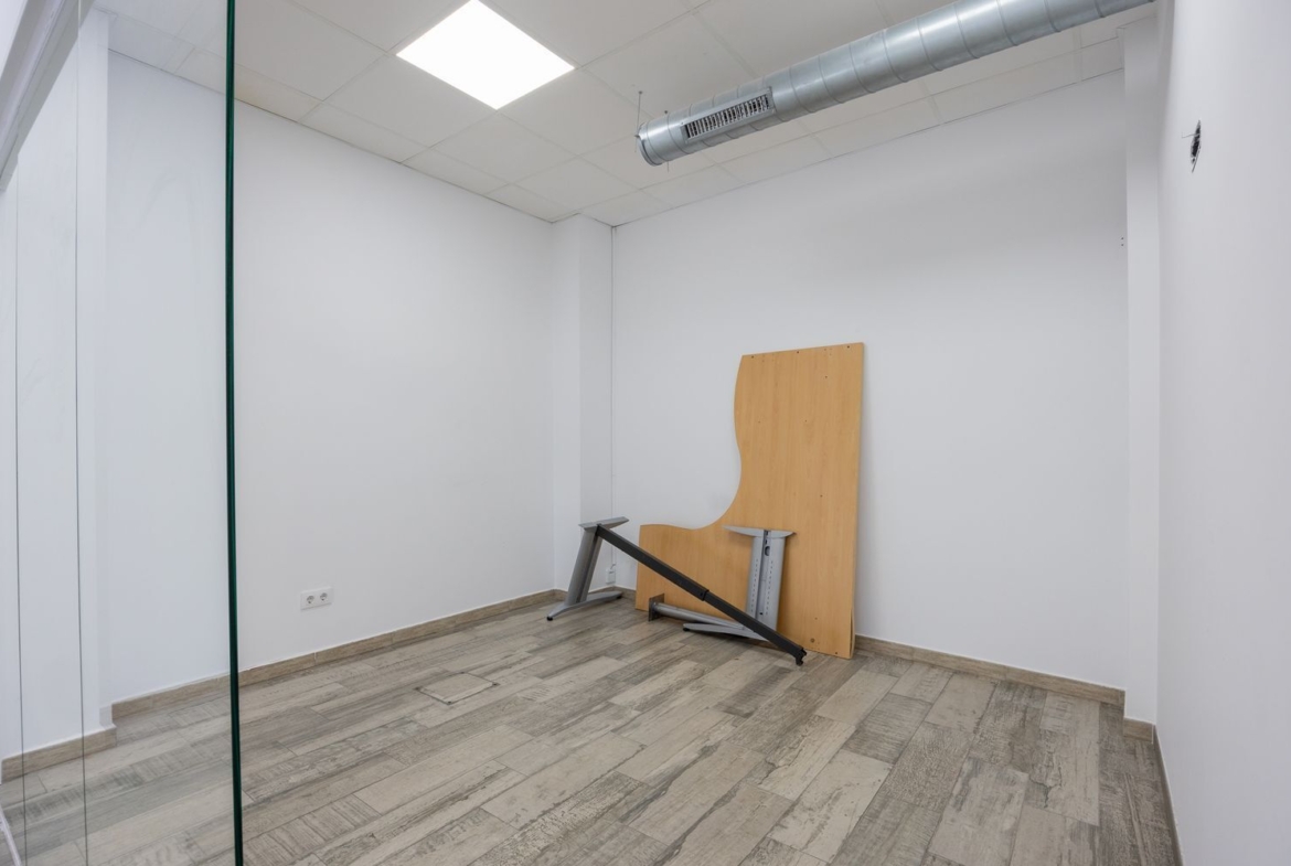 El diseño contemporáneo del local destaca por sus paredes blancas y un elegante suelo porcelánico que aporta durabilidad y estilo. Las luminarias LED empotradas en el falso techo aseguran una iluminación óptima, creando un ambiente acogedor. Con dos grandes escaparates de 4 y 3 metros, tu negocio siempre estará a la vista, atrayendo a más clientes.