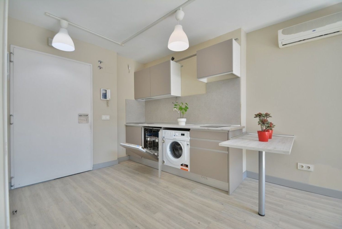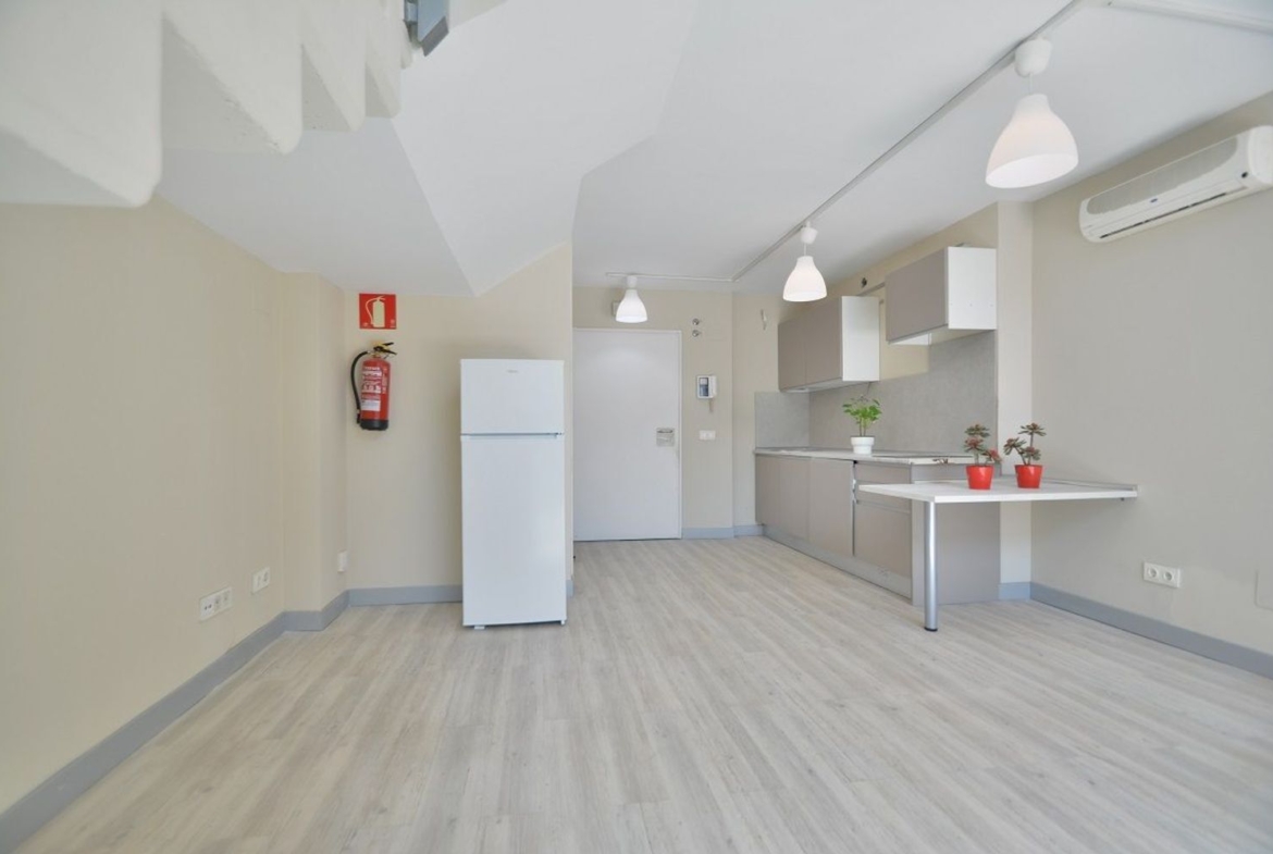Planta baja del loft: 40 m2 útiles + 5,10 m2 de terraza. Espacio diáfano con cocina prácticamente nueva, un aseo y acceso a la terraza. La cocina está equipada con los siguientes electrodomésticos: lavadora, lavavajillas, frigorífico estándar con congelador, placa vitrocerámica de 2 fuegos, microondas integrado y campana extractora.