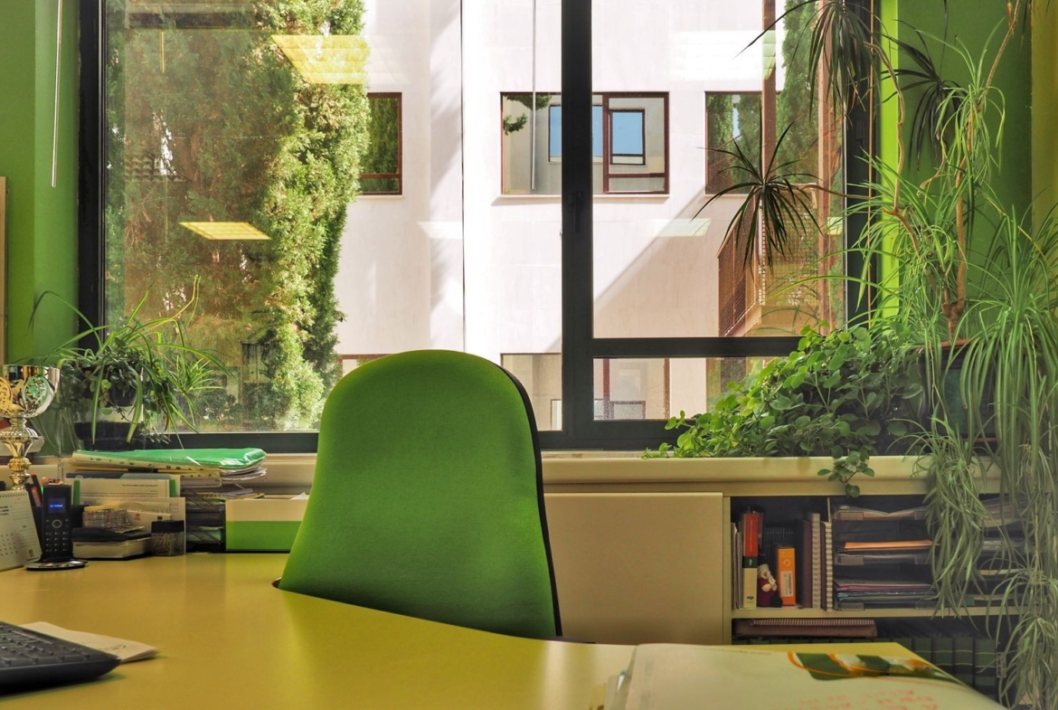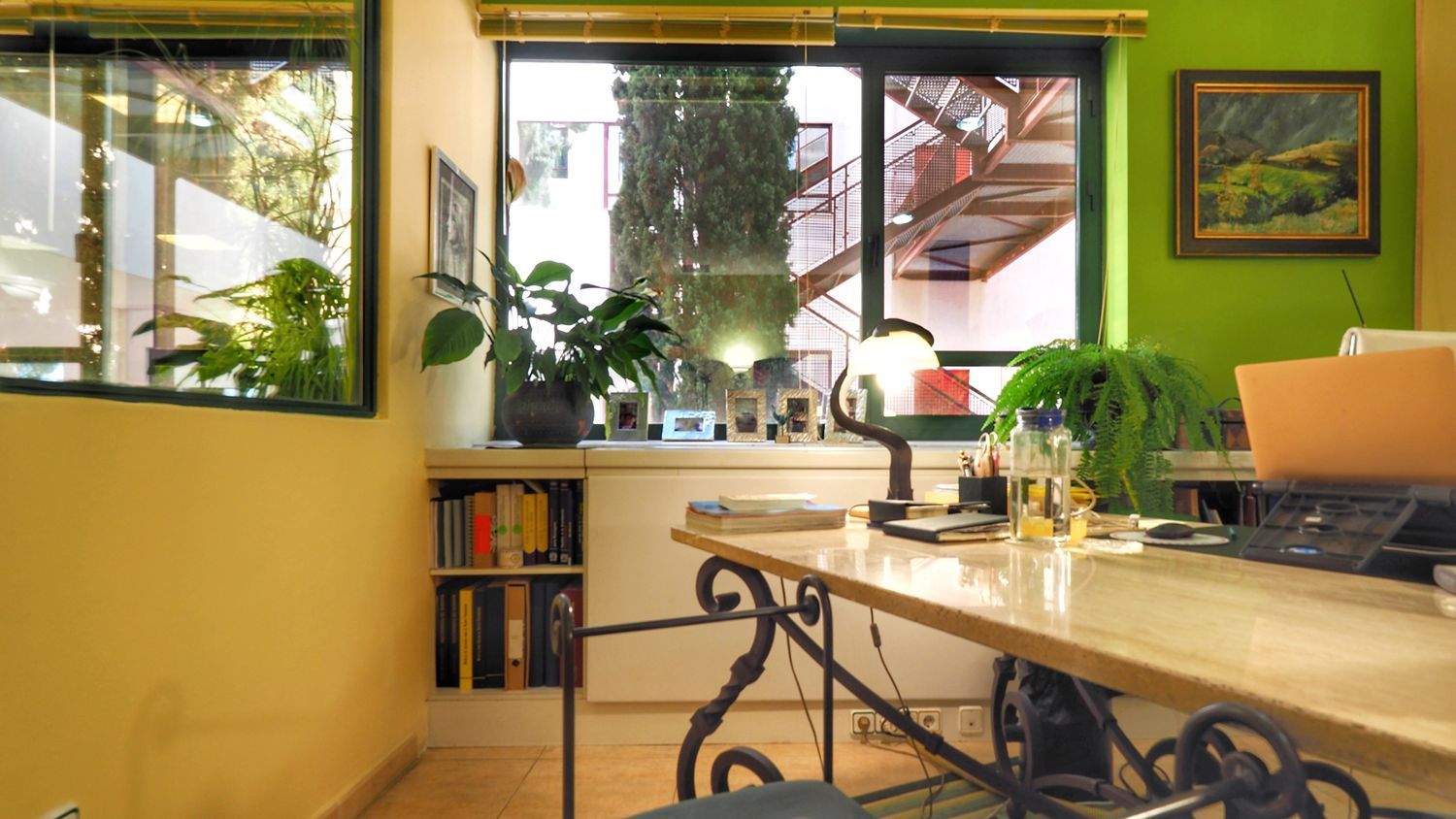 Destacar la luminosidad que ofrecen sus amplios ventanales, creando un cálido ambiente de trabajo.