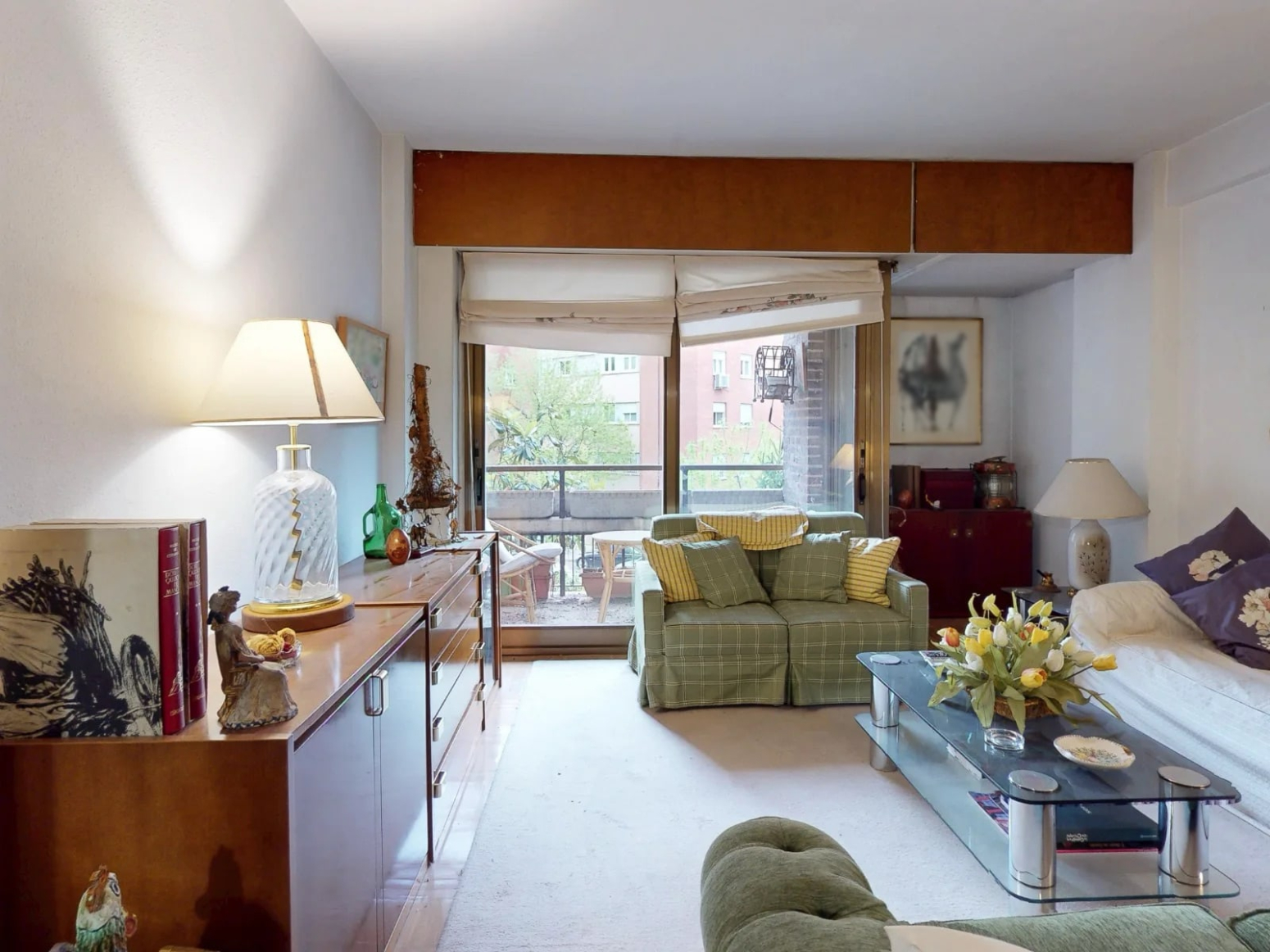 El salón-comedor, actualmente separado del recibidor por una puerta corredera, cuenta con dos ambientes, el primero es una agradable zona de estar presidida por un gran ventanal que dan acceso a la terraza, que ofrece vistas directas a la tranquila calle del Pez Volador. Comunicado con el salón se encuentra el espacioso comedor desde la cual se puede acceder por una puerta a un pasillo que da acceso a la zona de noche (los dormitorios).