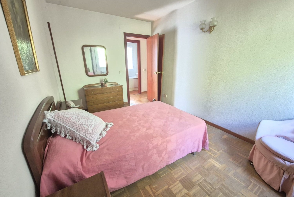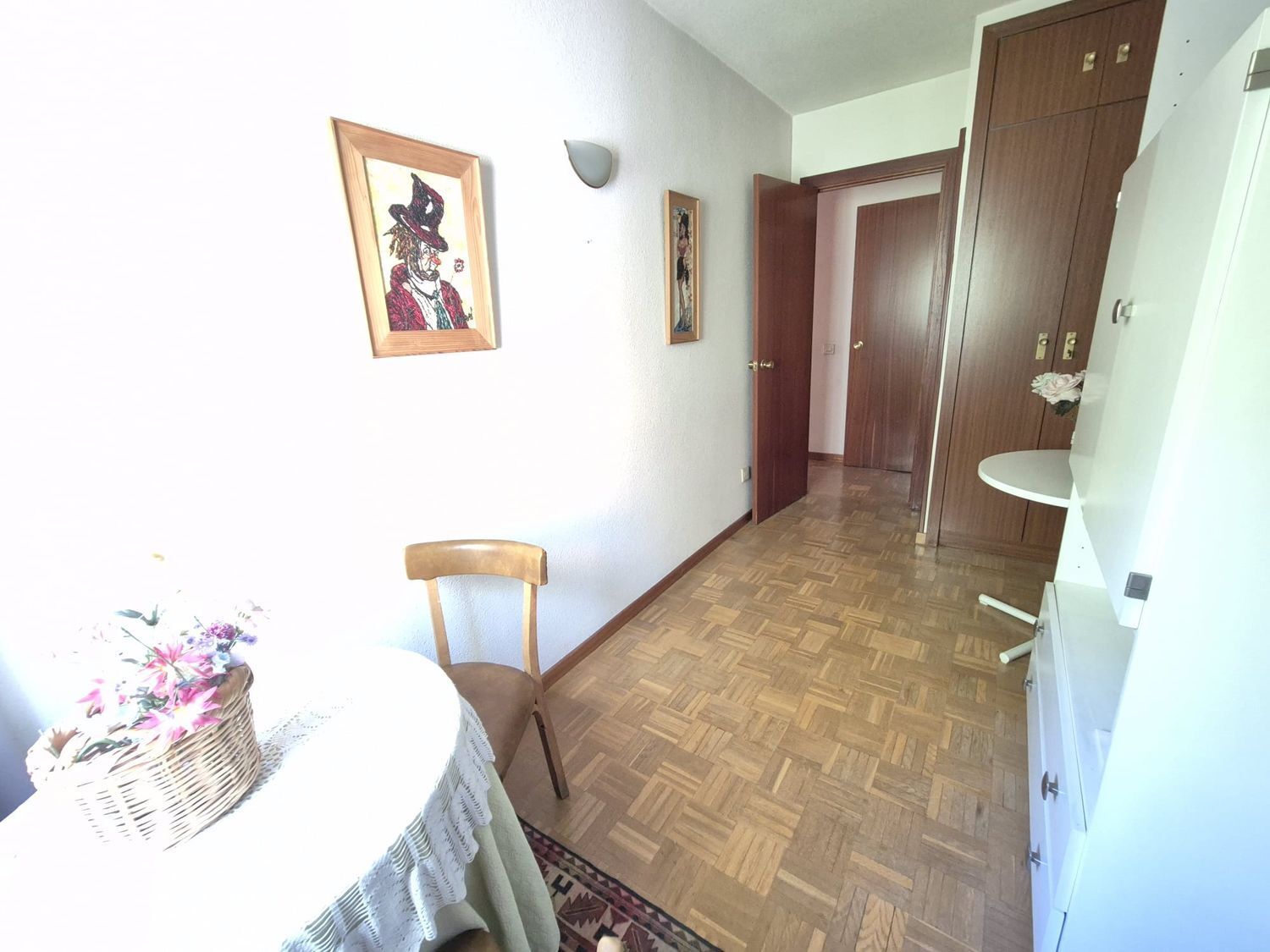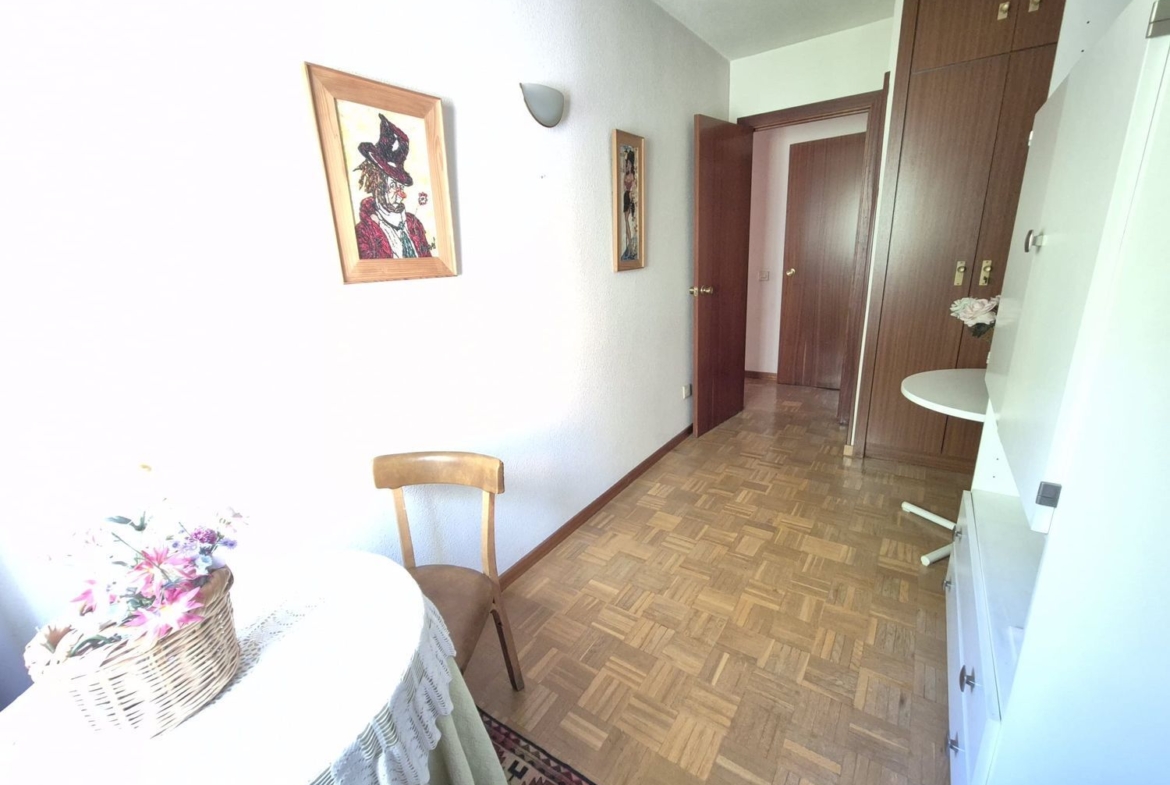 Desde el hall también accedemos a un pasillo que conecta la zona de descanso. La vivienda cuenta con tres dormitorios exteriores, lo que garantiza buena ventilación y luz natural en todas las estancias. Dos de ellos son individuales, equipados con armarios empotrados y perfectos como habitaciones infantiles, de invitados o incluso como despacho. La habitación principal destaca por su amplitud y funcionalidad, también con armario empotrado y vistas al exterior, garantizando confort y privacidad.