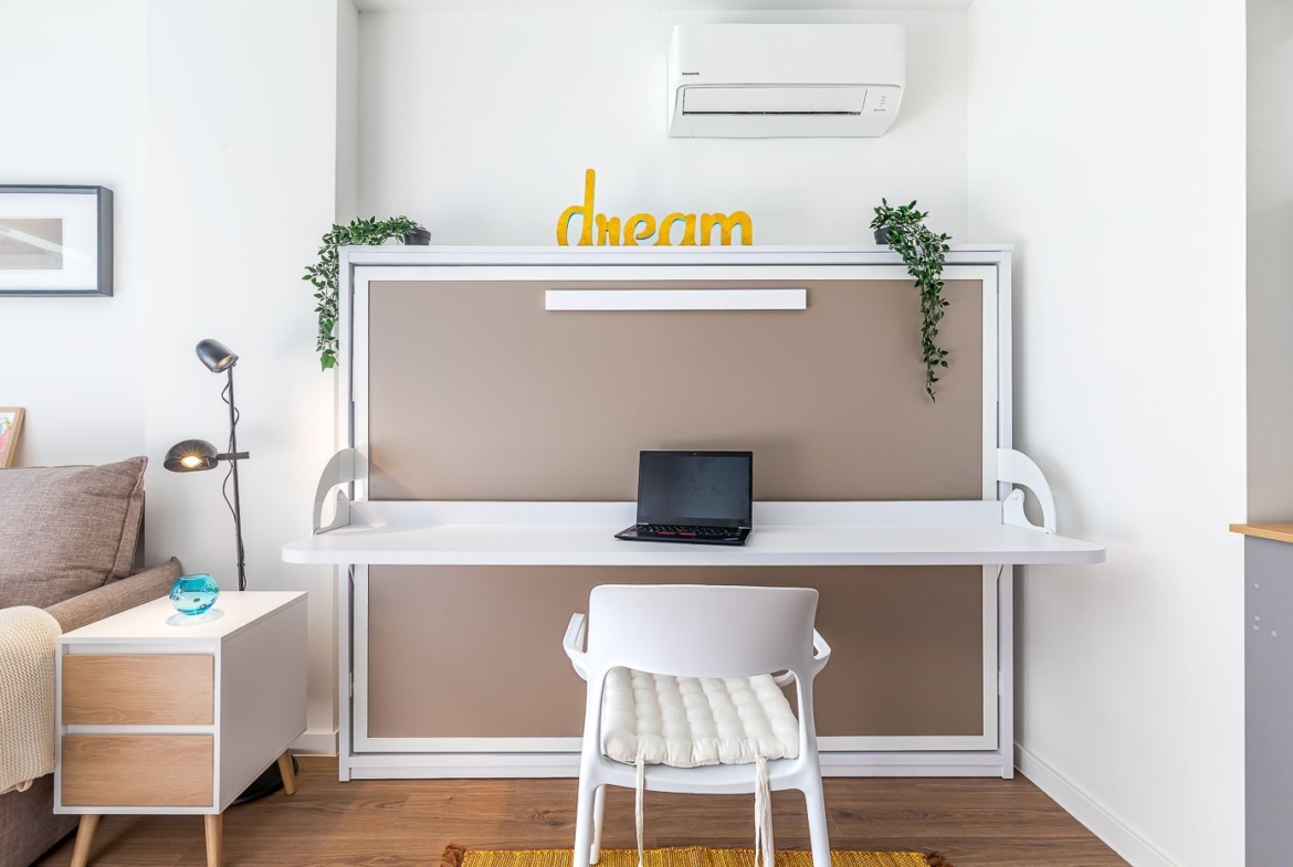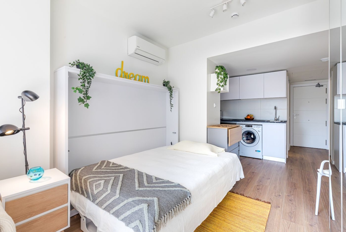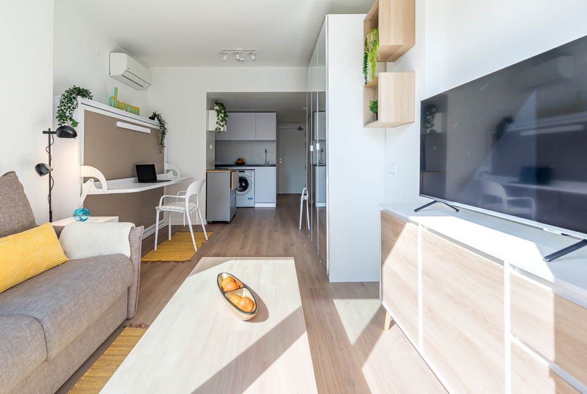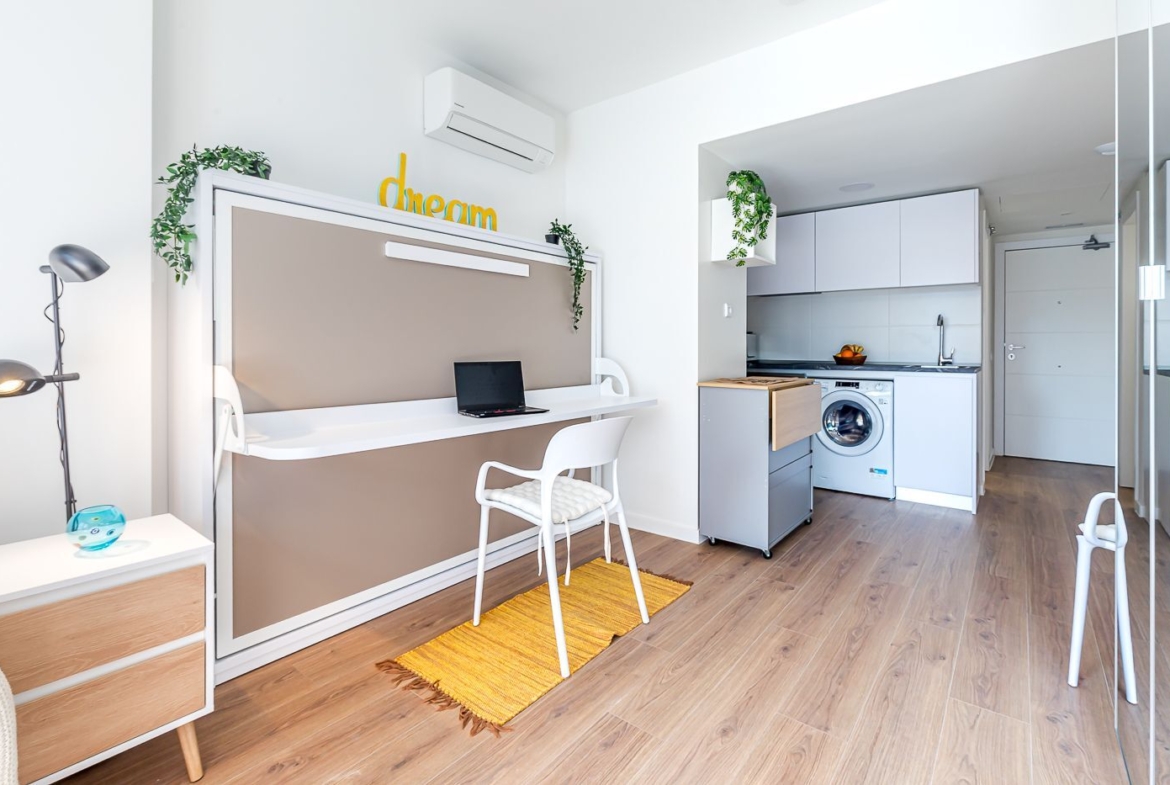 Vivienda-Estudio tipo Loft en Urbanización cerrada de Lujo, a estrenar, distribuida en un único espacio multifuncional, con un amueblamiento único incluido en el alquiler que permite su utilización como zona de día, de trabajo o de noche. Cocina completamente equipada y amplia terraza.