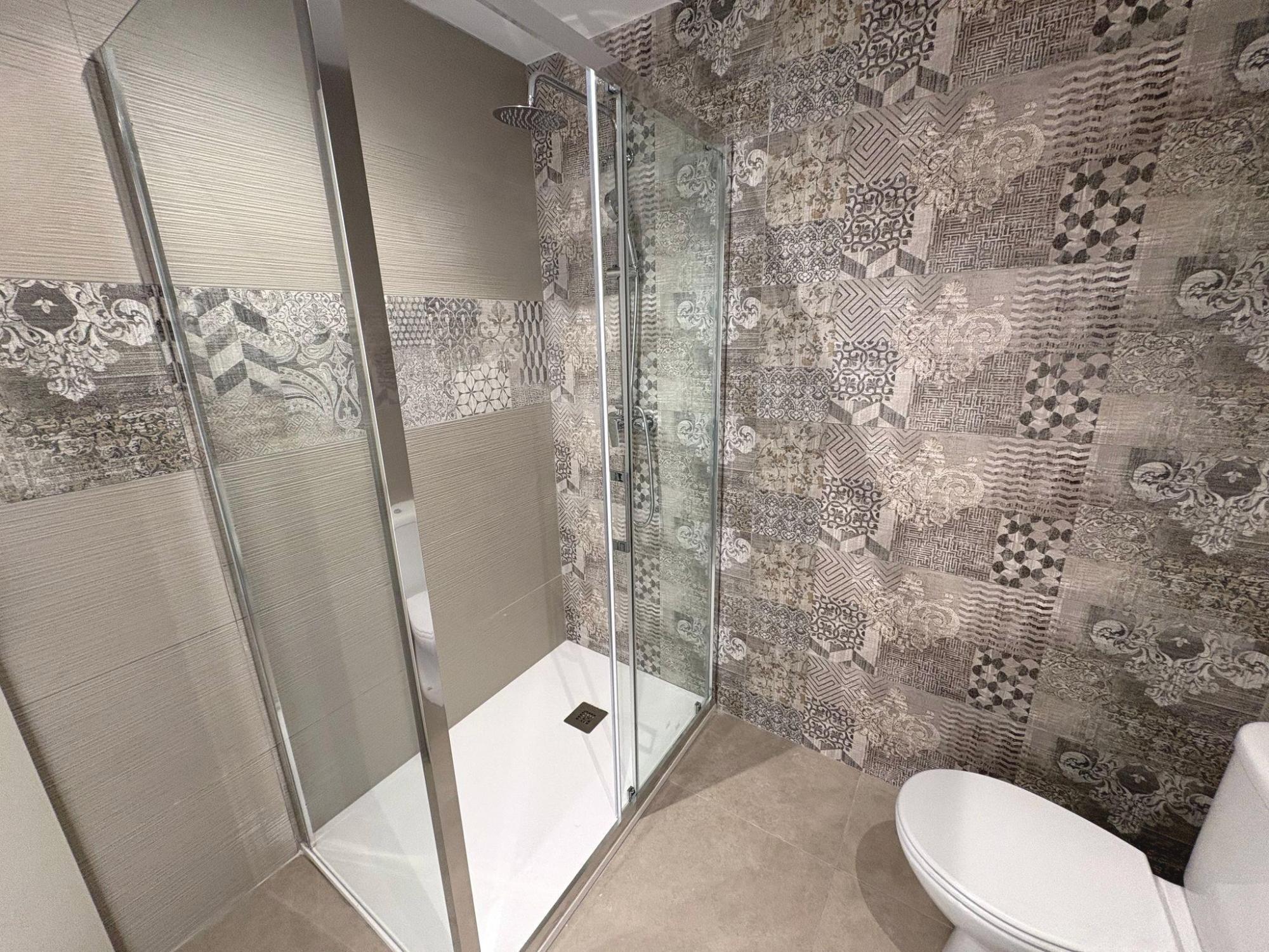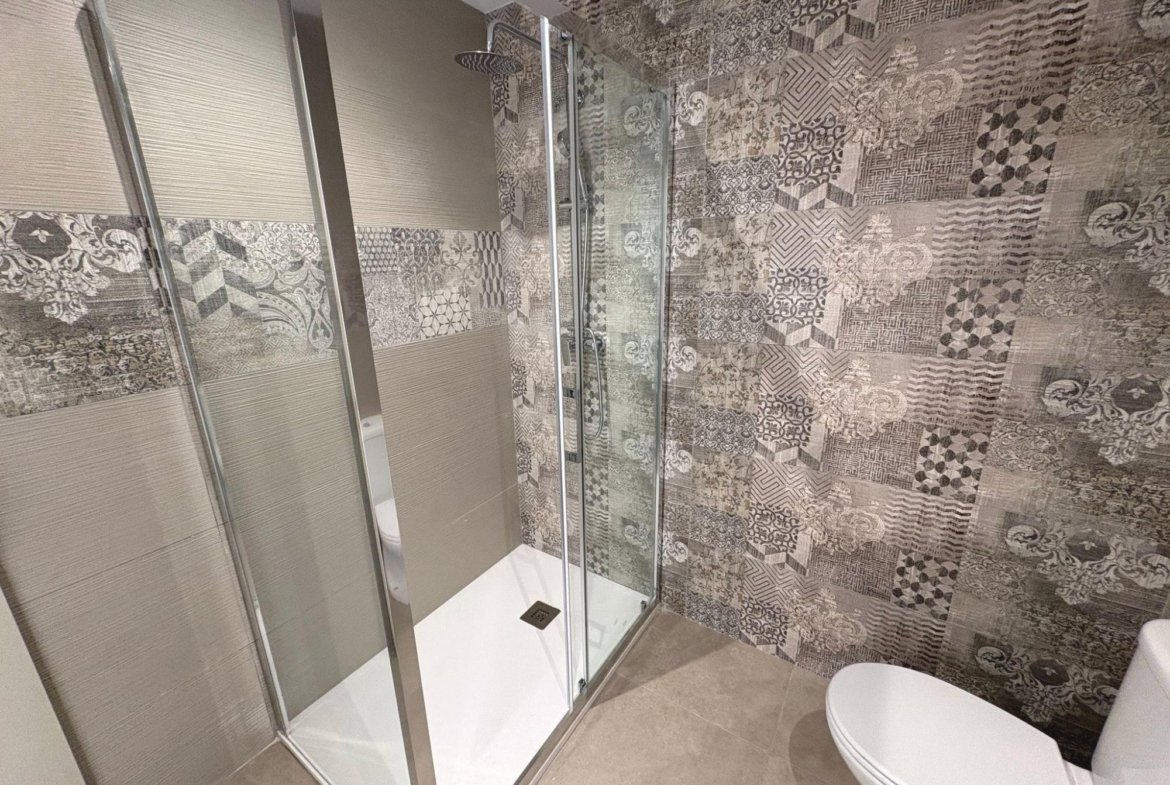 Baño completo con moderno plato de ducha, funcional y bien aprovechado.