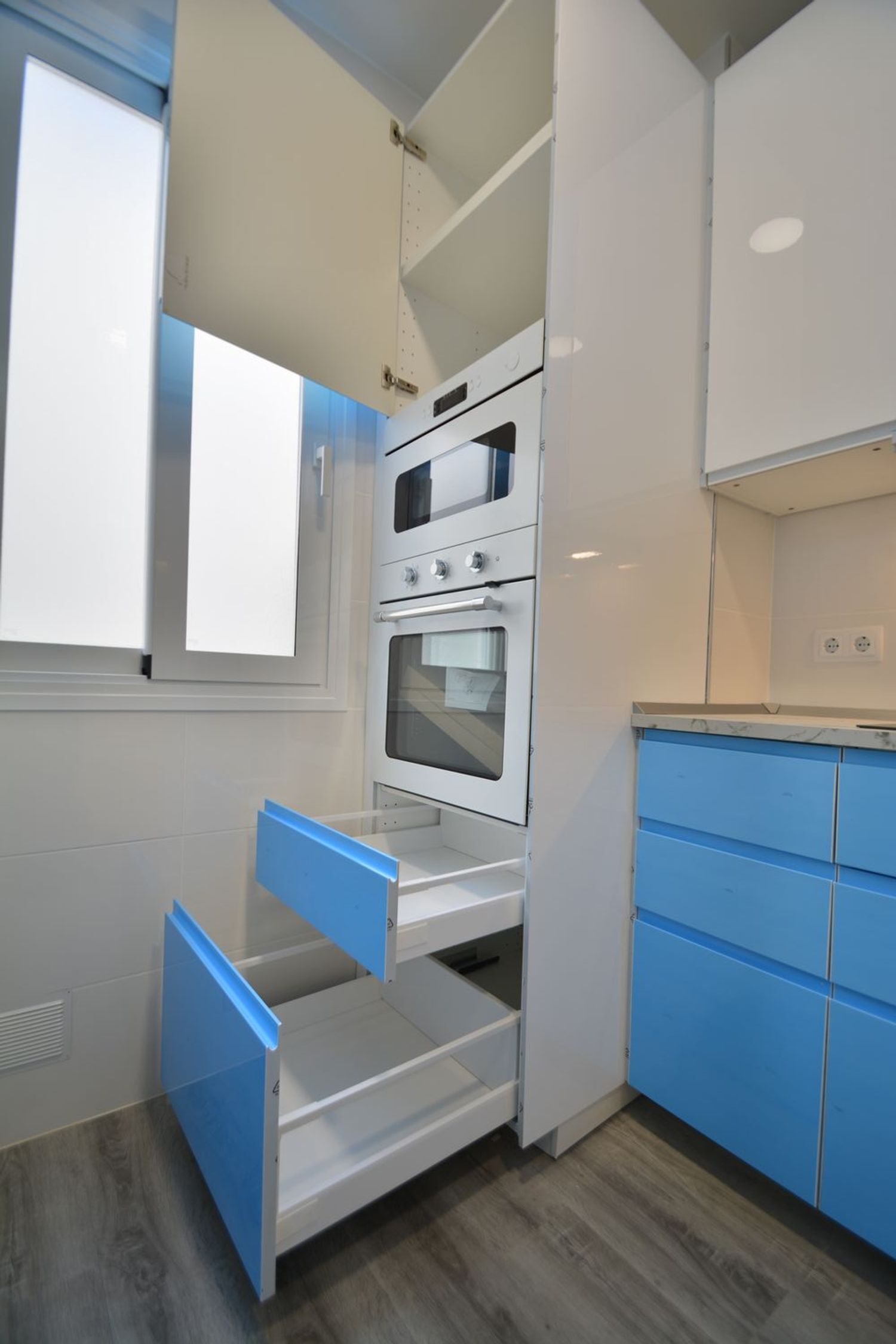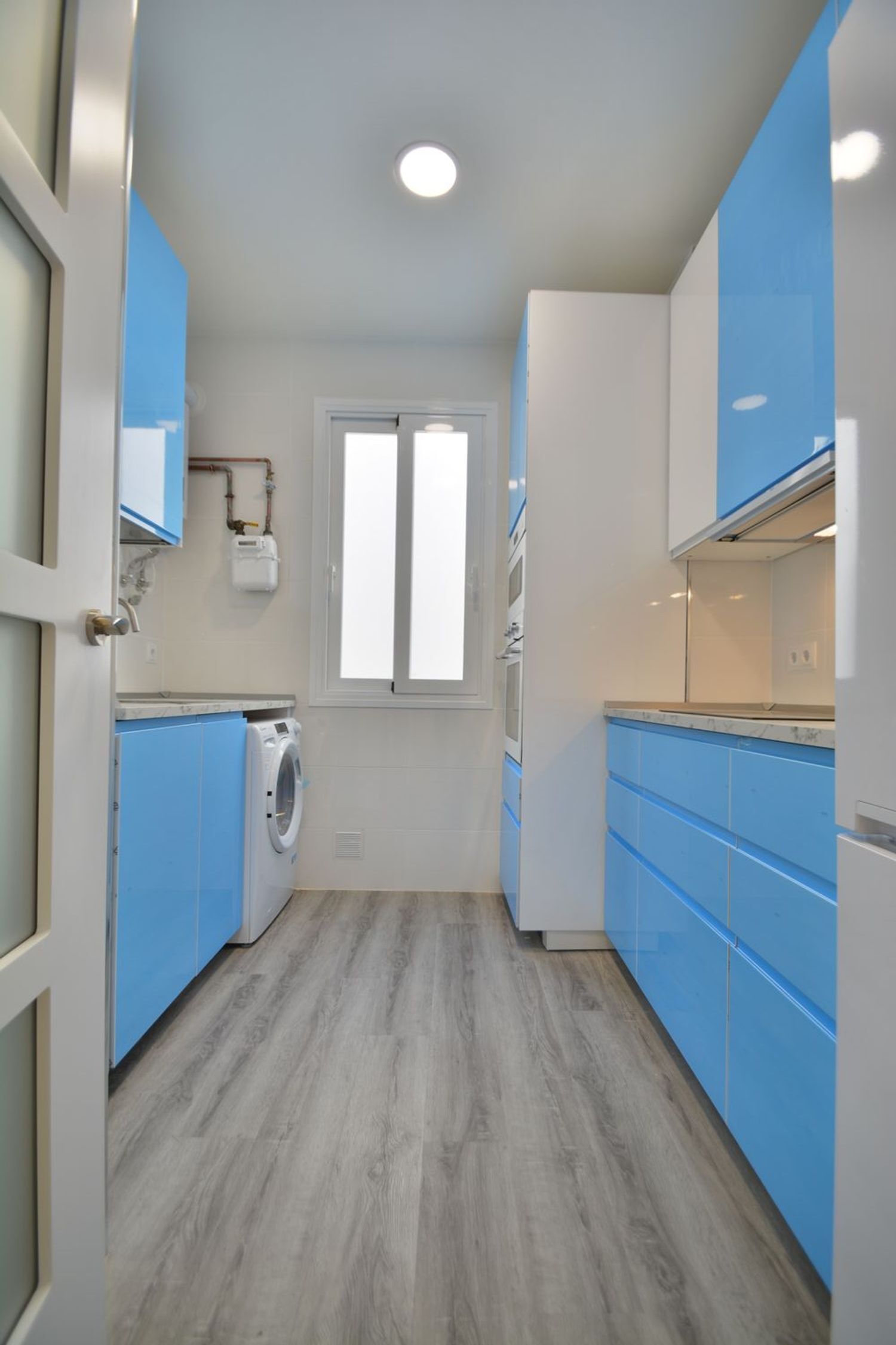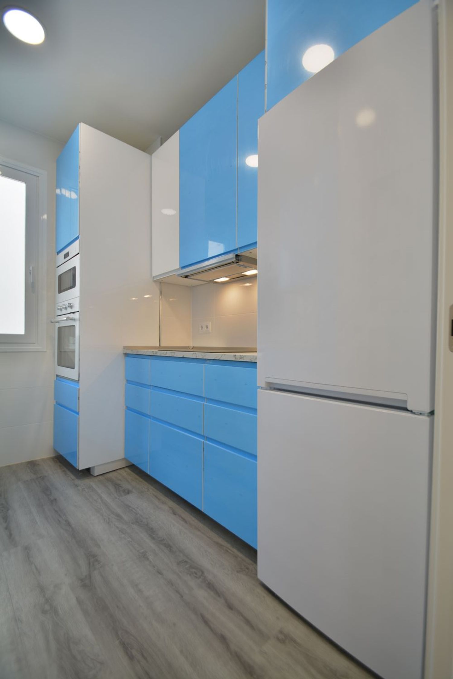 -Cocina amueblada y equipada con todos los electrodomésticos: frigorífico combi, lavadora, lavavajillas panelado, horno y microondas en torre, placa vitrocerámica y campana extractora oculta.