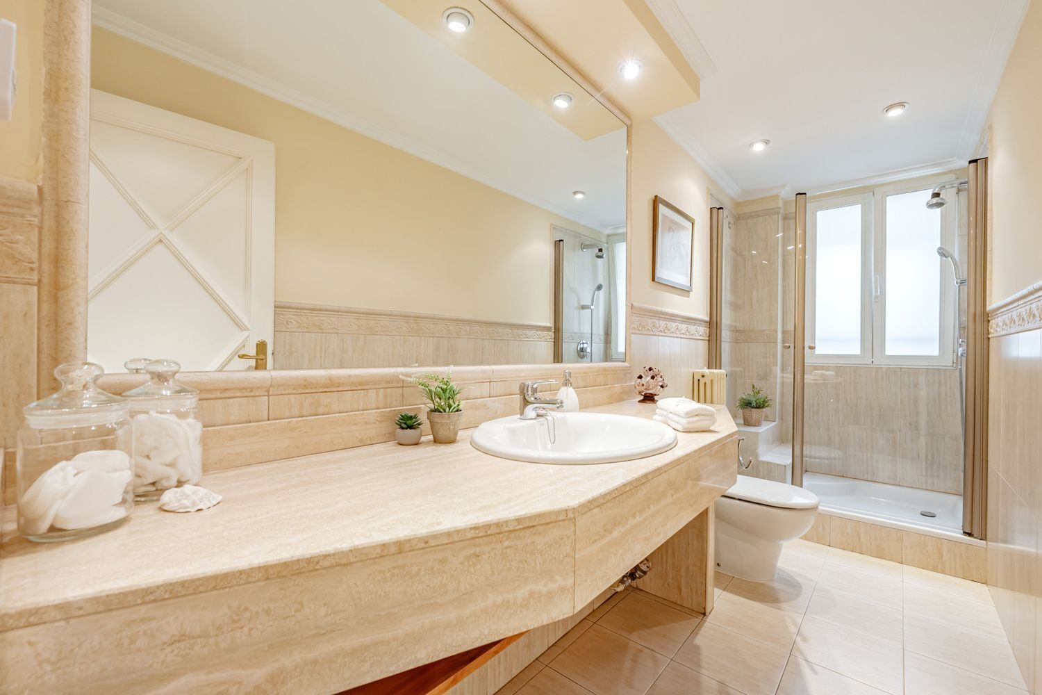 BAÑO 2, completo con ducha en mármol travertino, también con ventana, y con una superficie de 6 m2.