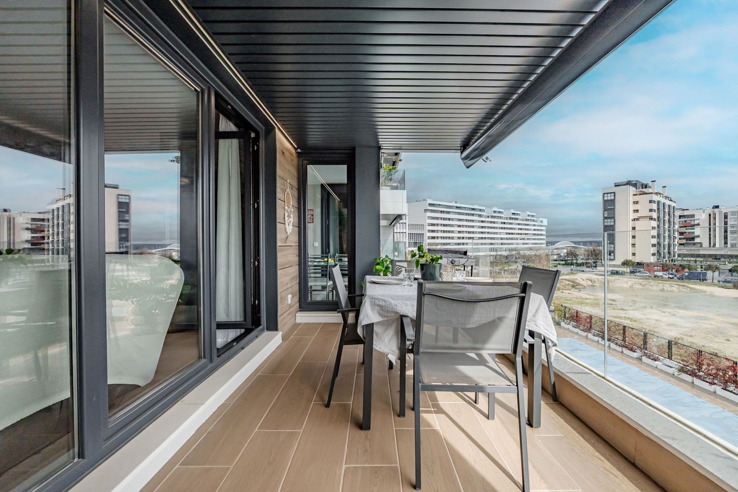 * TERRAZA de 12m2 con doble acceso (salón-cocina) con mobiliario EXTERIOR, BARBACOA, toma de agua y electricidad, línea de ILUMINACIÓN LED, suelo de resina imitación madera y barandilla de vidrio.