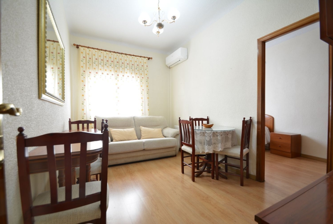 Piso amueblado y equipado, para entrar a vivir, con 2 dormitorios y 1 baño en primera planta exterior CON ascensor, doble orientación Sur el salón y Norte la cocina. Edificio de los años 60 en perfecto estado y sin derramas (confirmar). Portal recién reformado, impecable y a estrenar, puerta de entrada al portal nueva. Tan sólo 3 vecinos por planta en 4 plantas (baja + 3).
