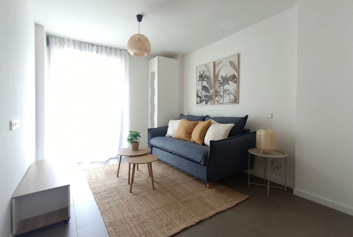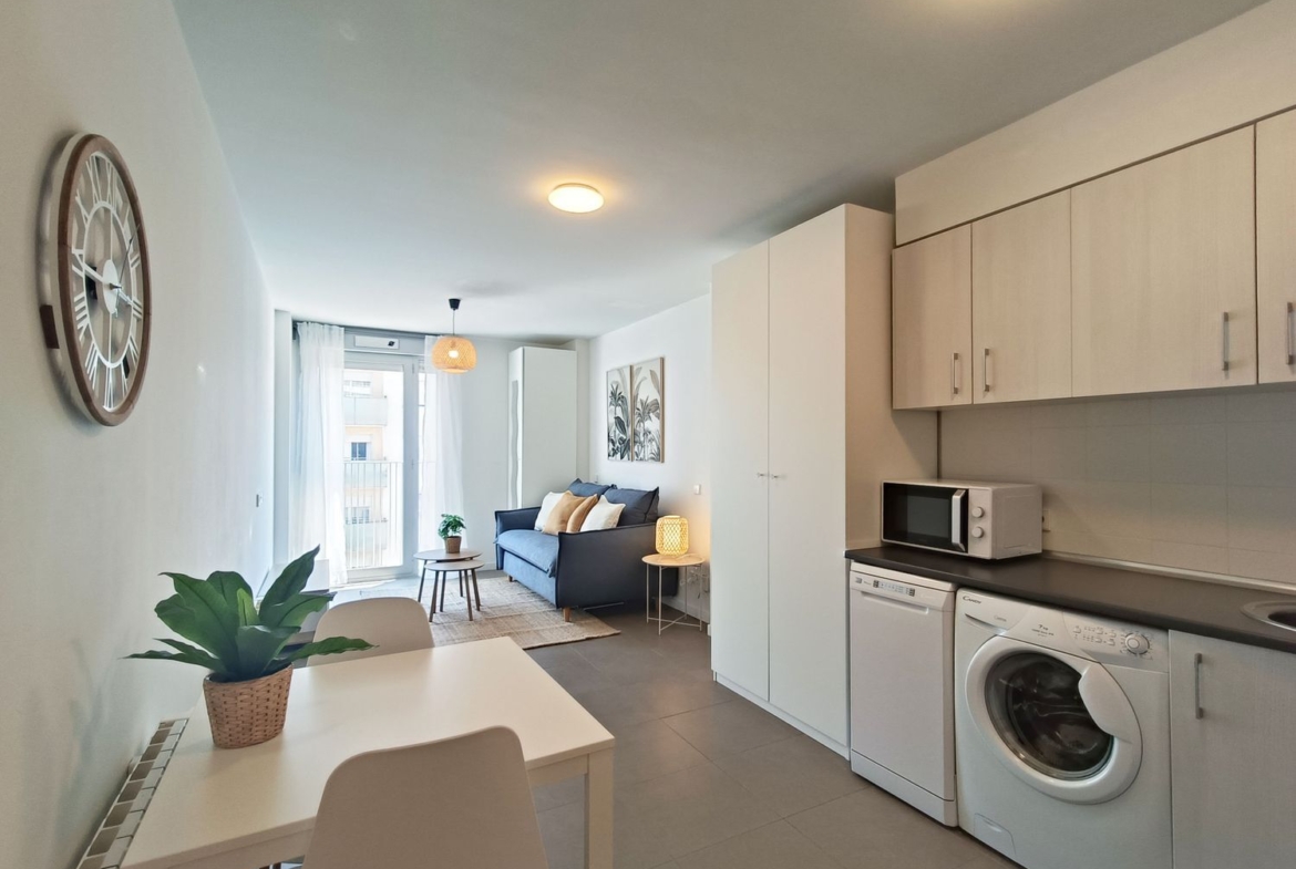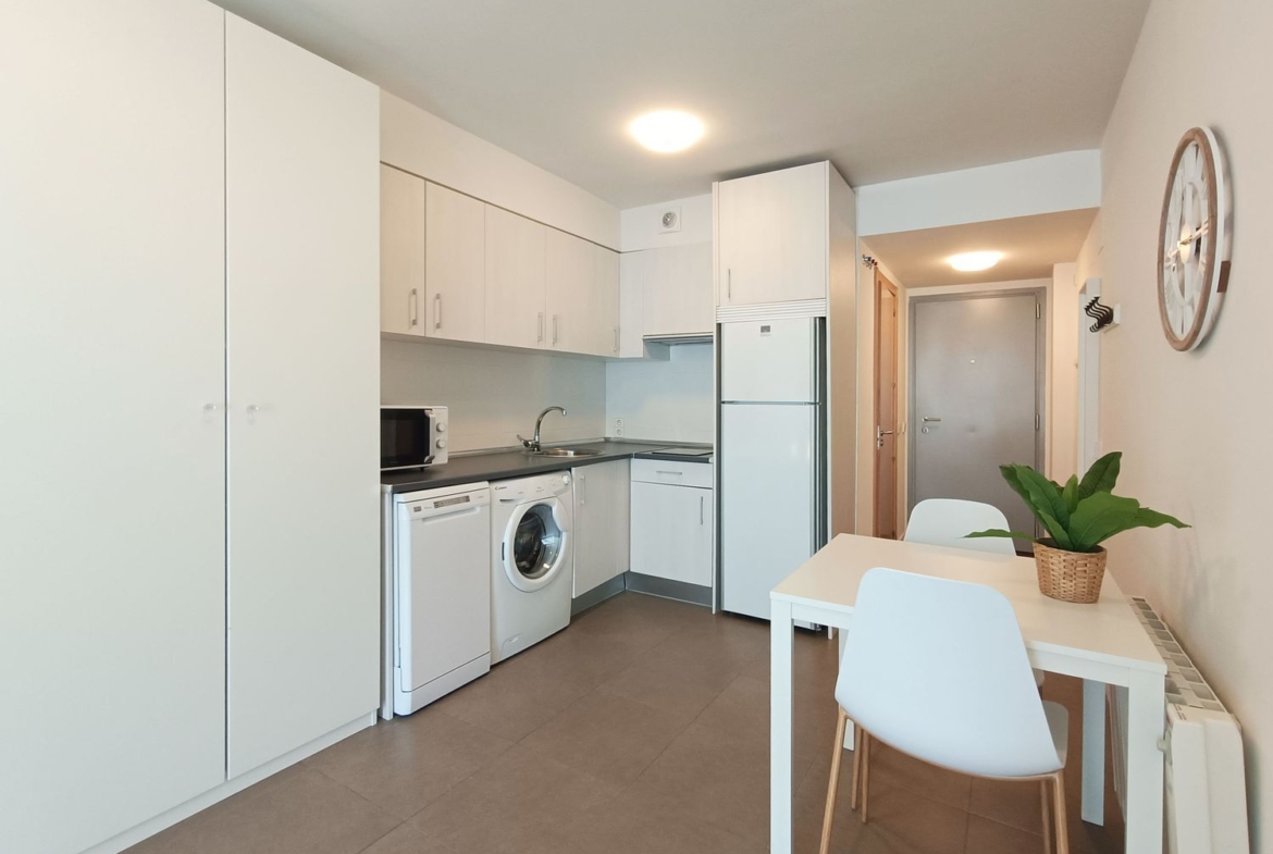 Se trata de un espacio de estar con sofá-cama (nuevo y cómodo), zona de comedor, dos armarios, cocina integrada y cuarto de baño independiente. Equipado con lavadora, lavaplatos, horno, vitro, campana, nevera y congelador, y amueblado con gusto. Se vende amueblado y decorado como sale en las fotos.