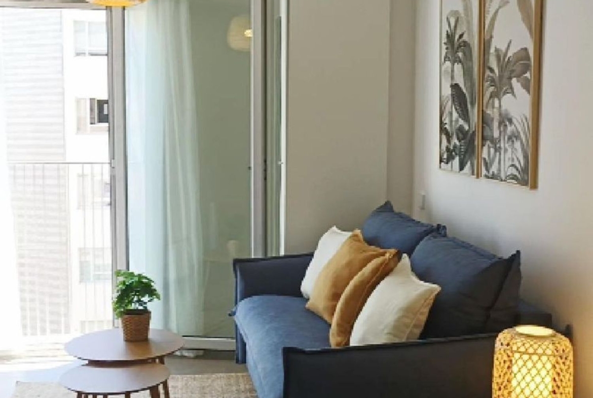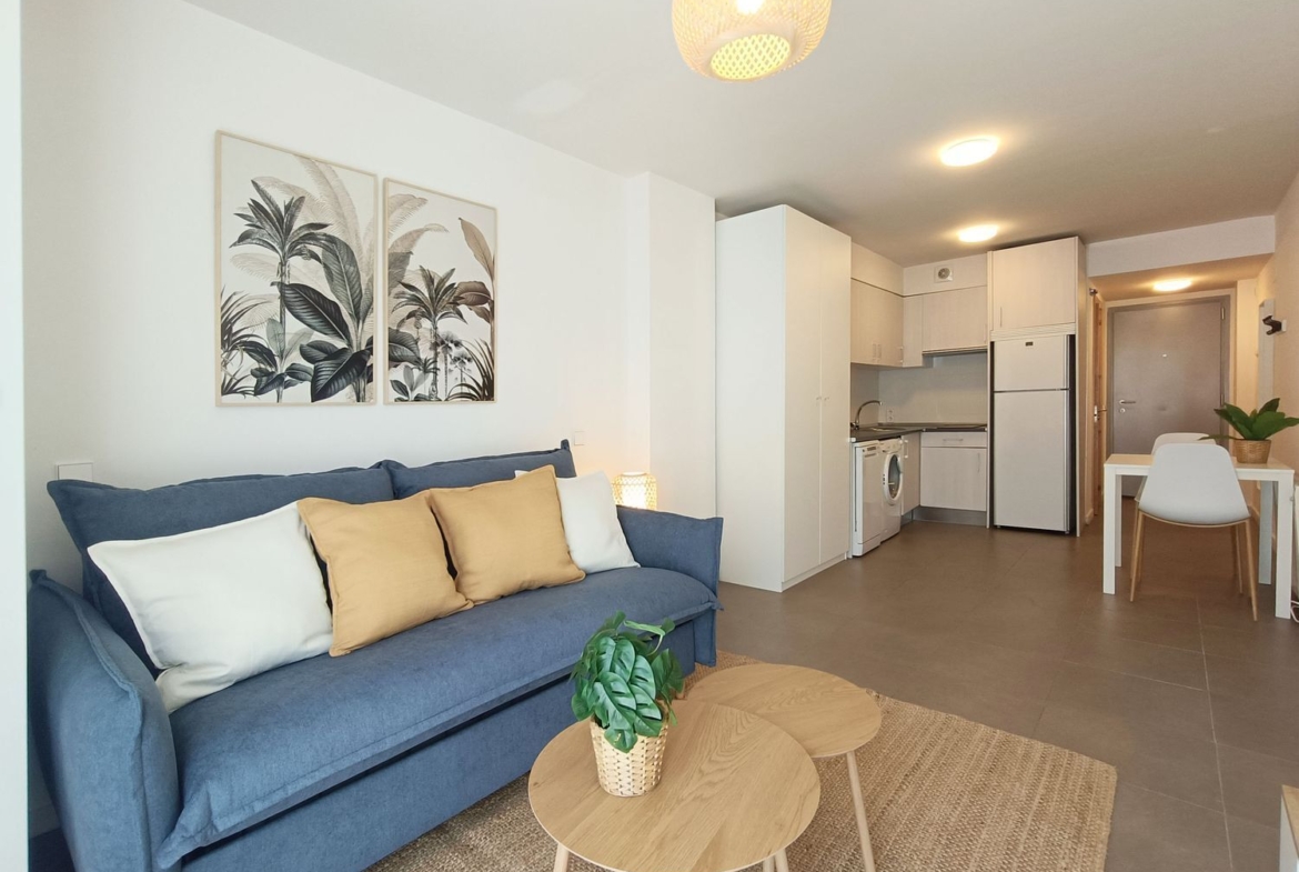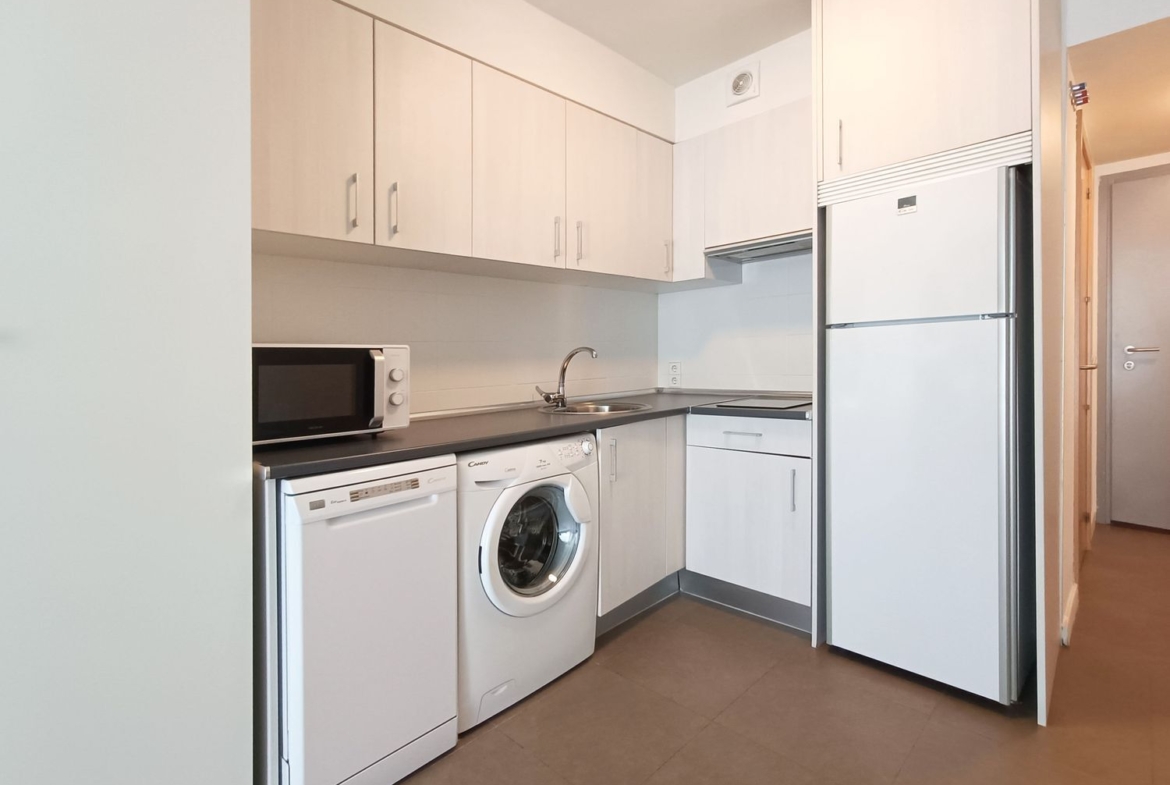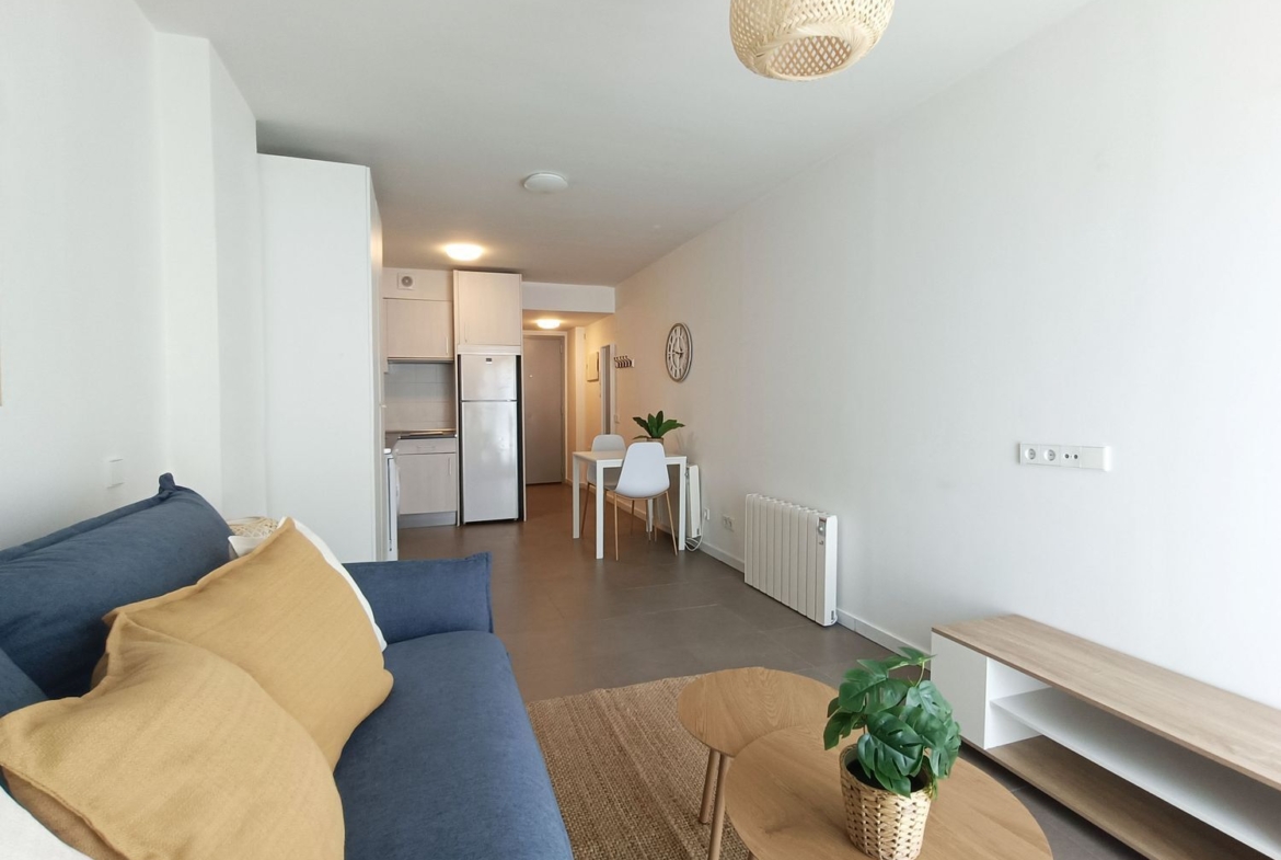 Se trata de un espacio de estar con sofá-cama (nuevo y cómodo), zona de comedor, dos armarios, cocina integrada y cuarto de baño independiente. Equipado con lavadora, lavaplatos, horno, vitro, campana, nevera y congelador, y amueblado con gusto. Se vende amueblado y decorado como sale en las fotos.