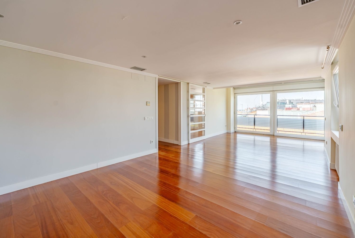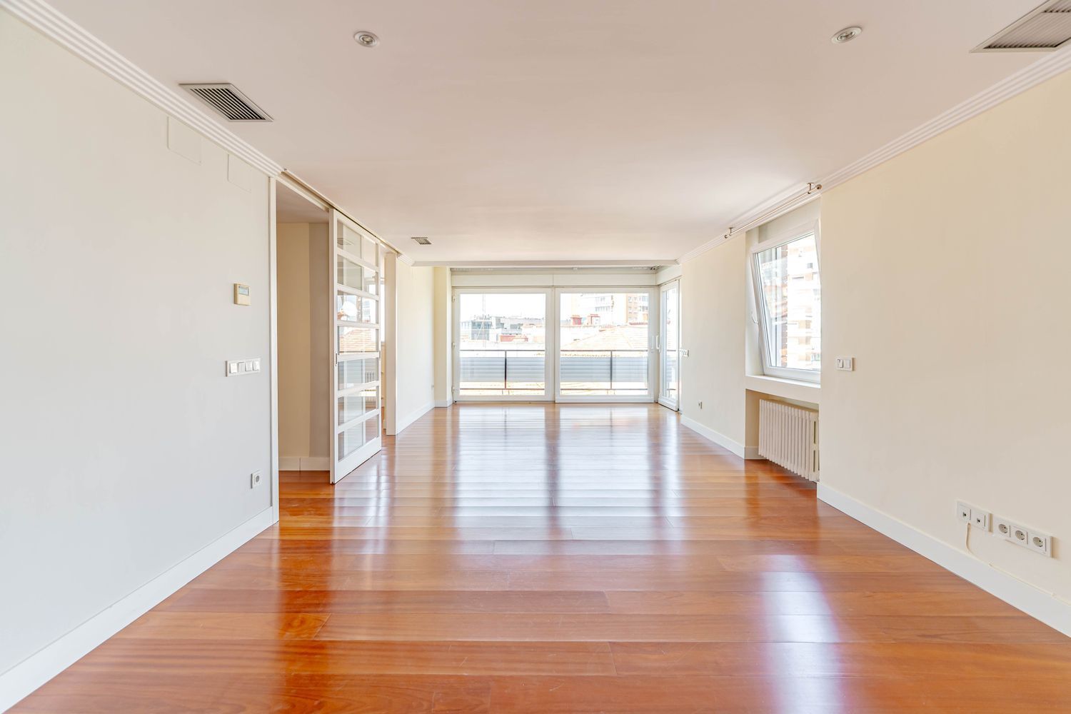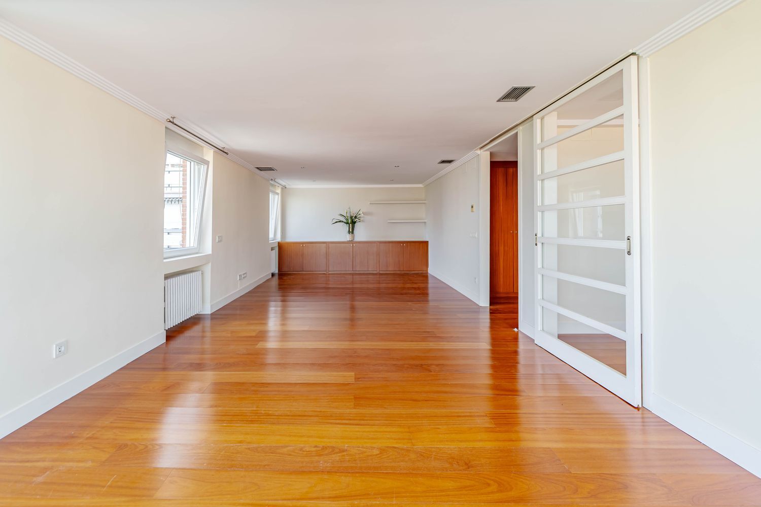 Se accede a la vivienda a través de un coqueto hall de entrada y a la derecha se encuentra un luminoso y amplio SALÓN-COMEDOR de 40 m² de grandes ventanales con sala despacho colindante de 12 m2 donde se encuentra una gran librería en uno de sus laterales, con preciosas vistas a la sierra madrileña y a la calle Francisco de Sales.