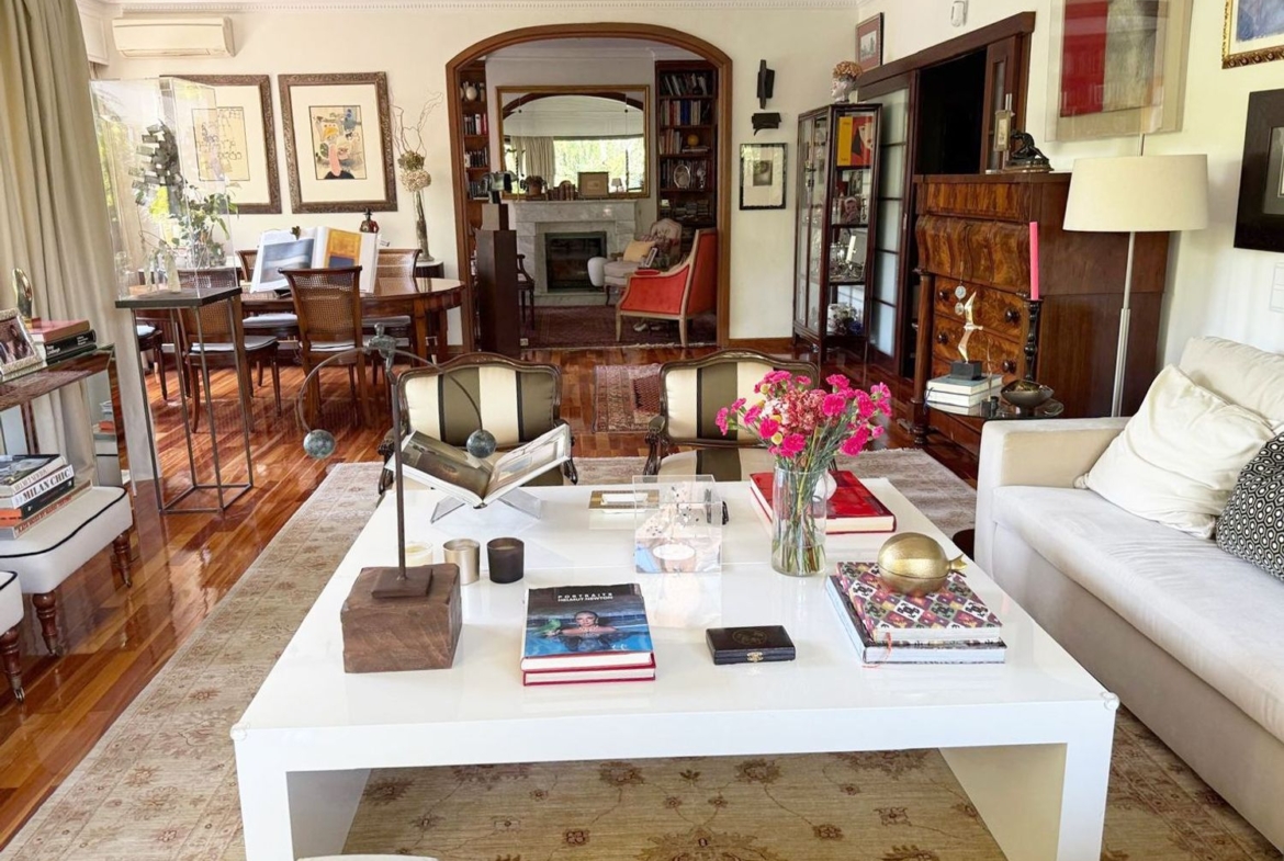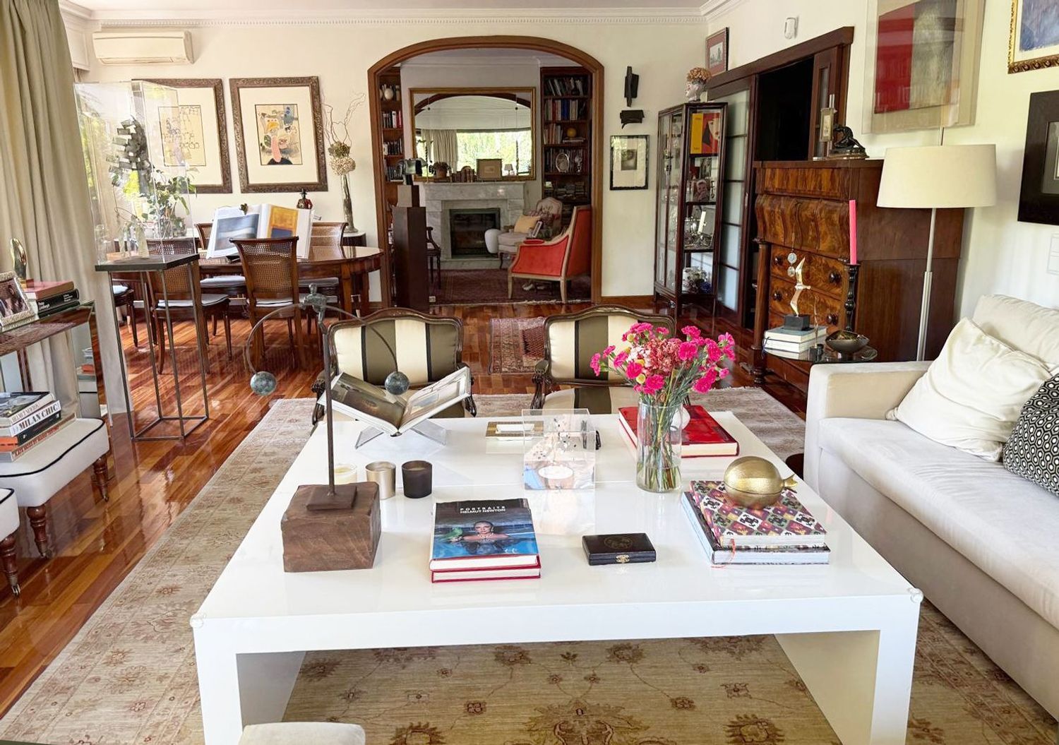 El salón principal, dividido en tres ambientes claramente diferenciados, es el alma de la casa. Bañado en luz natural y enmarcado por las vistas al verde, este espacio acoge momentos de calma, reuniones familiares y largas sobremesas con amigos. El salón cuenta con librerías hechas a medida en madera de nogal español y una elegante chimenea en perfecto estado de uso, que aportan calidez y sofisticación. Espacio, luz y confort conviven en armonía en el auténtico corazón de la casa. La naturaleza se convierte en telón de fondo de la vida diaria.