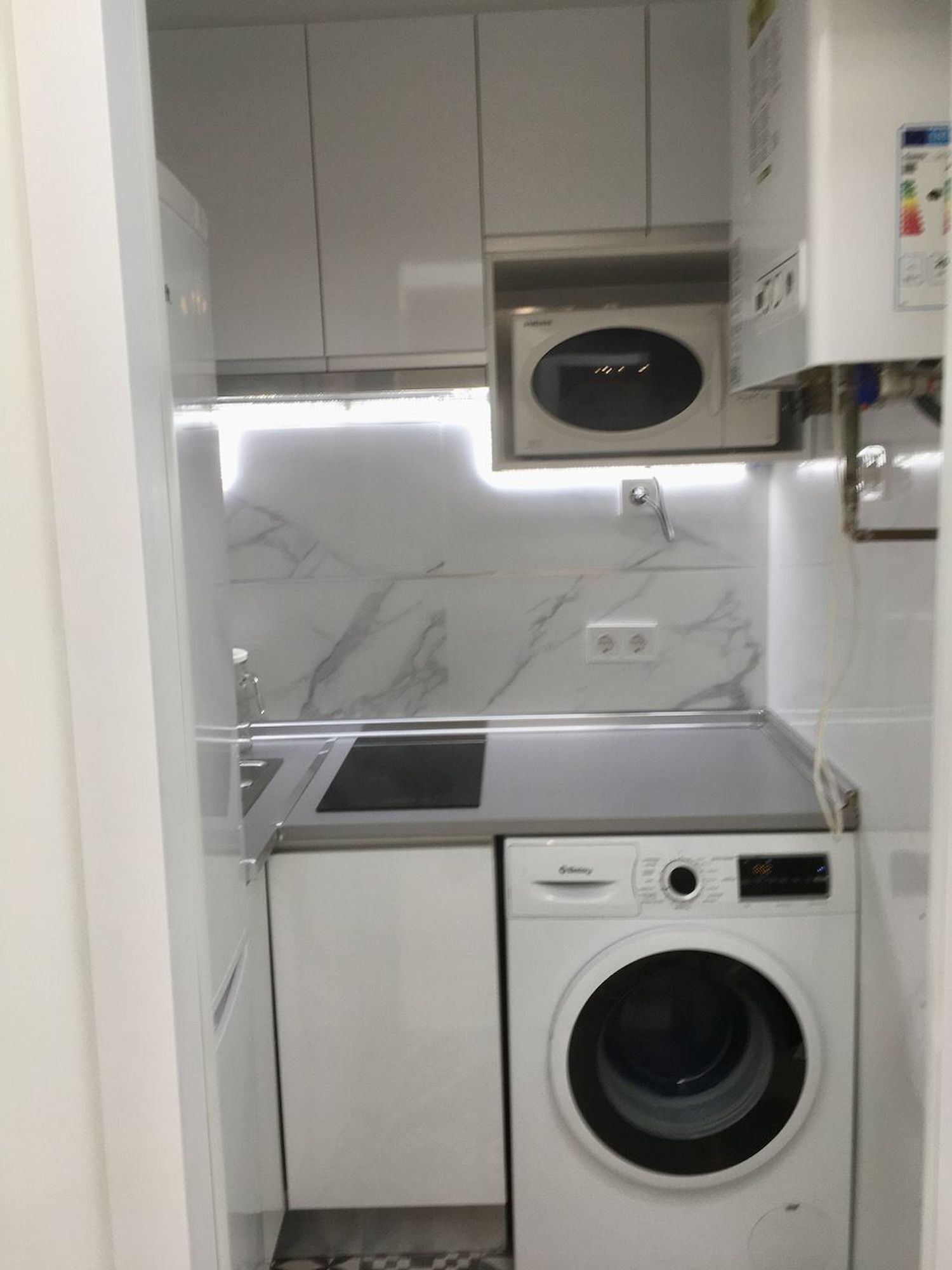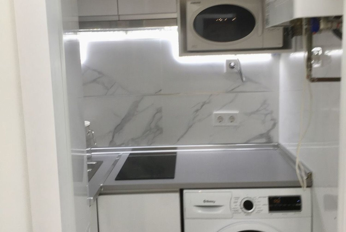 – La cocina amueblada con electrodomésticos, frigorífico, lavadora, placa de inducción, y microondas, así como menaje básico.