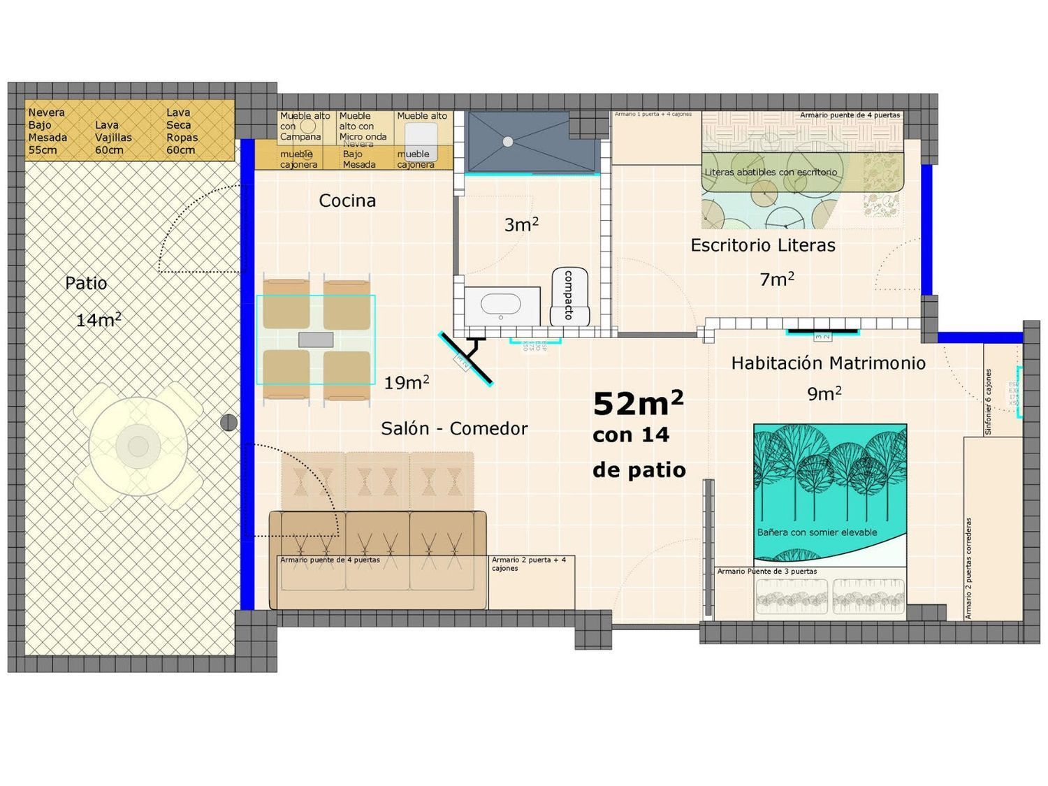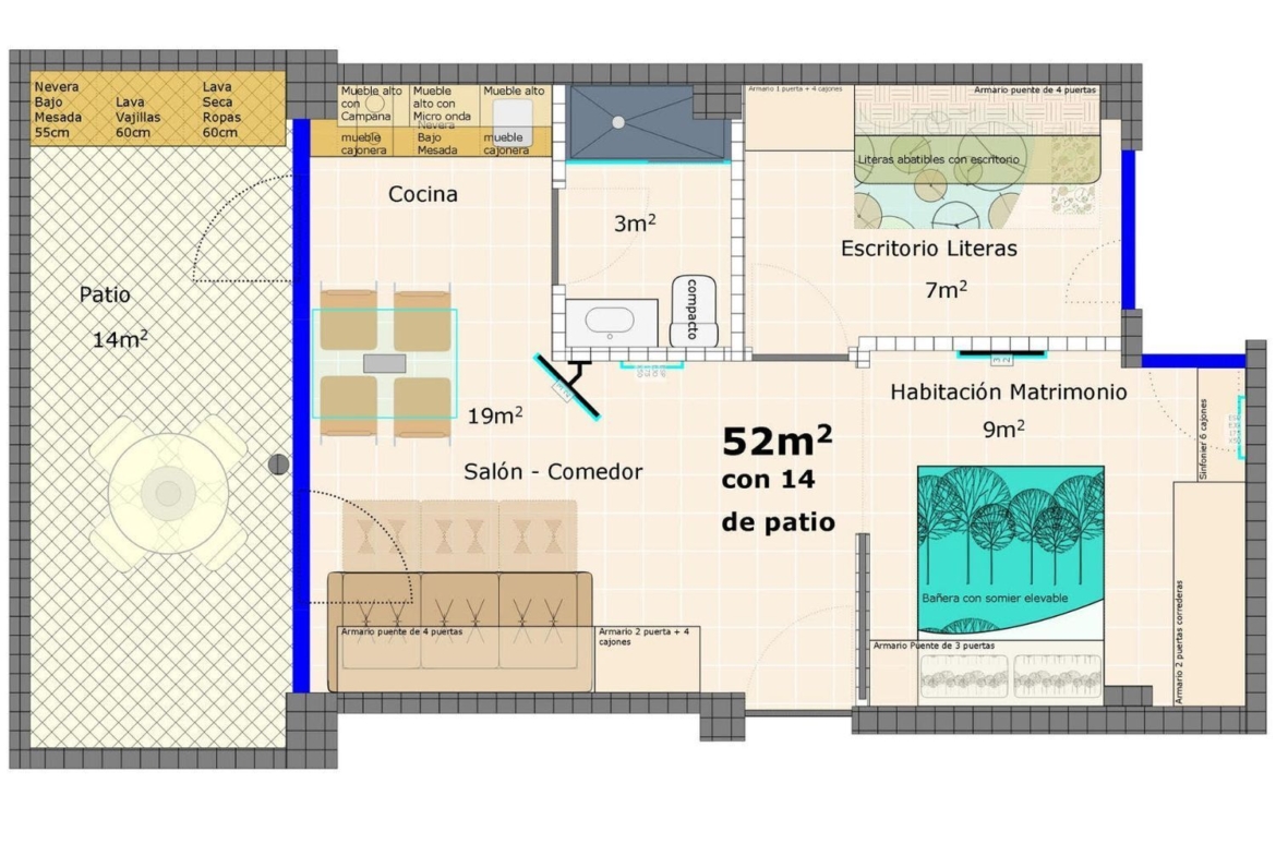 Piso bien reformado con patio, 2 dormitorios, 1 baño, amueblado, bomba de frío/calor. Lavadora secadora, frigorífico, lavavajillas, horno, placa de inducción, etc. Sofá cama, literas abatibles, armarios.