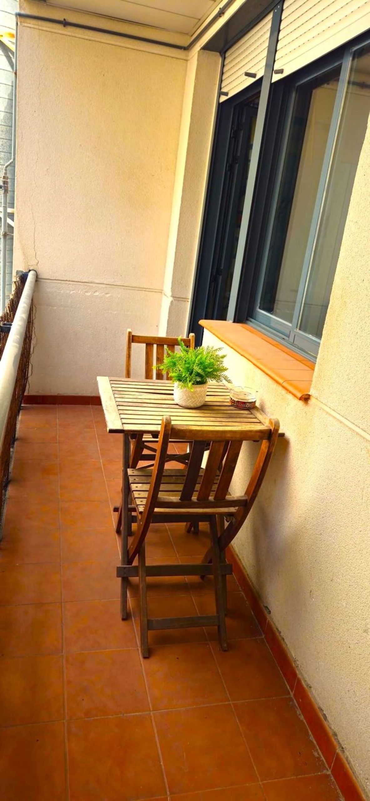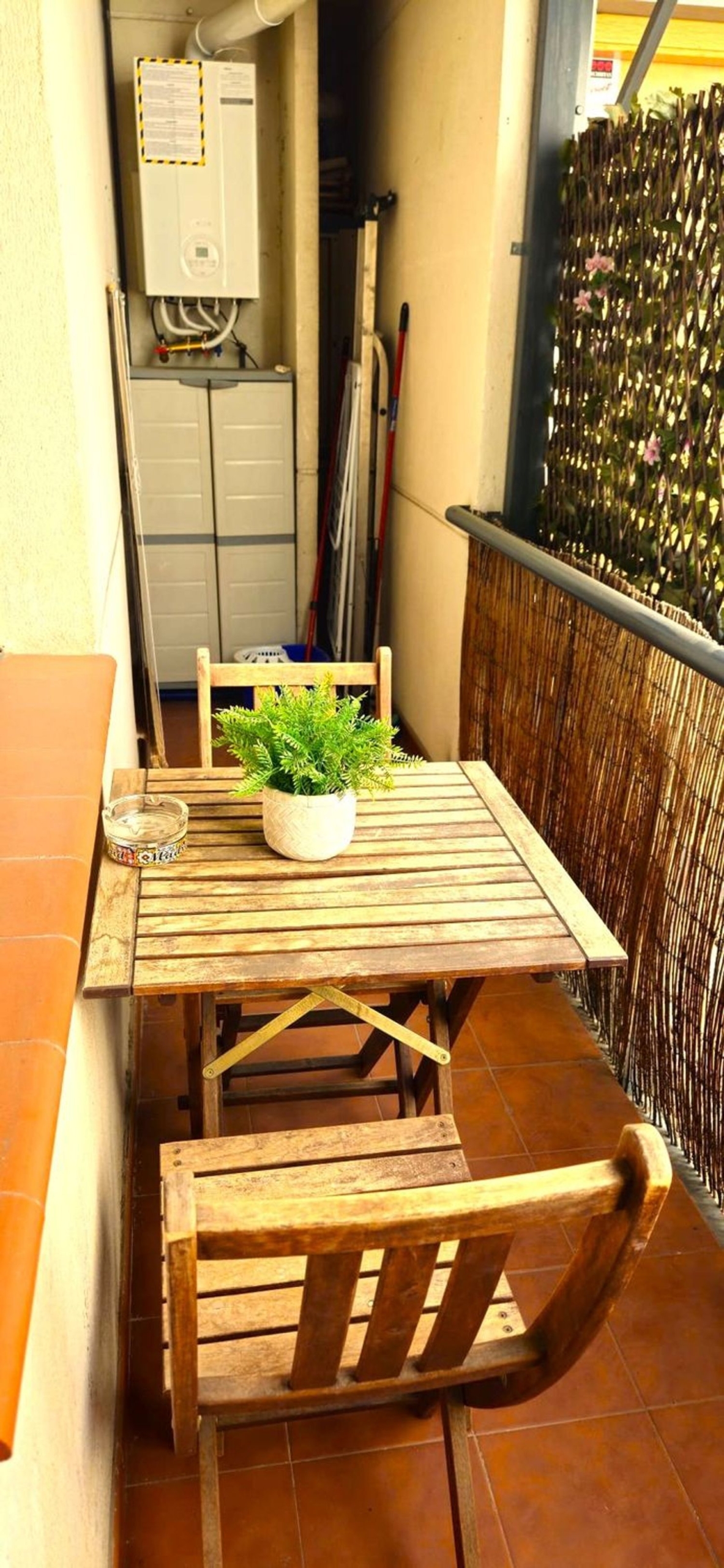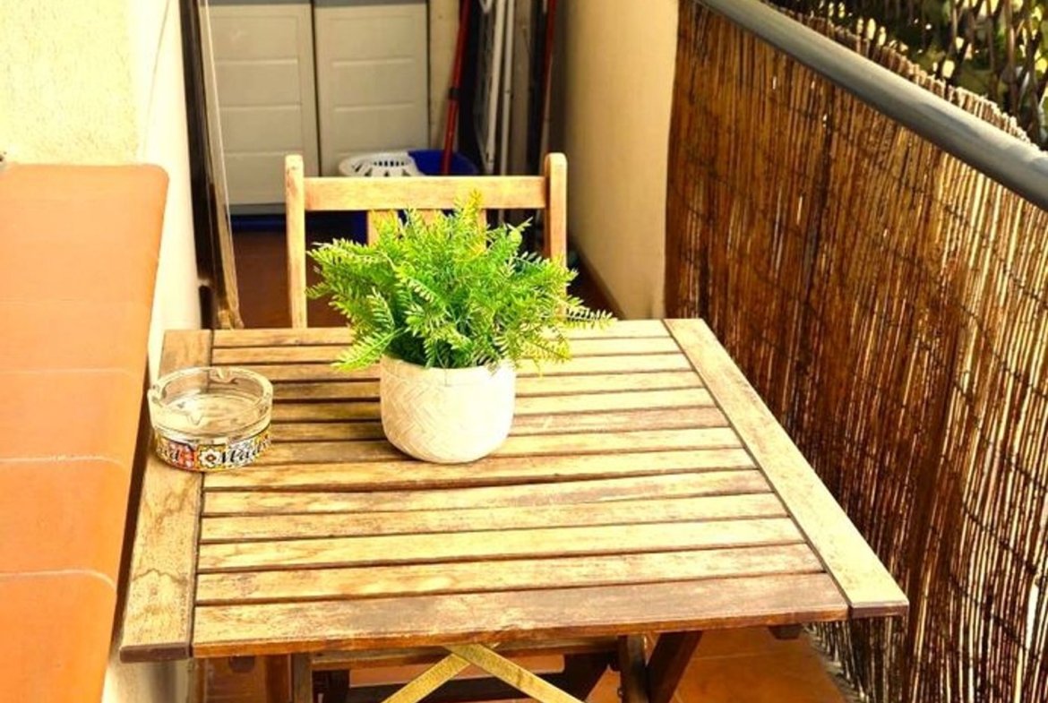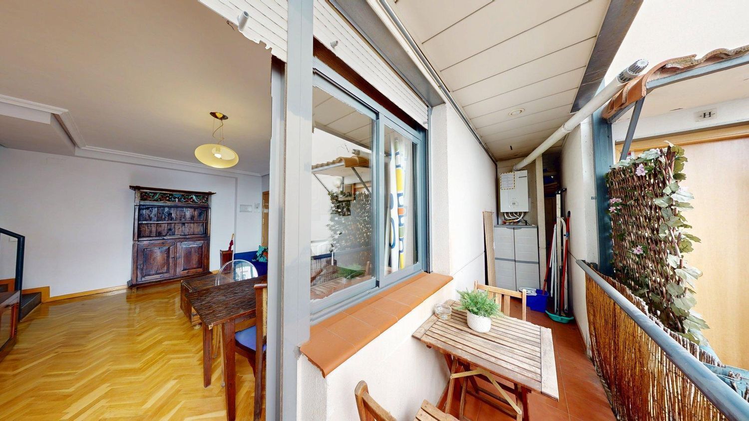 En planta superior se encuentran dos dormitorios dobles, 3 armarios empotrados, un baño completo con bañera y un recibidor. En planta inferior (entrada) se ubica el salón comedor, un estudio/tercer dormitorio, la cocina completamente equipada, un baño con ducha y una terraza. Aire acondicionado en todas las habitaciones.