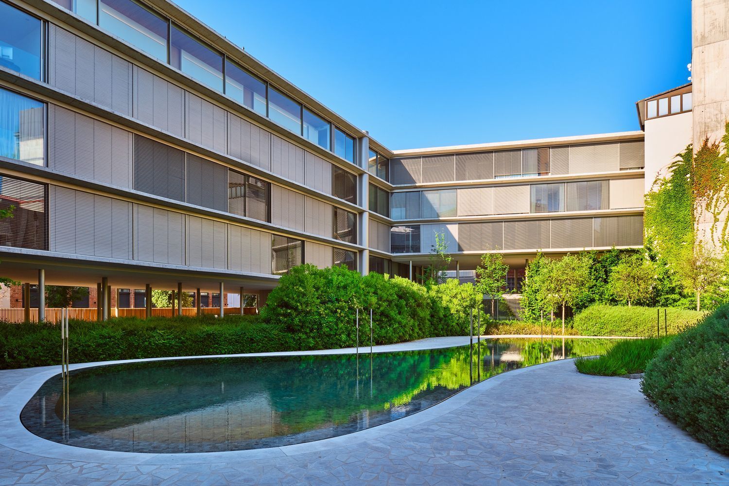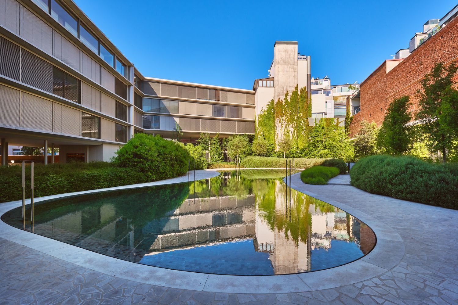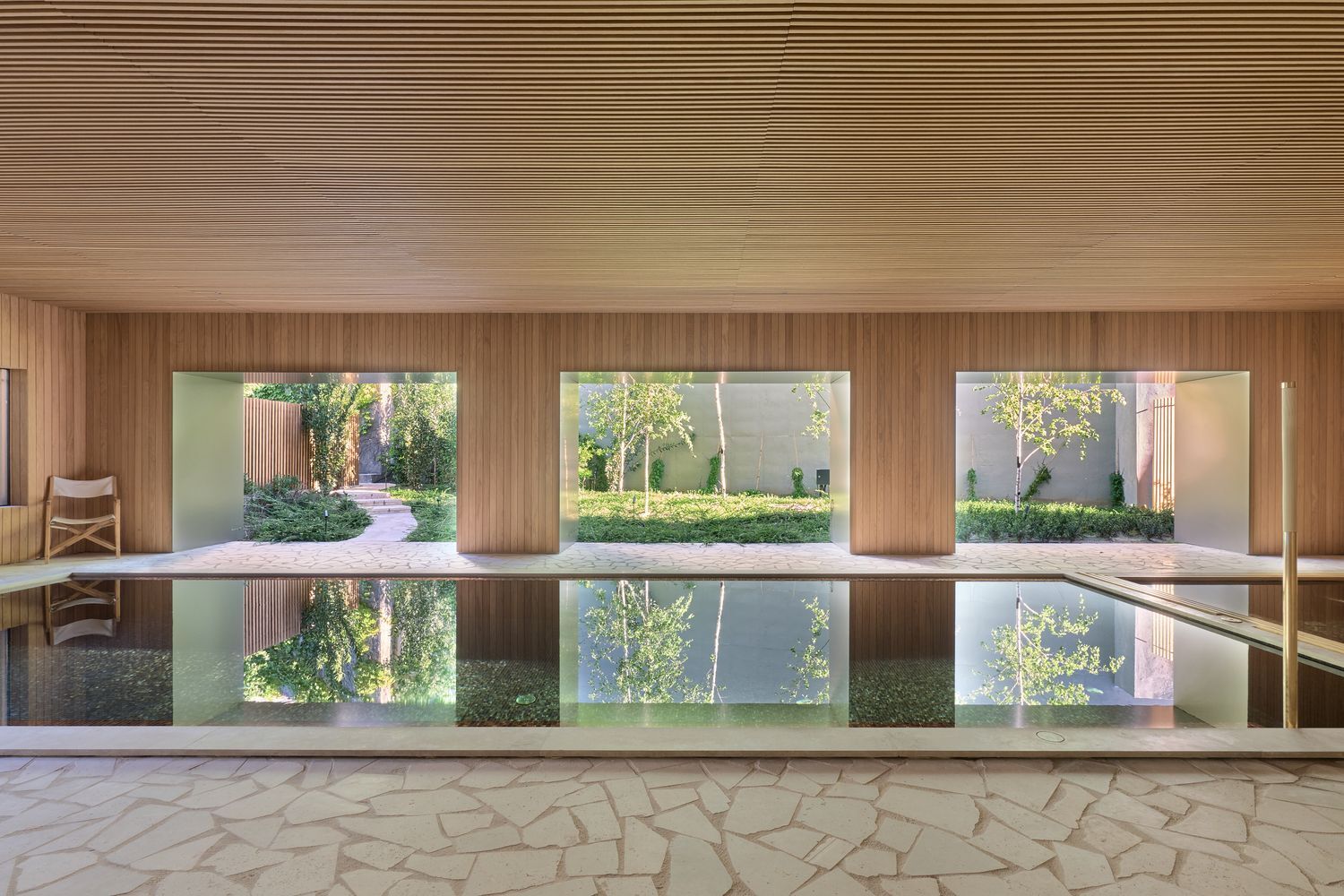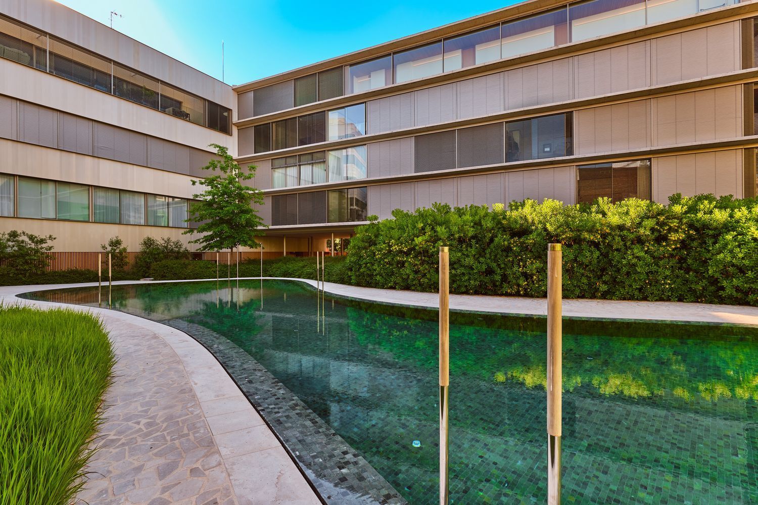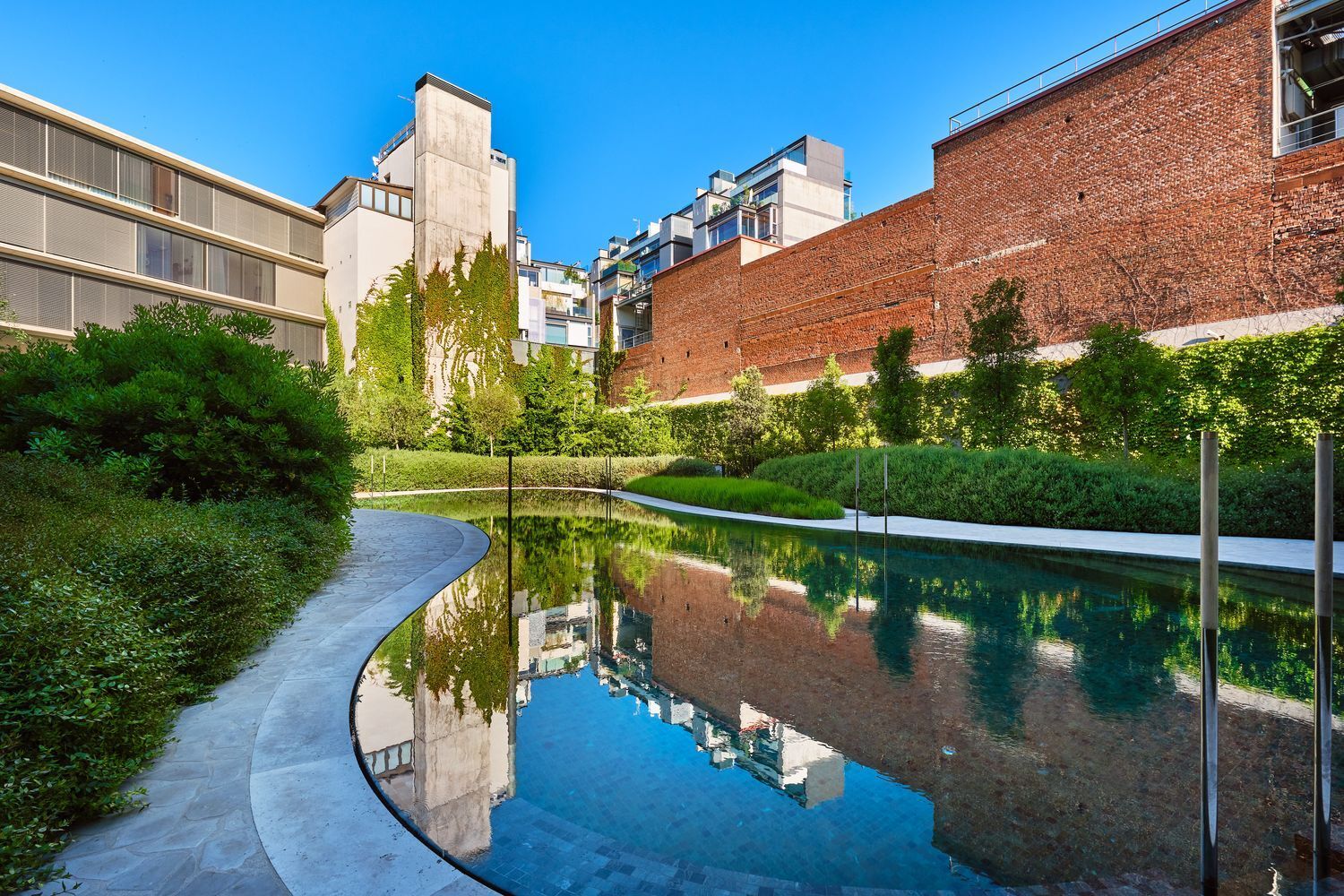 Gran piscina exterior integrada en el jardín.